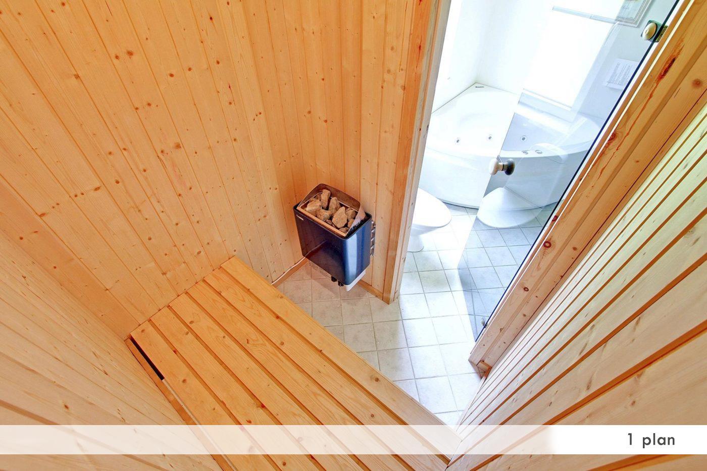 Bathroom with a jacuzzi, sauna and floor heating. Washing machine, tumble dryer, vacuum cleaner.