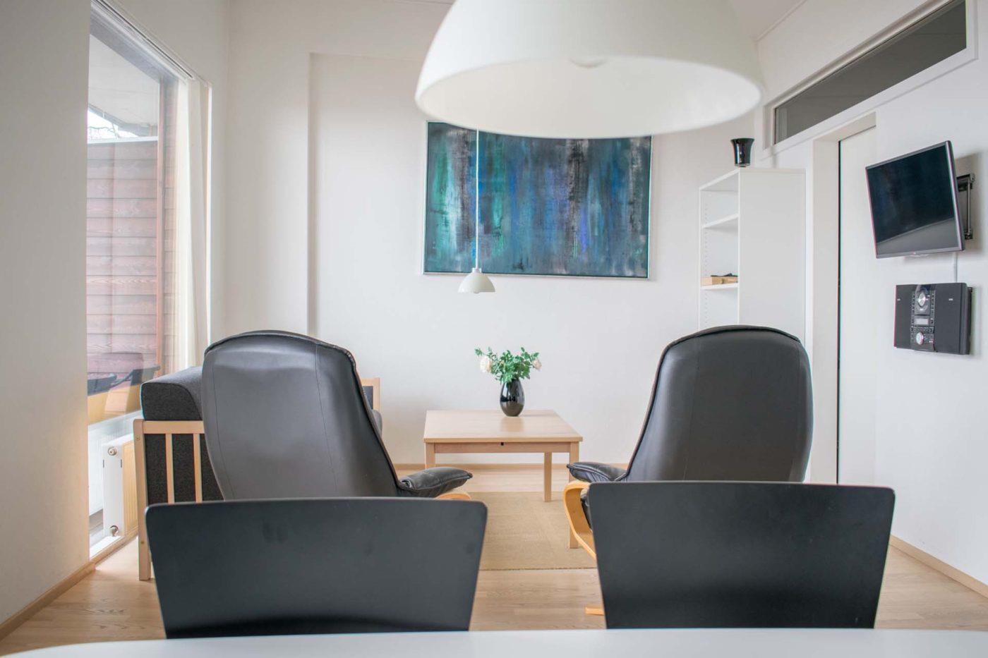 De ruime vakantiehuizen in Zweedse stijl zijn ongeveer 100 m² groot en kunnen zowel als gelijkvloerse als anderhalve verdieping worden gehuurd. Alle huizen hebben vier slaapkamers, een sauna, een spabad en een volledig uitgeruste keuken. De huizen hebben een houtkachel, barbecue-uitrusting en een terras/balkon met uitzicht op het water.