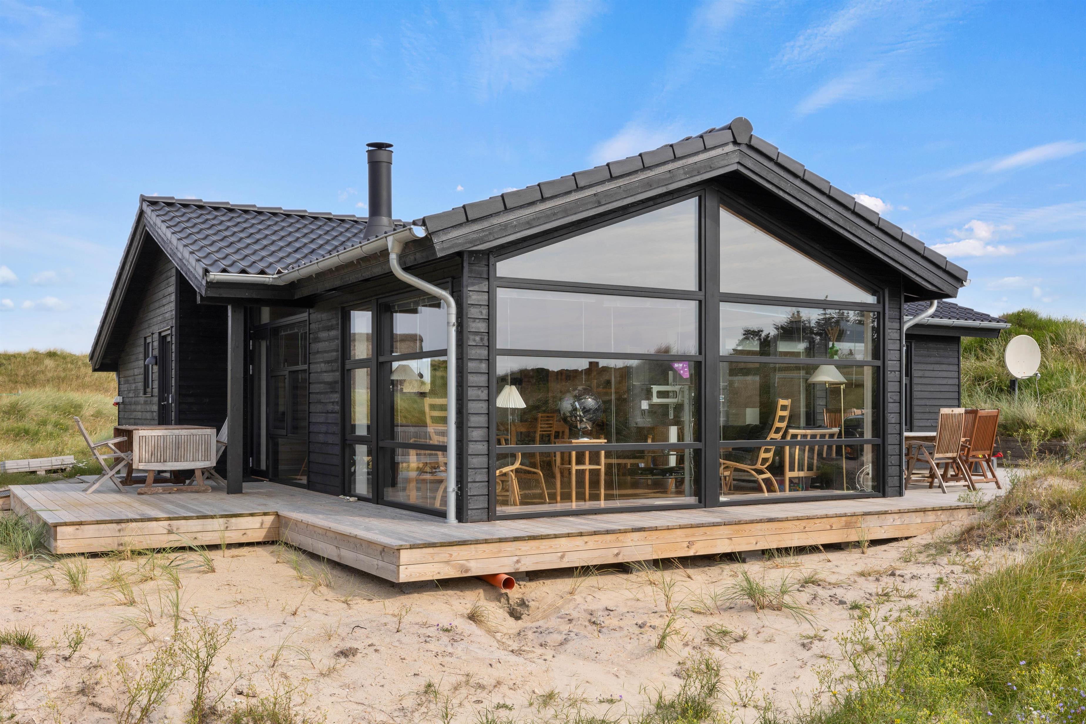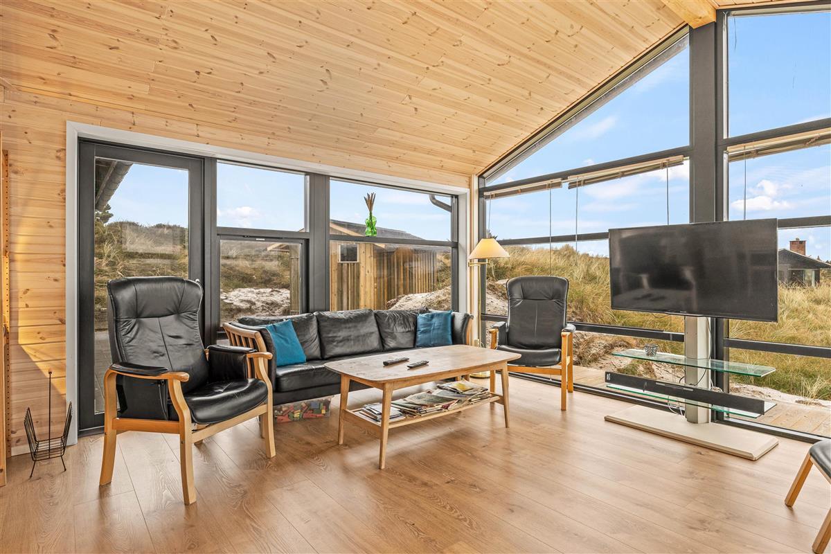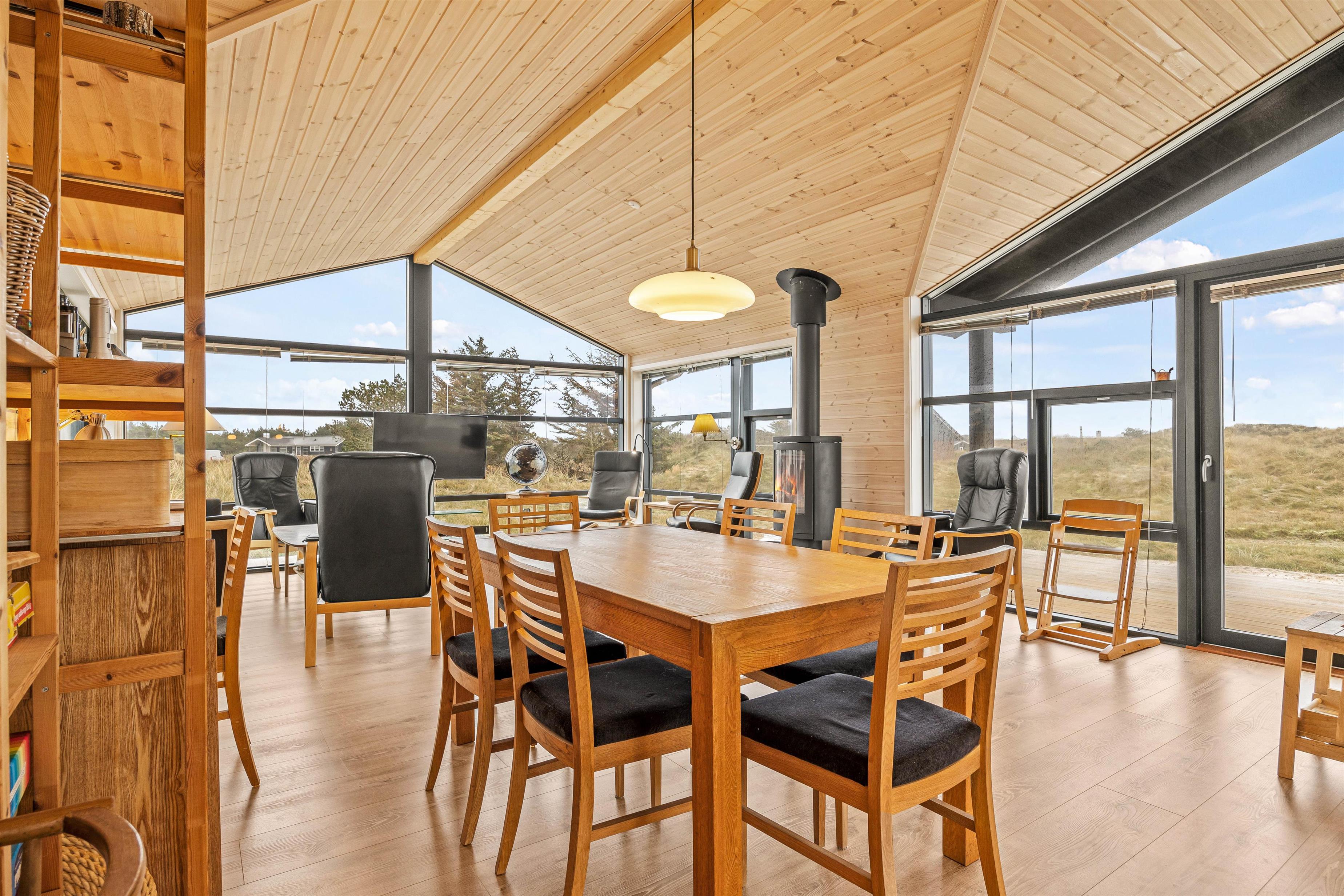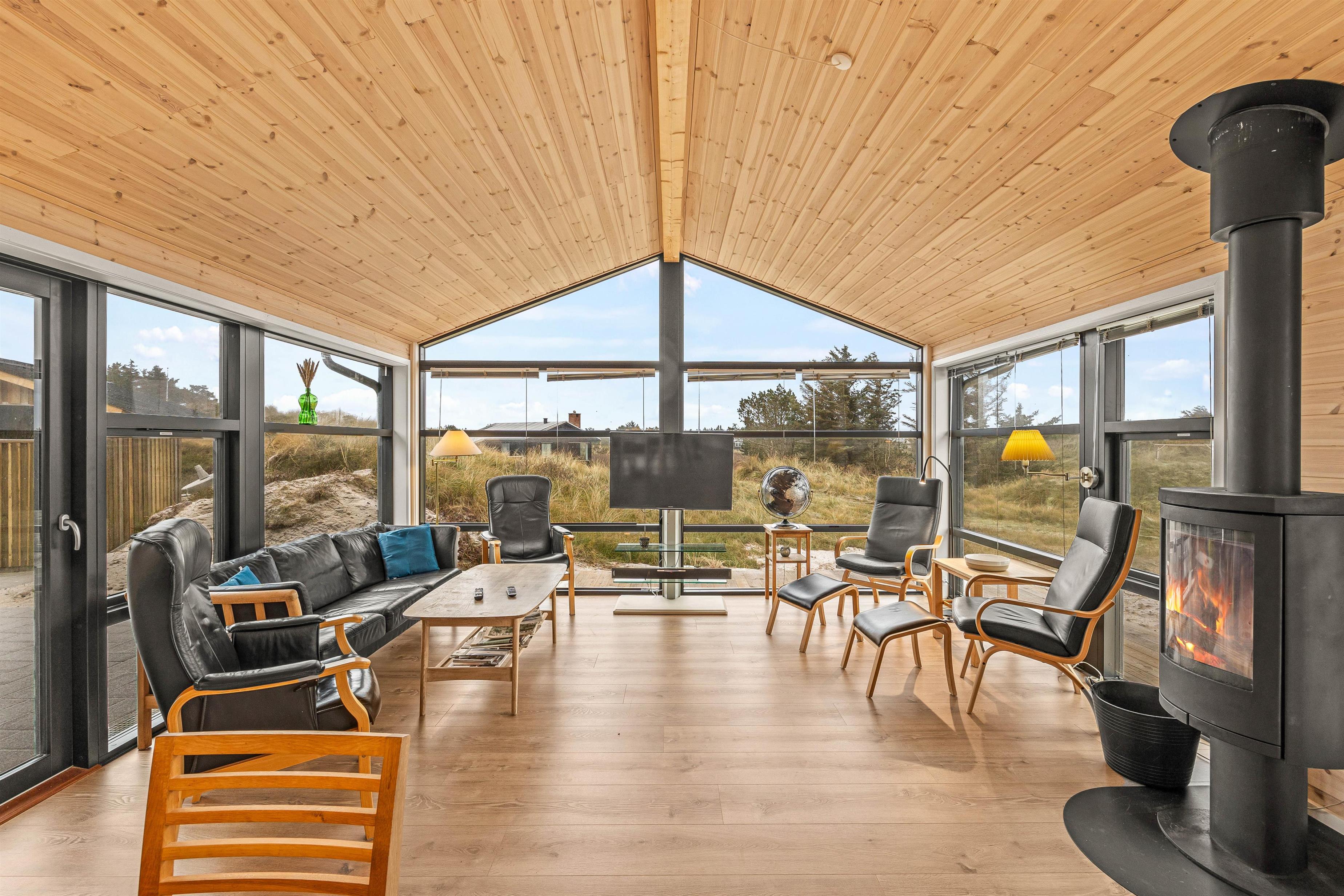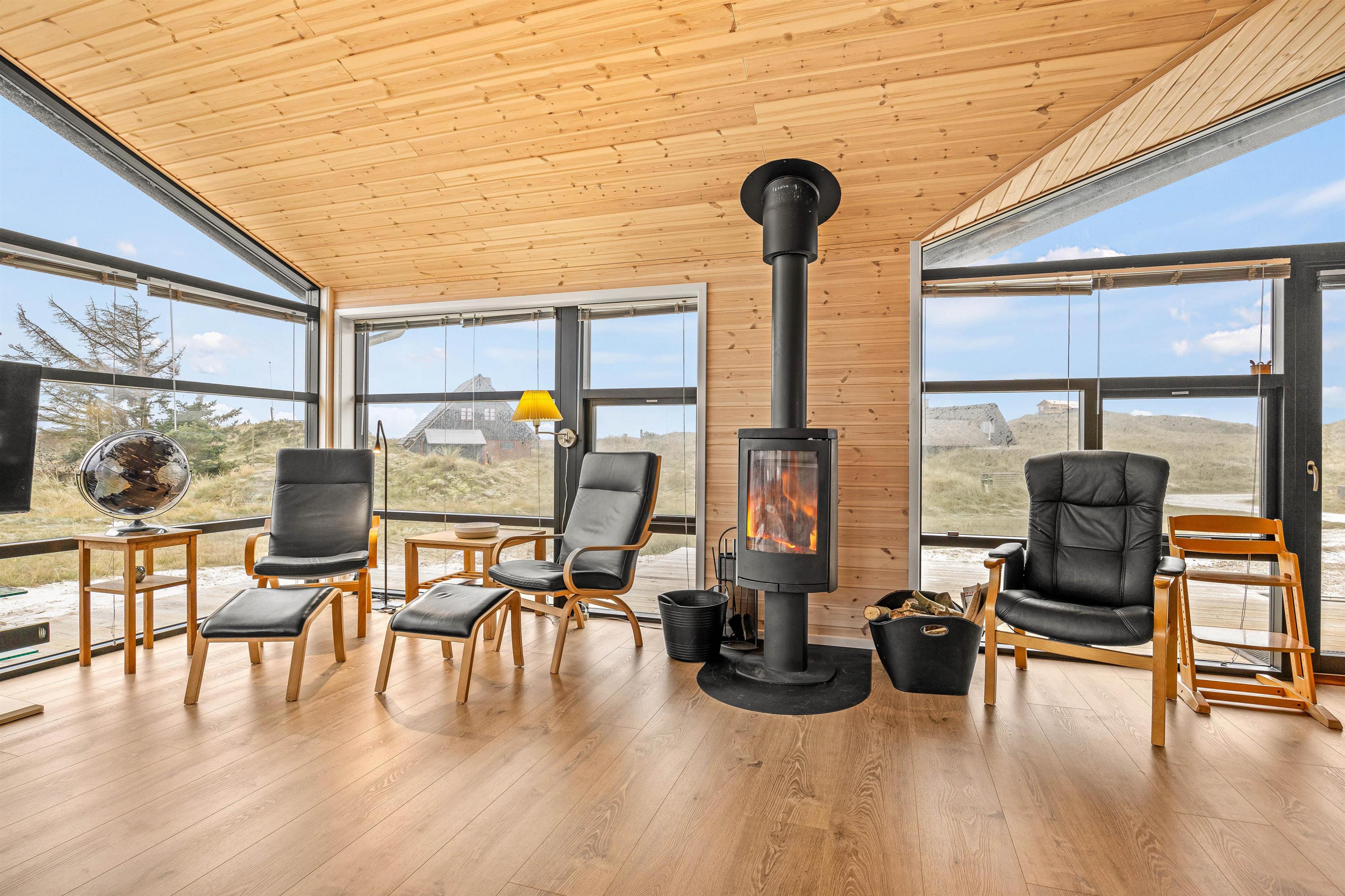 This cosy holiday home becomes a place you might never want to leave. The floor-to-ceiling windows create the feeling of being part of the Danish West Coast's natural environment. There's nothing more comfortable than sitting by the wood-burning stove watching wild nature outside during stormy, rainy weather. The open-plan living area, with its extensive glazing, feels almost like a conservatory. The abundant wood features and comfortable furniture create warmth and that distinctive Danish hygge feeling.
