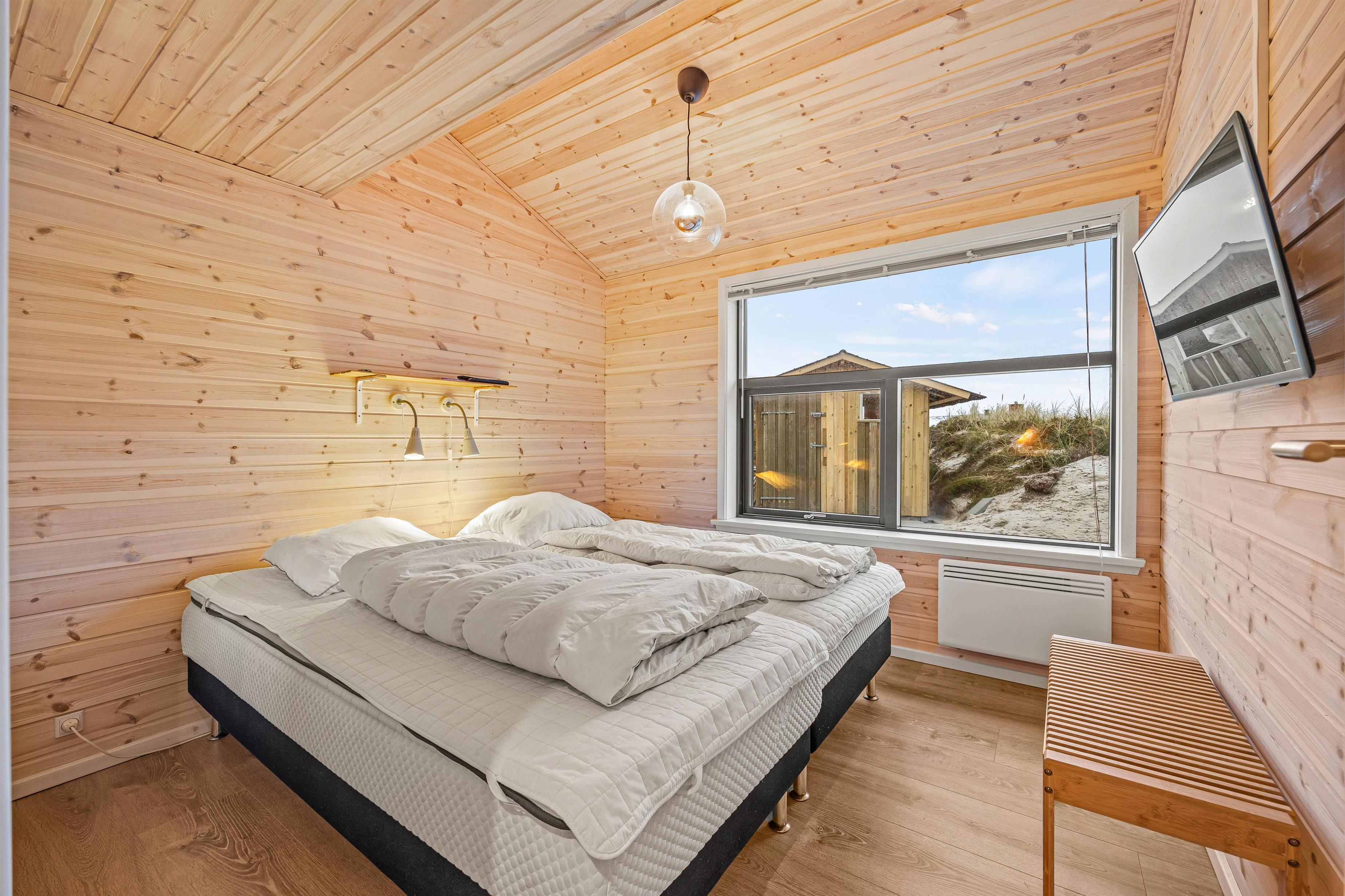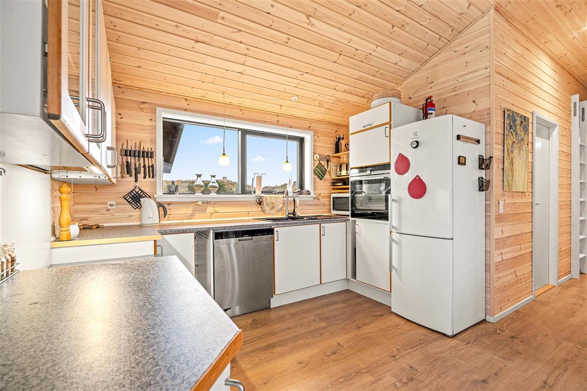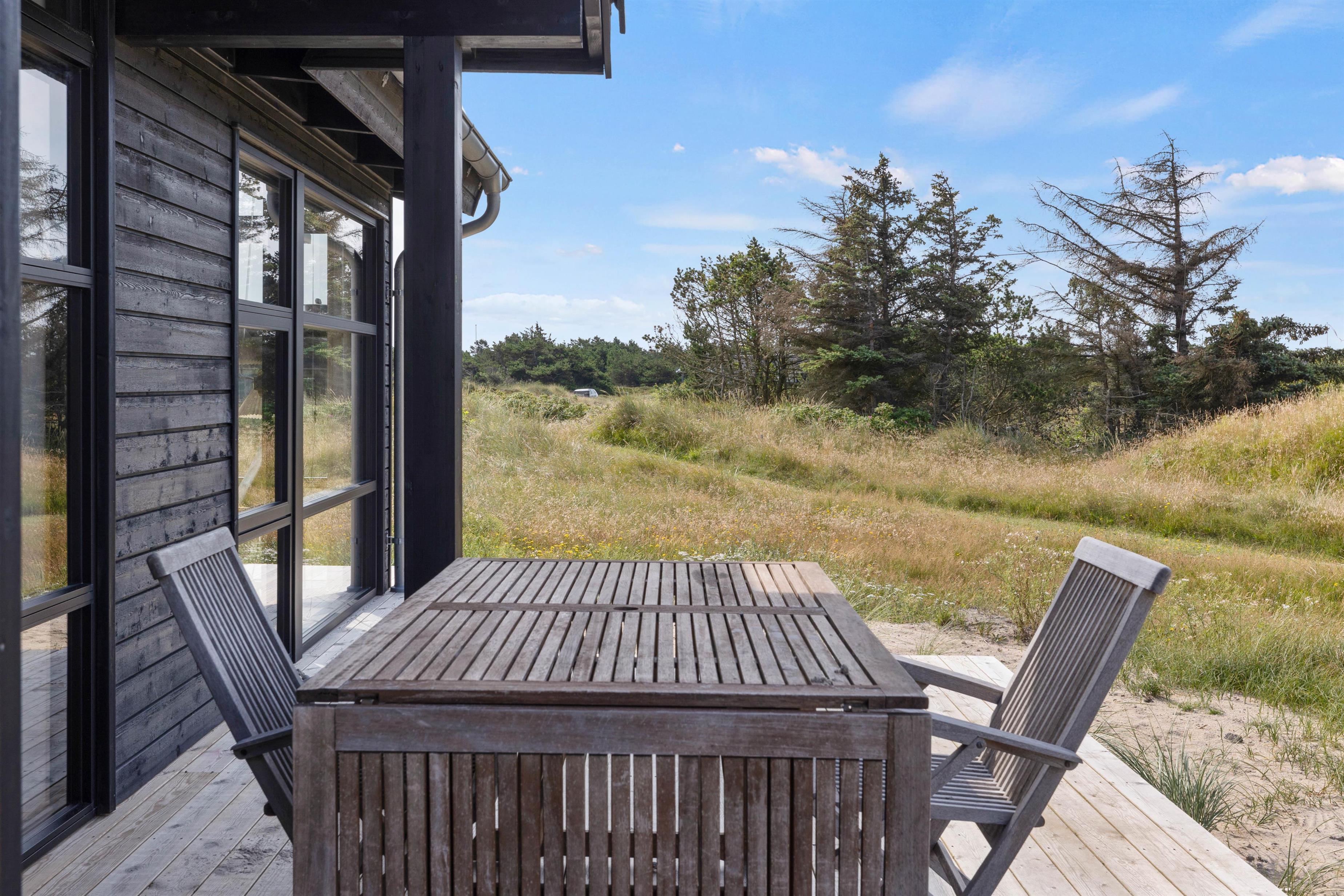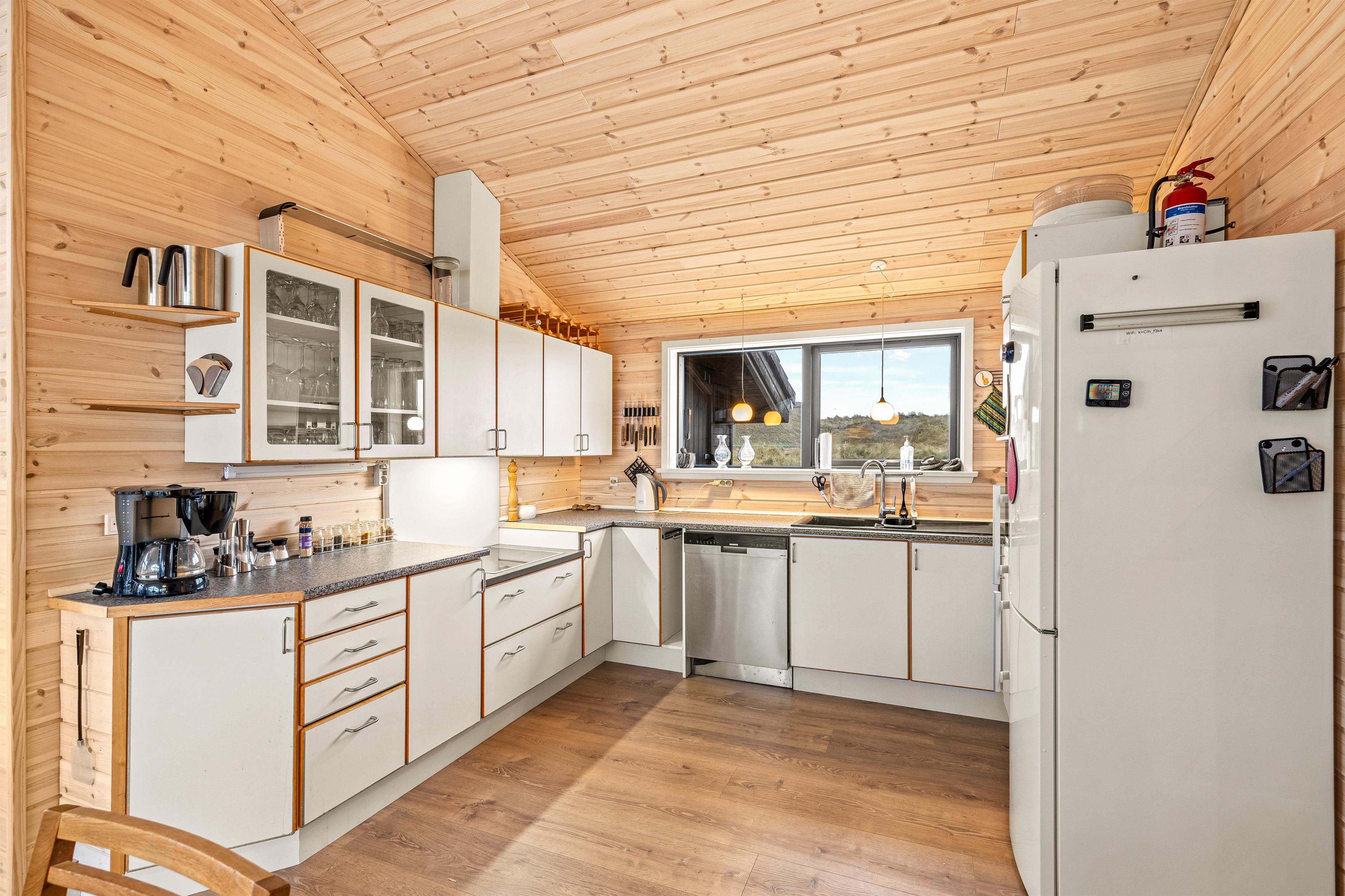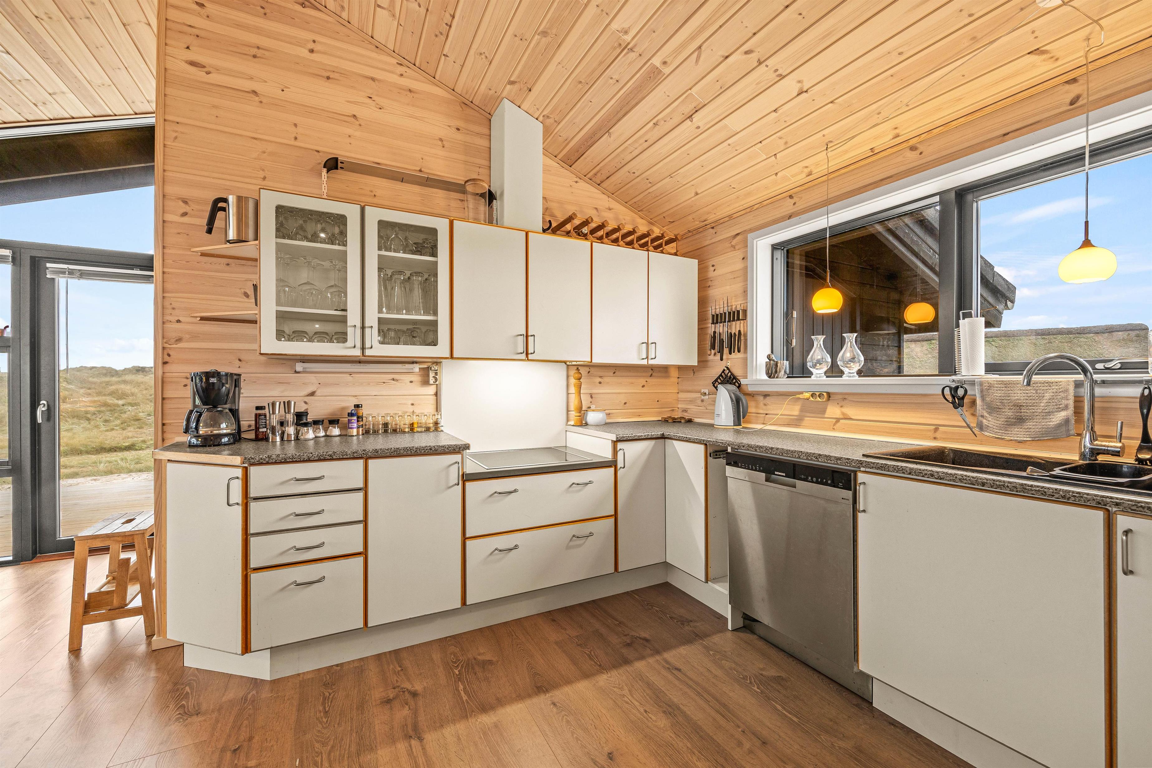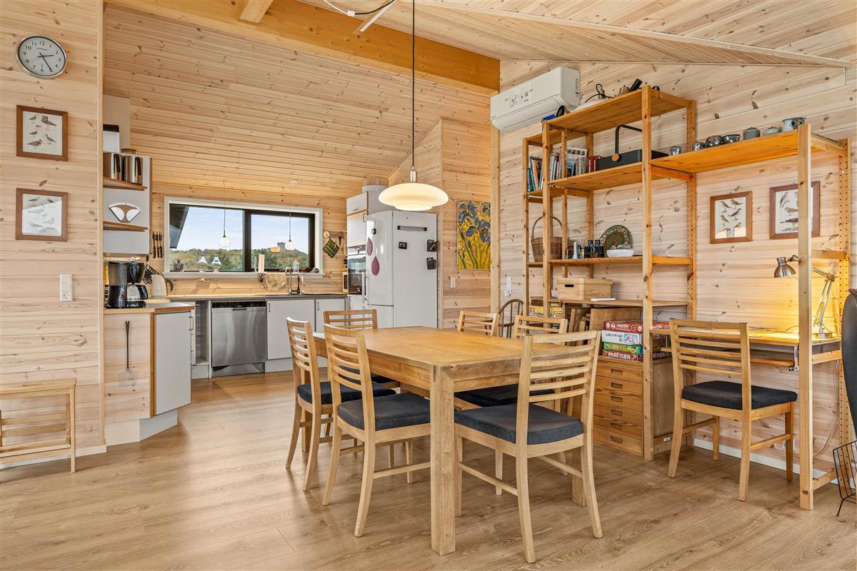 This cosy holiday home becomes a place you might never want to leave. The floor-to-ceiling windows create the feeling of being part of the Danish West Coast's natural environment. There's nothing more comfortable than sitting by the wood-burning stove watching wild nature outside during stormy, rainy weather. The open-plan living area, with its extensive glazing, feels almost like a conservatory. The abundant wood features and comfortable furniture create warmth and that distinctive Danish hygge feeling.