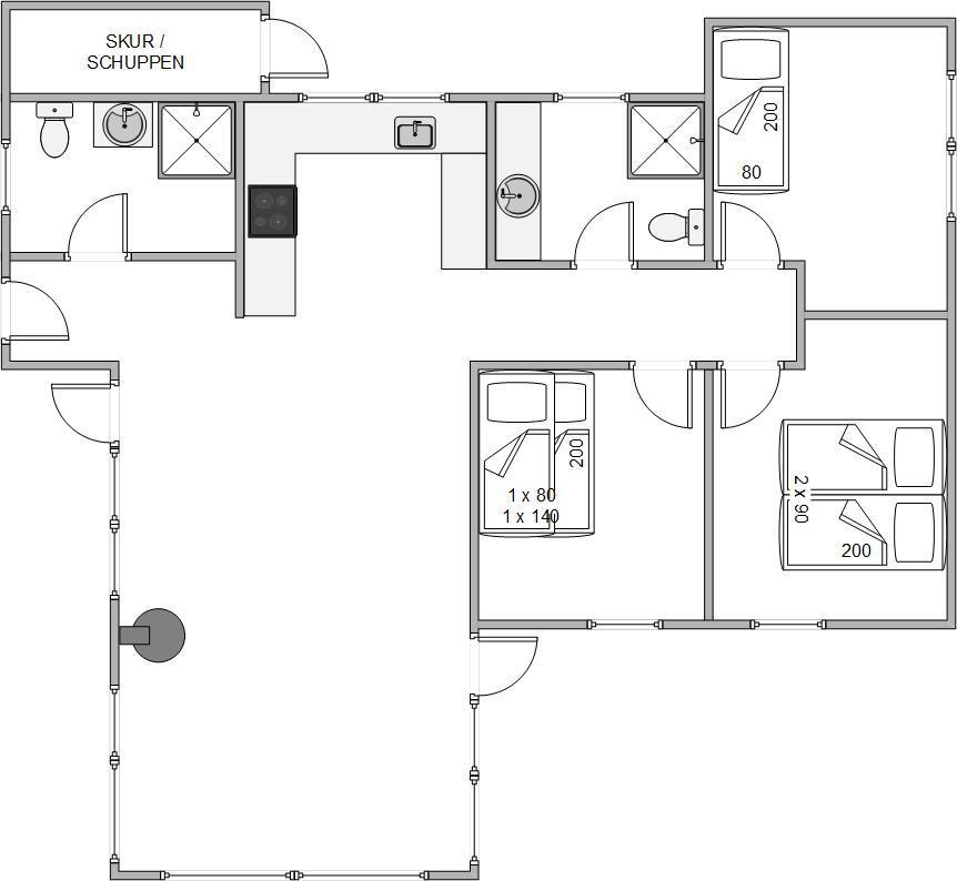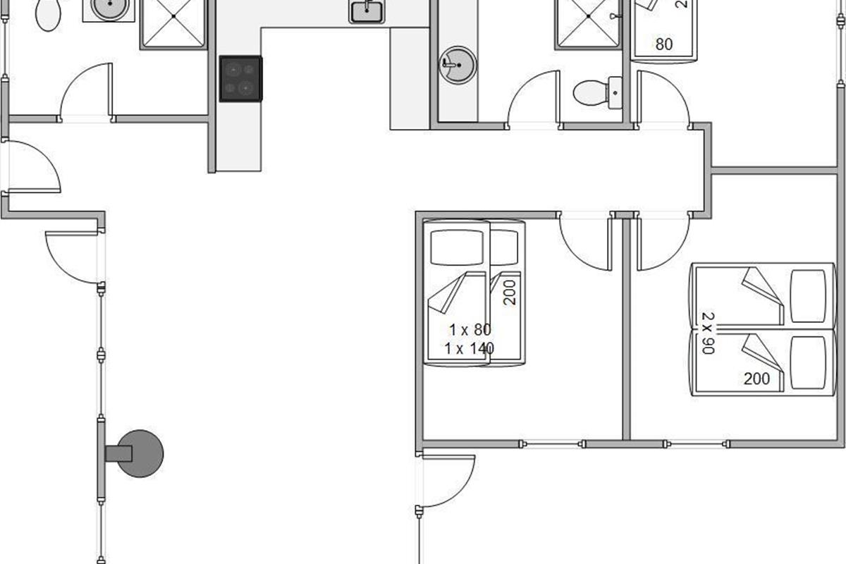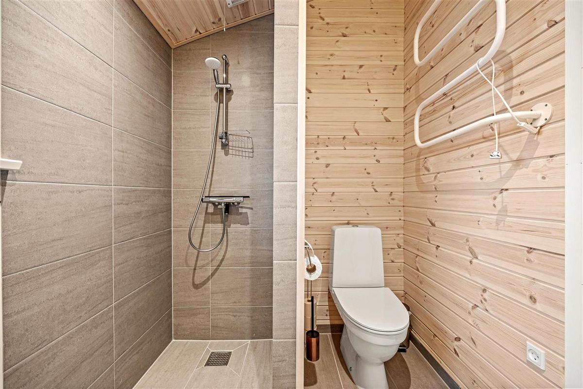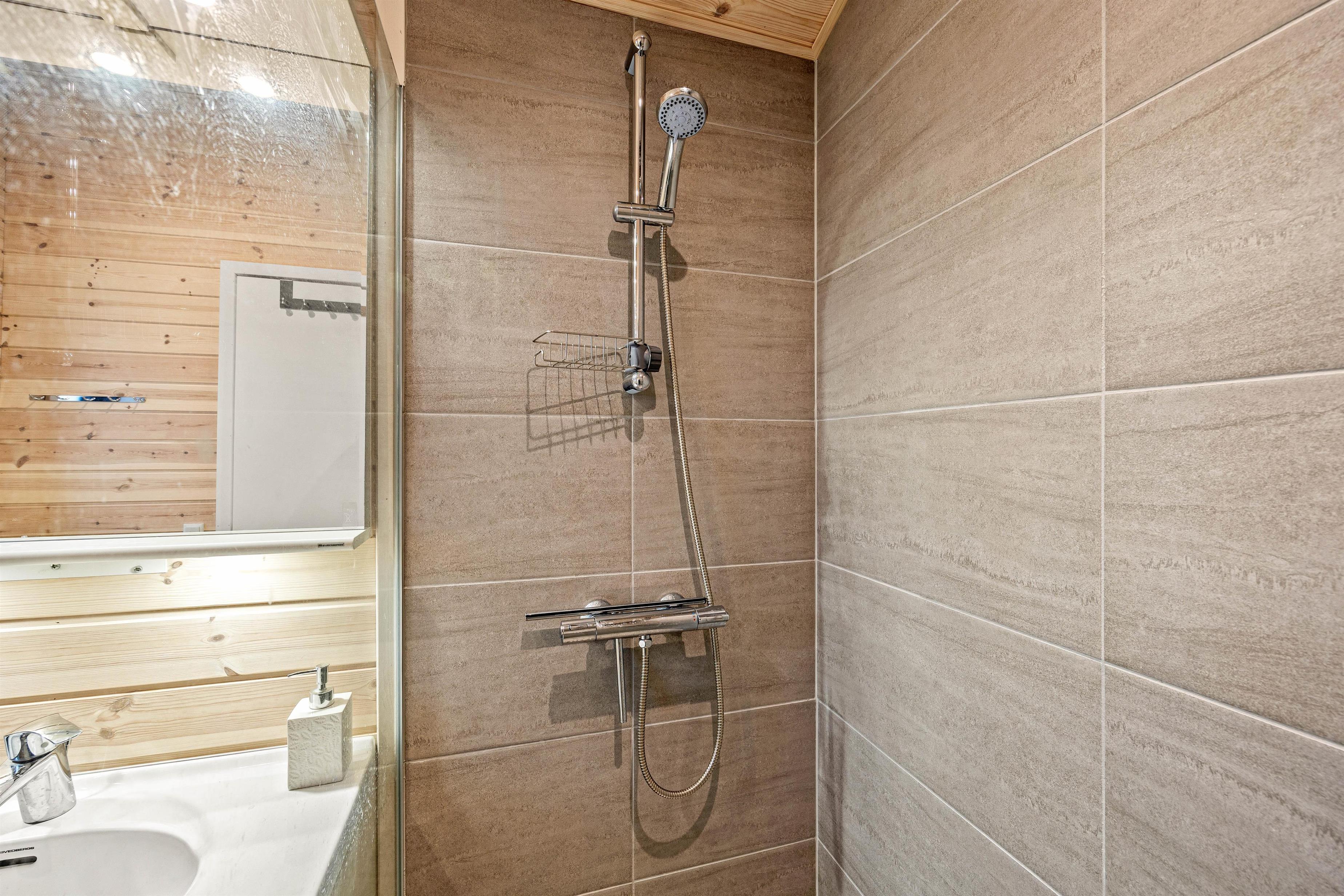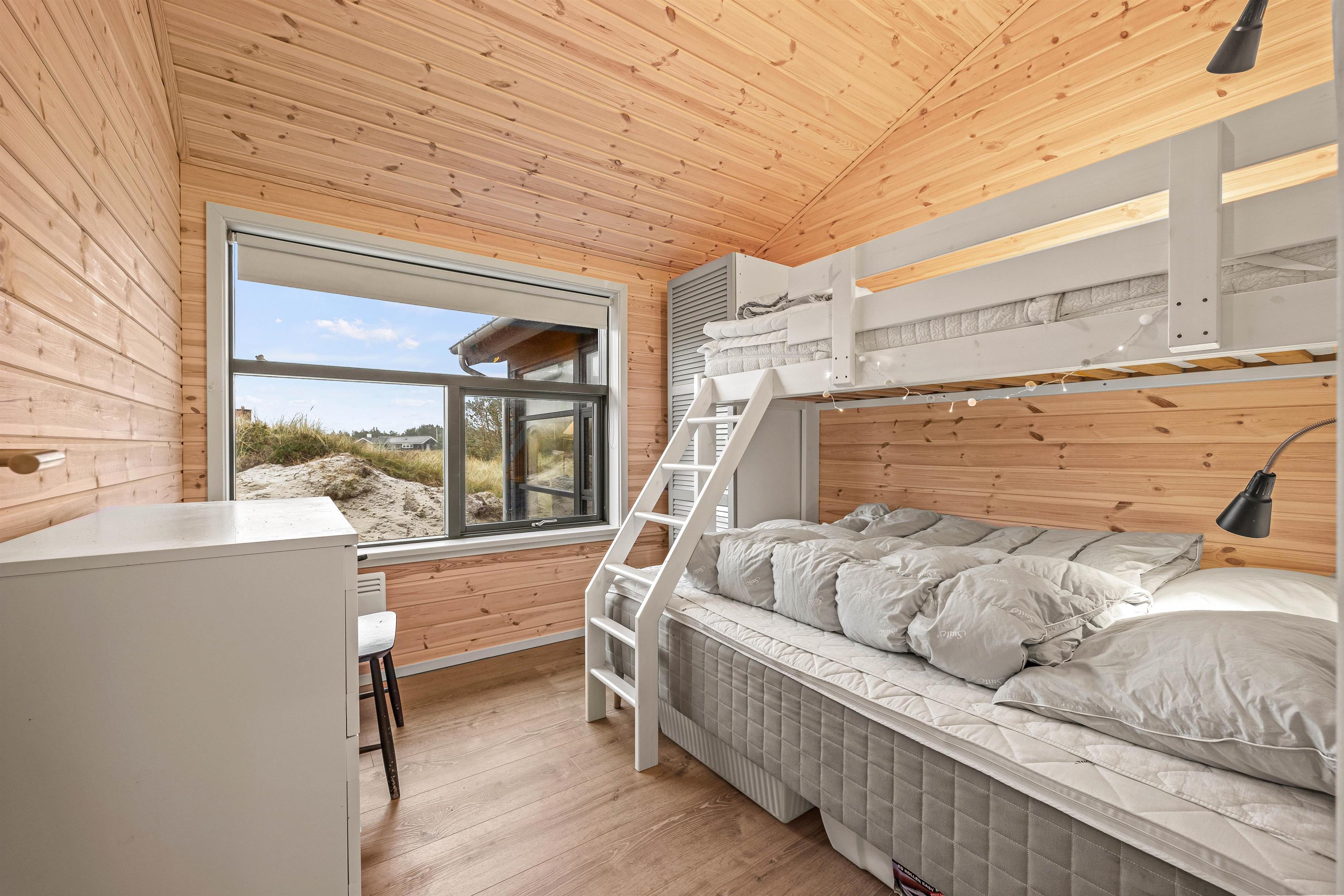 The holiday home has three bedrooms in total. One bedroom features a large double bed with TV, another has a single bed, and the final bedroom has an excellent children's bunk bed. The lower bunk is wider, providing space for two people to sleep. Both bathrooms are equipped with underfloor heating, ensuring no cold feet in the morning.