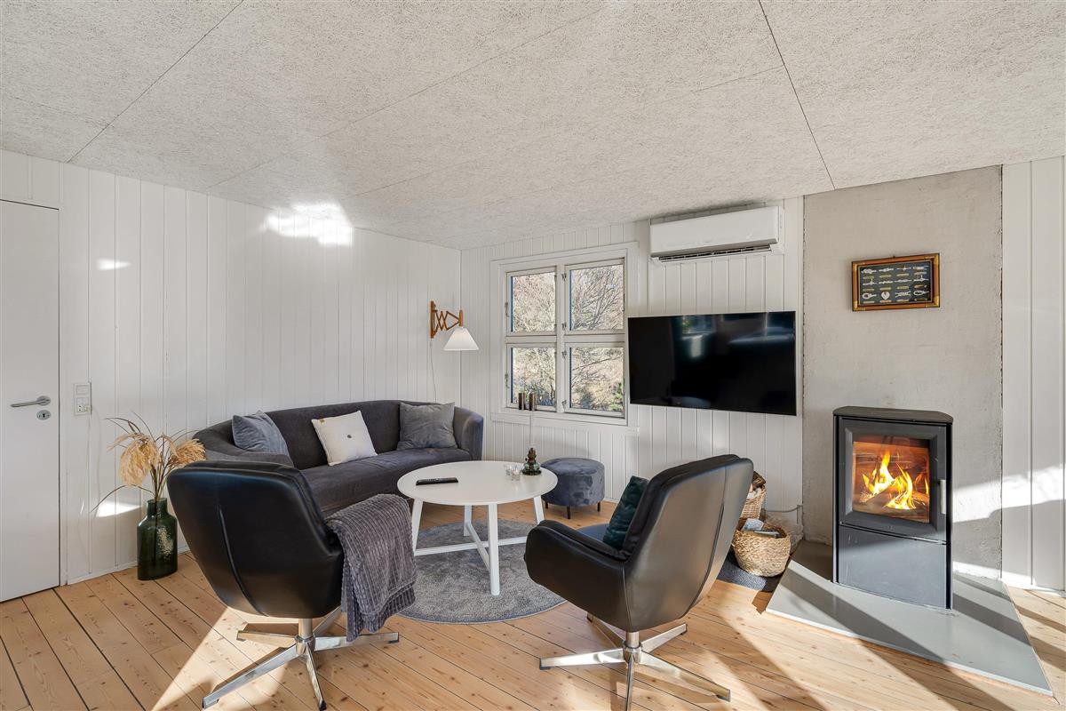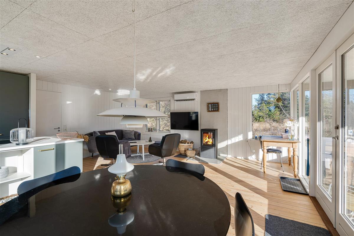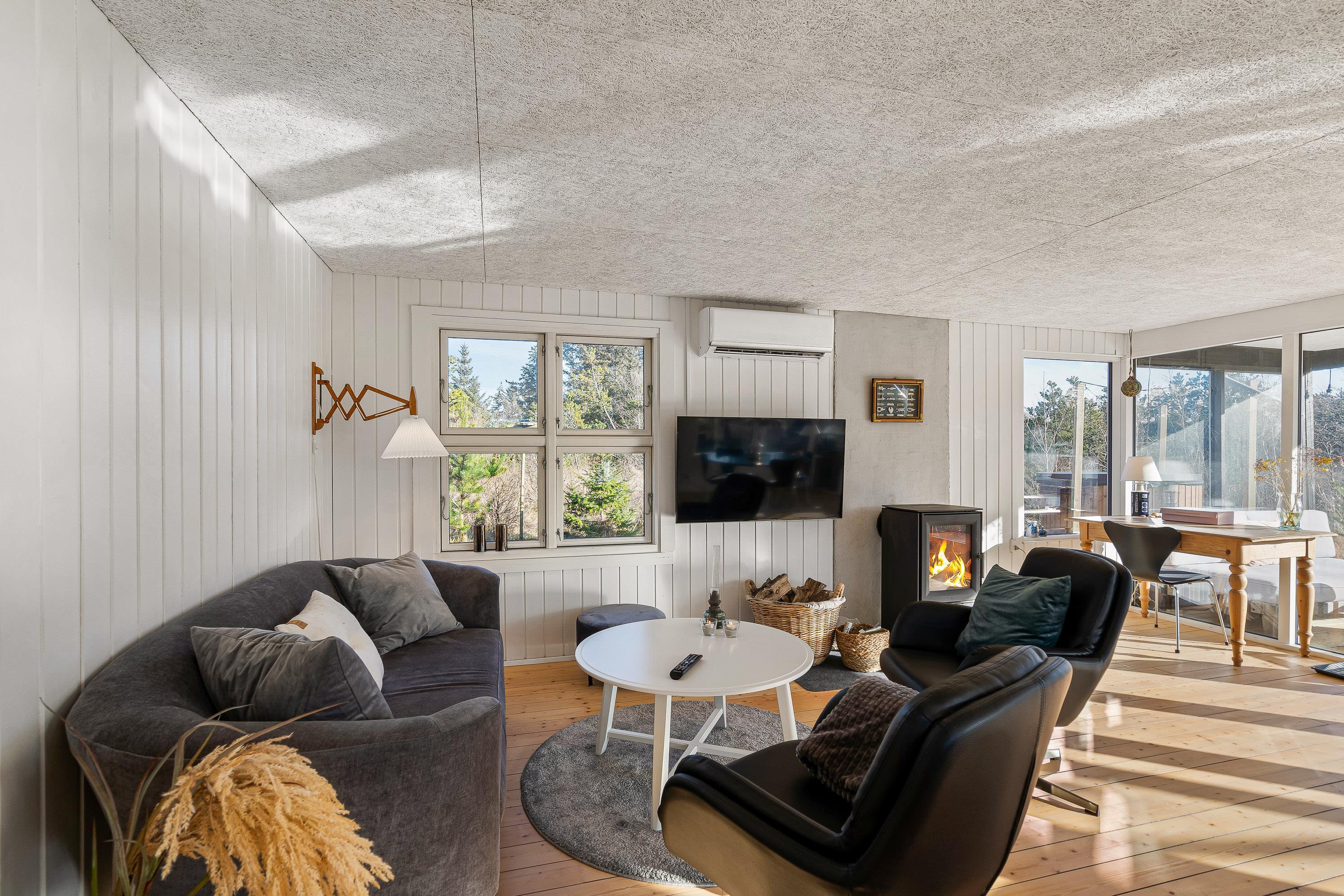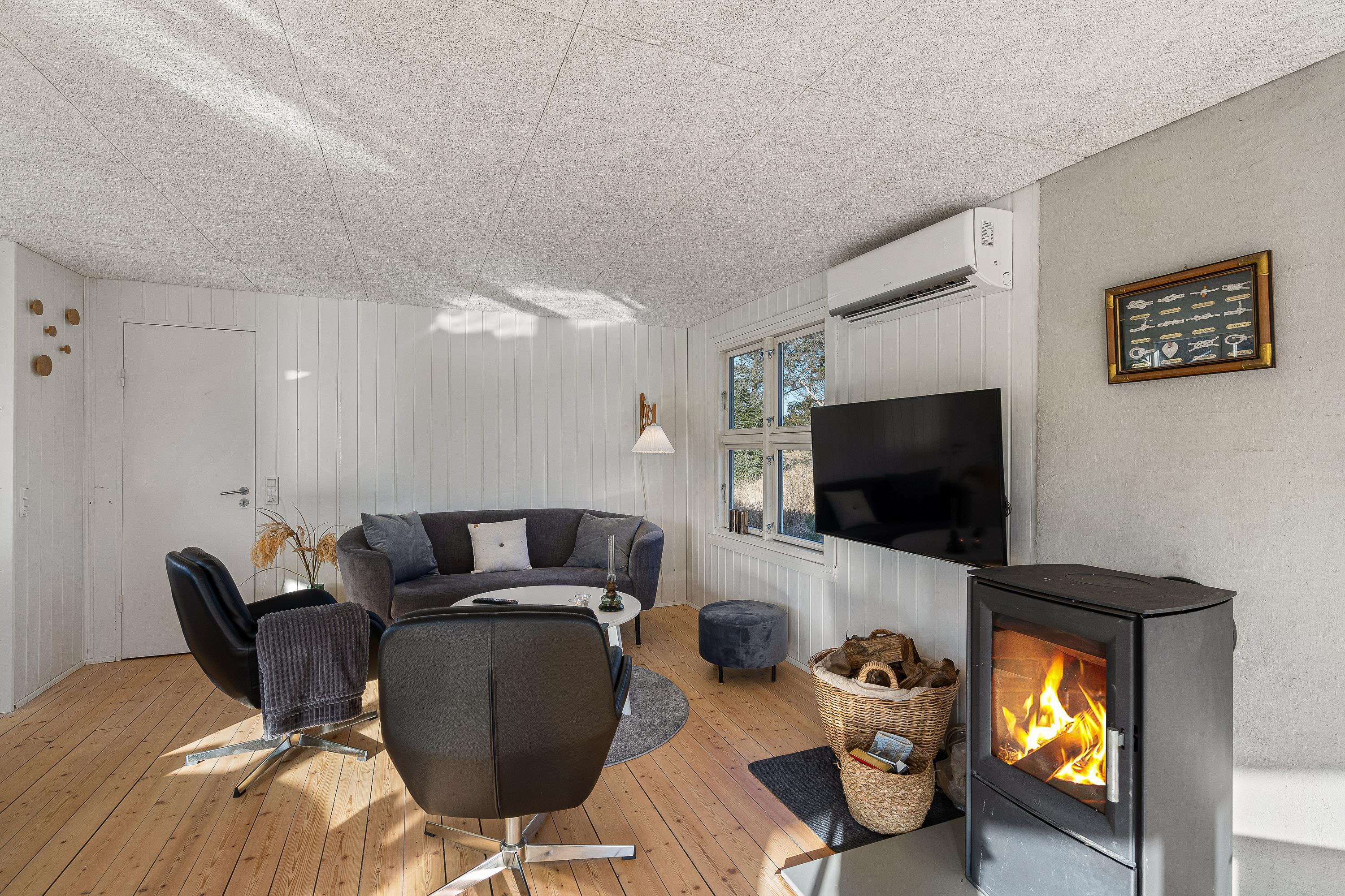 In the living area, a wood-burning stove provides warmth and creates a cosy holiday atmosphere. The holiday home also benefits from an energy-efficient heat pump, ensuring comfortable temperatures and good climate control throughout.