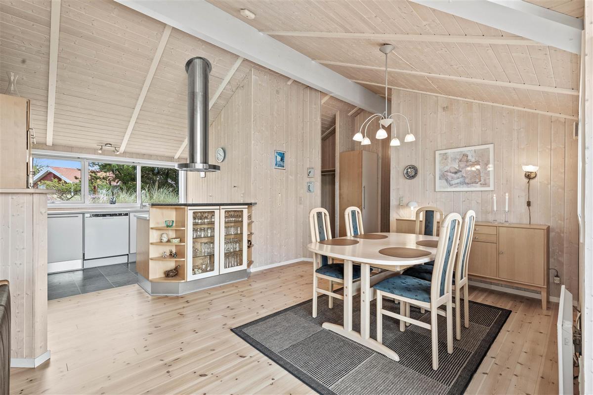 As soon as you enter this home on Lyngvej, you're greeted by a bright and welcoming environment. The wooden elements, combined with large glass windows in the living room, create a cosy holiday atmosphere, and you'll immediately feel at home amongst the personal and detailed interior.