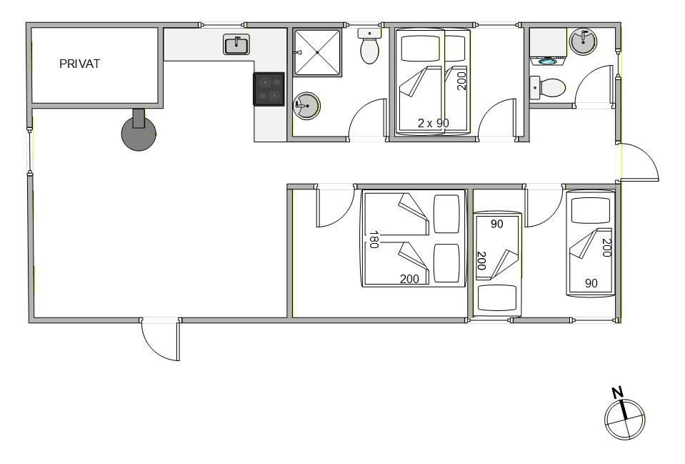 Die Einrichtung umfasst 3 Schlafzimmer mit großen gemütlichen Betten die Einzelbetten sind 90 x 200 cm und das Doppeltbetten ist 180 x 200 cm groß. Hier findet jeder einen ruhigen Platz zum Schlafen. Das Ferienhaus verfügt außerdem über ein funktionales Badezimmer, das günstig gelegen ist, sodass es für alle Personen leicht zugänglich ist, auch eine Gästetoilette mit einer Waschmaschine findet ihr im Haus. Im Wohnzimmer sorgen die großen Fenster für viel natürliches Licht, hier findet ihr auch 2 bequeme Sofas und einen Sessel, wo ihr euch am Ende des Tages entspannen könnt. Das Smart-TV mit Satellitenschüssel Anschuss bietet euch eine große Auswahl an Deutschen Programmen. Die Rasenfläche ist perfekt für Ballspiele und andere Aktivitäten für die kleinsten Gäste, während die Terrasse zu gemütlichen Grillabenden in den hellen Sommernächten einlädt.