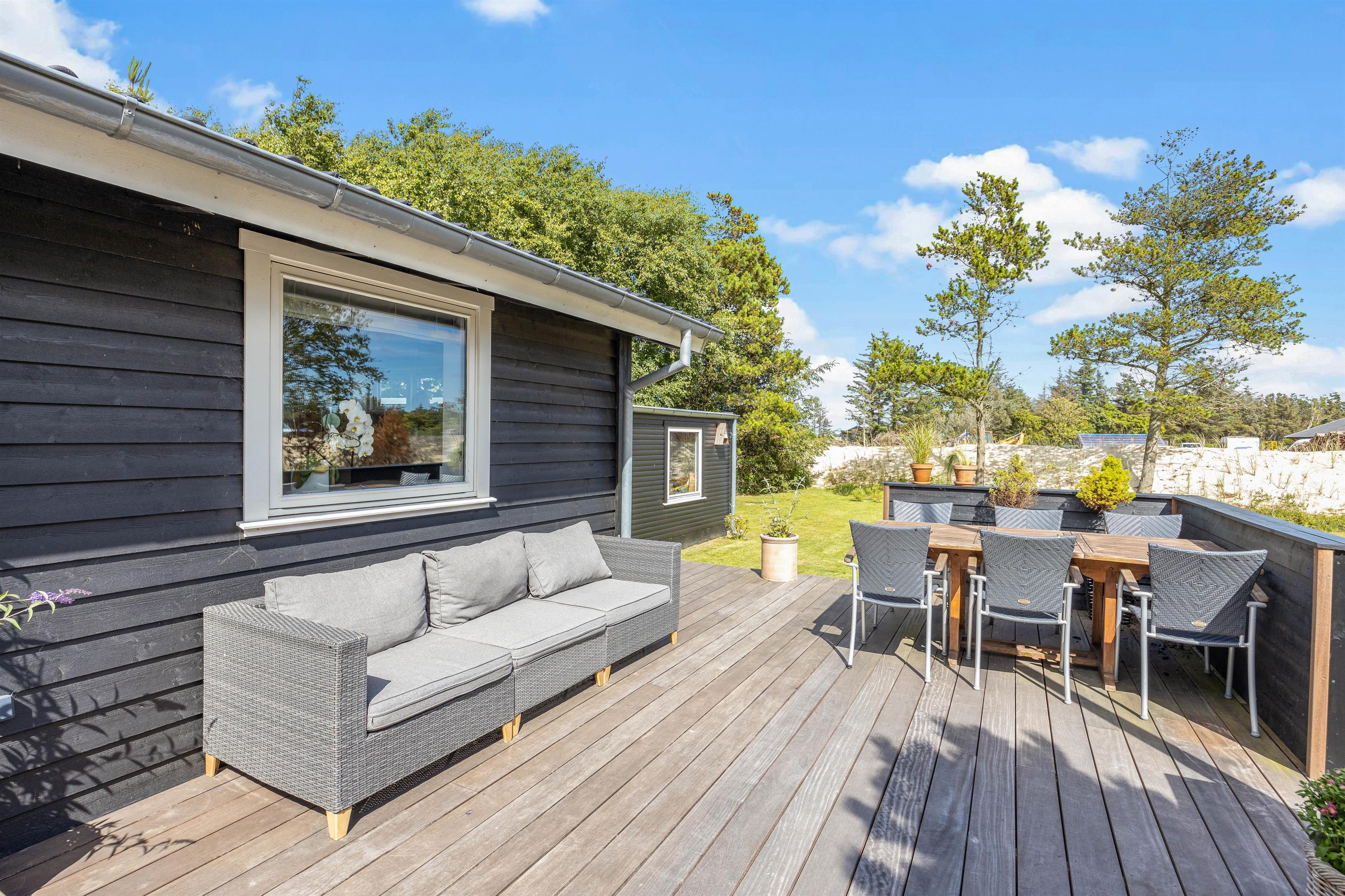 Just behind the dunes in the peaceful and idyllic holiday destination of Grærup Strand, you'll find this cosy holiday home, perfect for a small family looking for a relaxing break. Renovated in 2021, the holiday home has been furnished with meticulous attention to detail both inside and out. It sits on a sheltered natural plot featuring a large wooden terrace with multiple comfortable seating areas for relaxation.