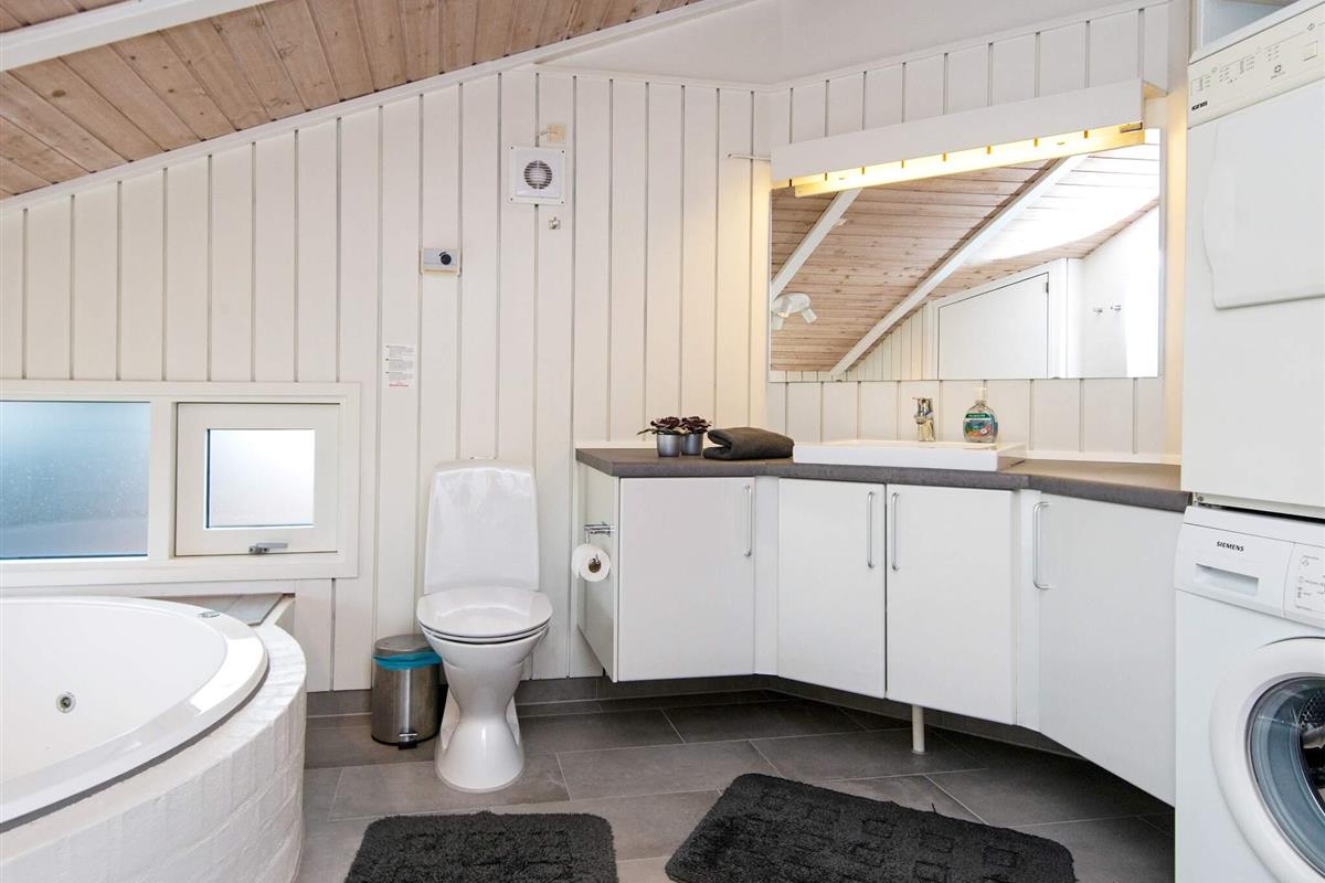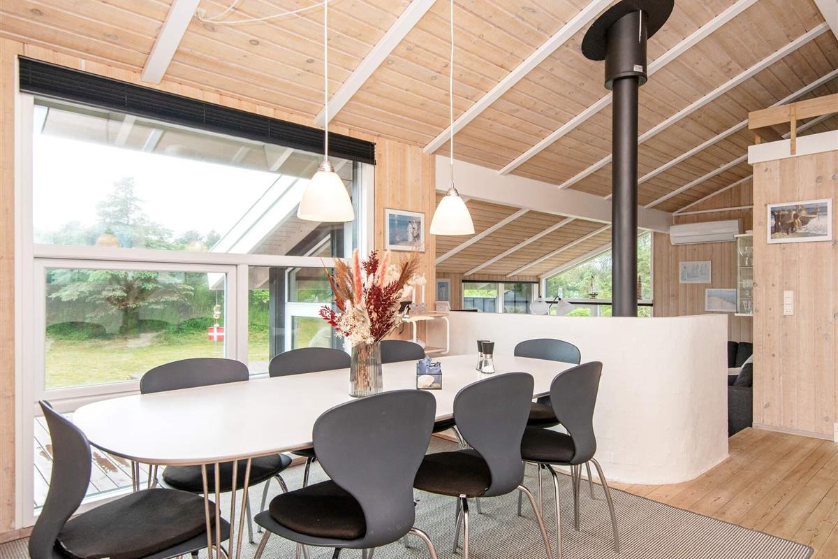 In einem der beiden Badezimmer des Hauses stehen sowohl eine Sauna als auch ein großer, runder Whirlpool für Erholung und Badepaß bereit. Außerdem offener Küchen-/Wohnbereich für das Familienleben im Haus, mit Ess- und Sitzecke sowie Holzofen und klimafreundlicher Wärmepumpe. Von diesem Raum aus hat man direkten Zugang zur Terrasse. Das Haus hat insgesamt vier Schlafzimmer die gut verteilt liegen, sodass hier auch zwei befreundete Familien prima untergebracht werden können.