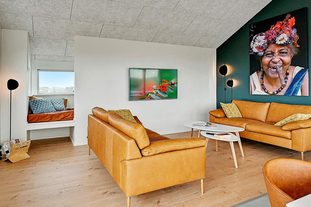 Im Inneren des Ferienhauses wurde nichts dem Zufall überlassen. Die modern und stilvoll gestaltete Einrichtung aus hochwertigen Materialien bietet den perfekten Rahmen für erholsame Urlaubstage am Meer hier in Grønhøj Strand. Wie der Aktivitätsraum wurden auch der Wohnbereich und alle fünf Schlafzimmer mit angenehmer Fußbodenheizung ausgestattet. Alle Schlafzimmer sind zudem mit hochwertigen Betten eingerichtet.