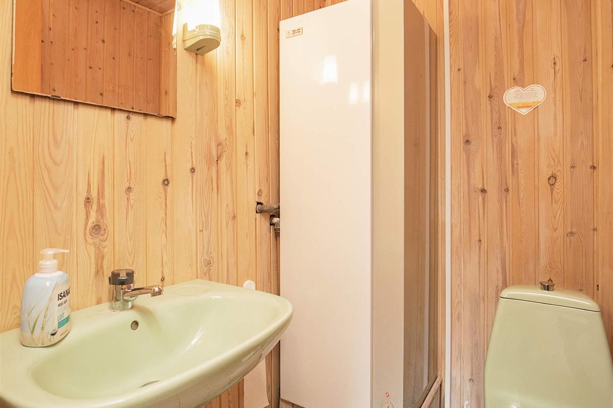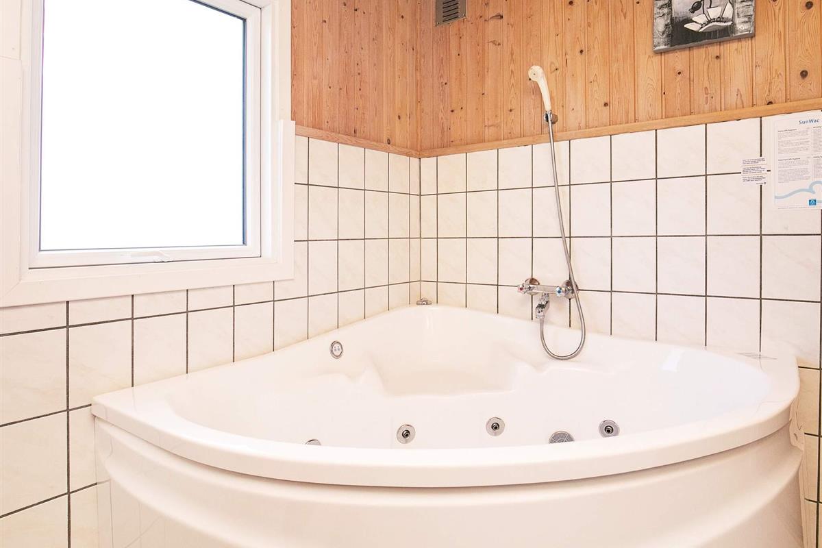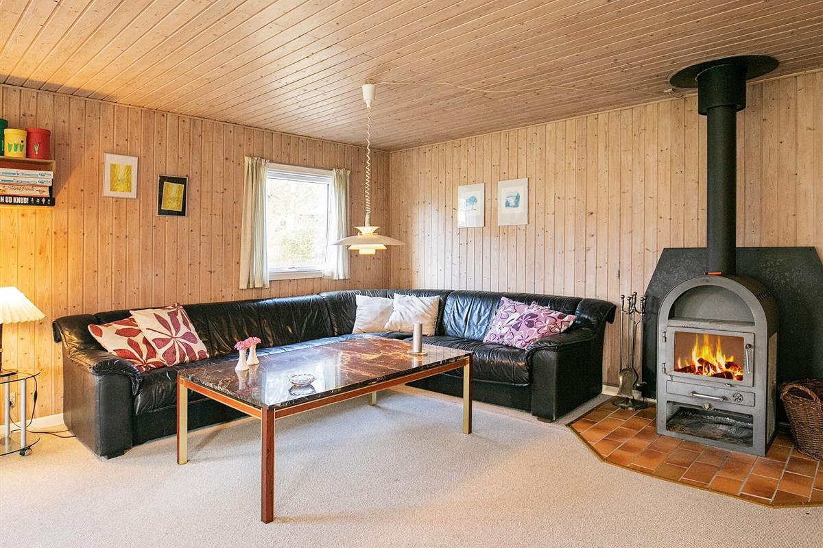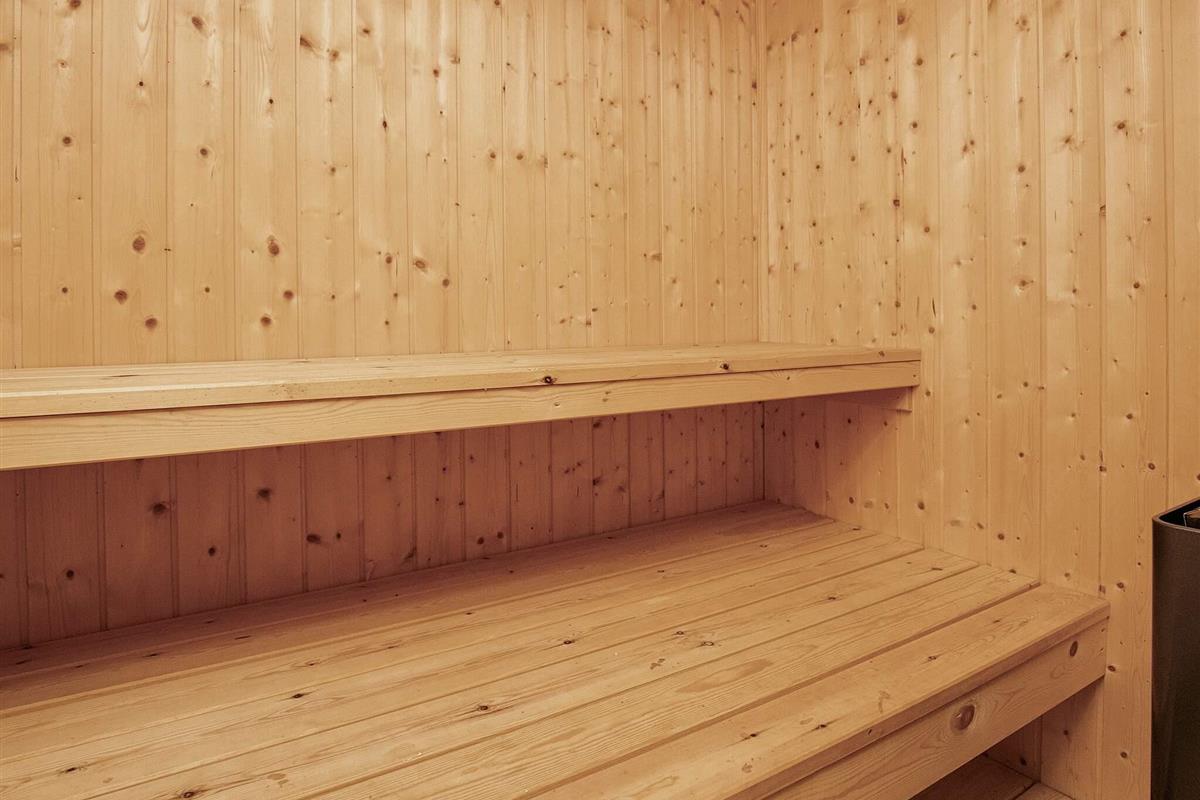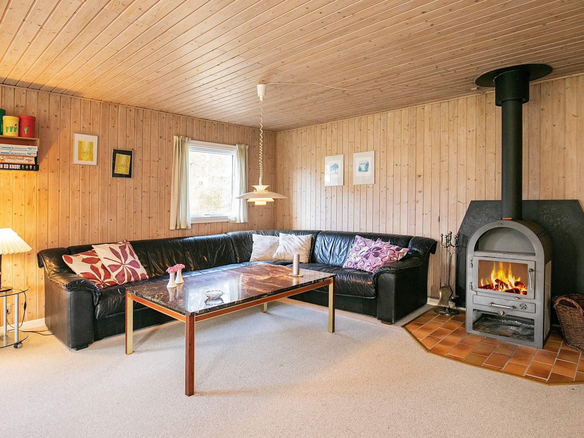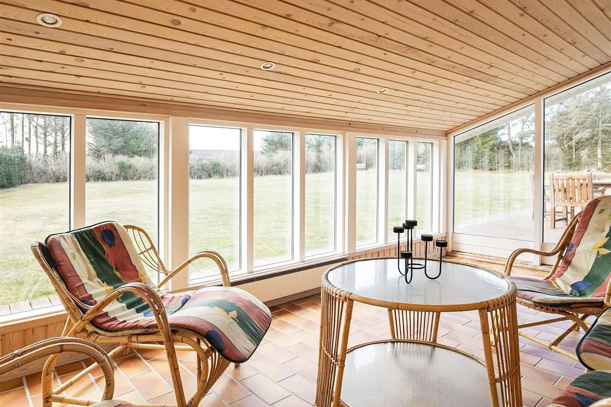 Im Inneren erwartet Sie ein offener Küchen-/Wohnbereich für das Familienleben mit Ess- und Sitzecke sowie Holzofen für wohlige Wärme an kühleren Abenden. Es gibt zudem zwei Badezimmer, beide mit angenehmer Fußbodenheizung, eines zudem mit Whirlpool und Zugang zur Sauna. Das ganze Haus verfügt über Fußbodenheizung und hat auch eine verglaste Veranda mit Ausblick ins Grüne und Zugang zur Terrasse. Ringsum das Ferienhaus findet man auf dem 2.500 m2 großen Rasengrunestück eine weitläufige Holzterrasse mit mehreren sonnigen Sitzgelegenheiten und eine große Rasenfläche für die Kinder, für die Schaukel und Fußballtor aufgestellt wurden.