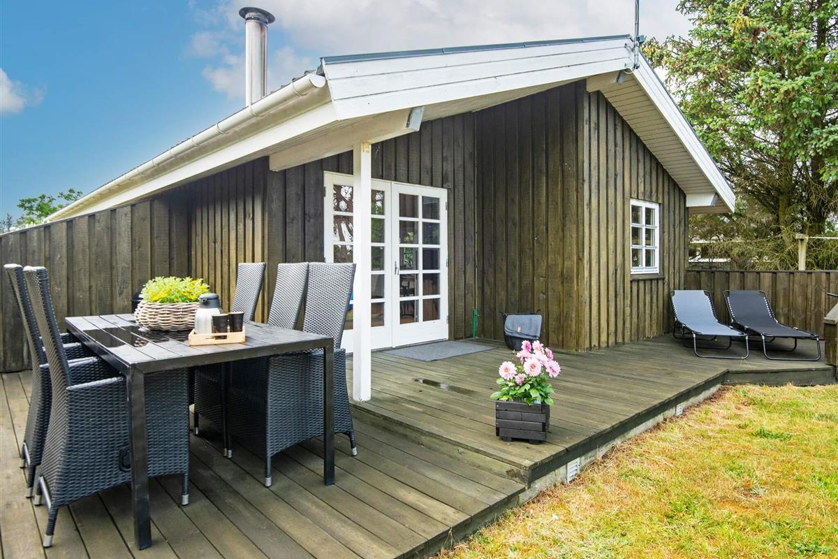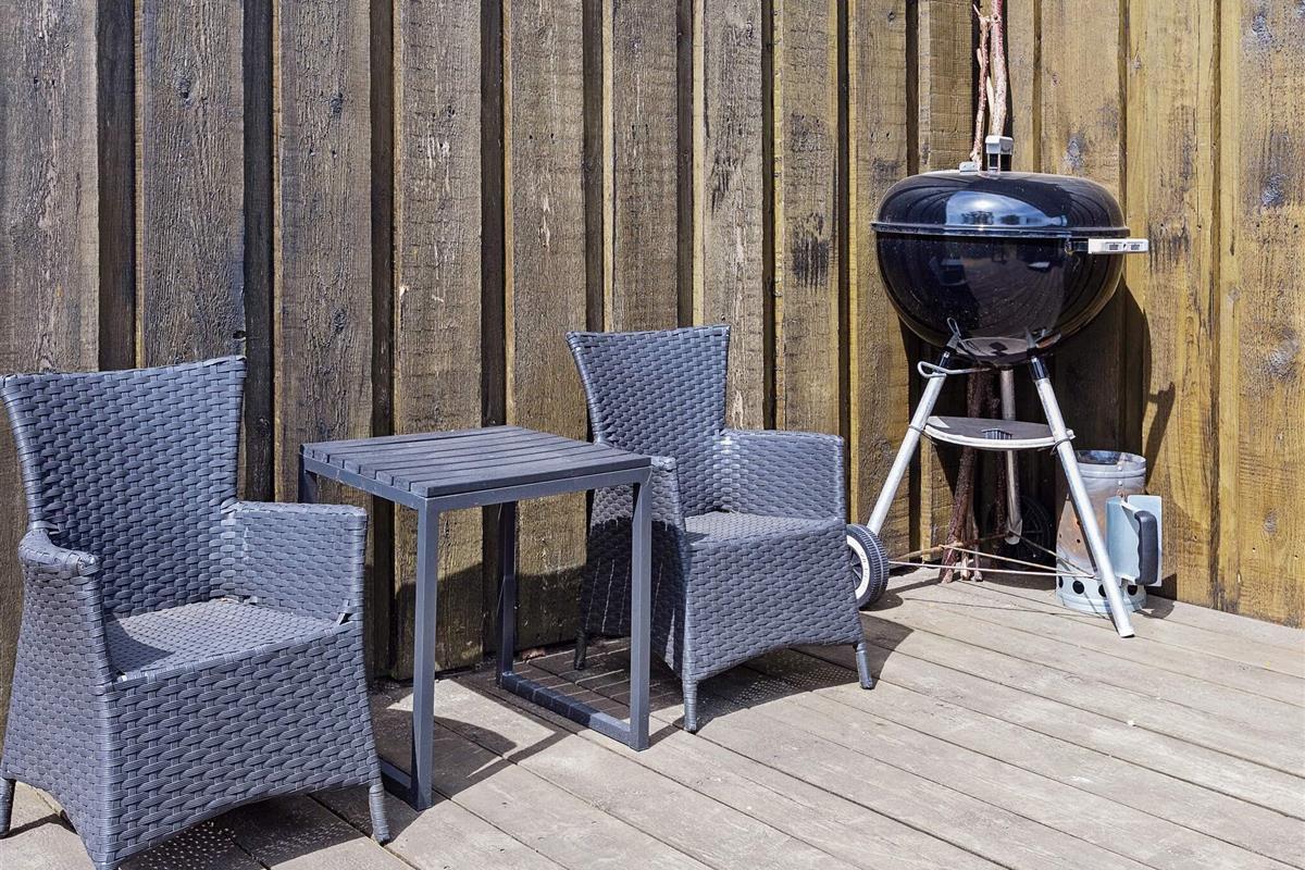 1 Außenbereich: Gartenmöbel, Liegestühle, Holzkohlegrill, Redskabsskur, Terrasse