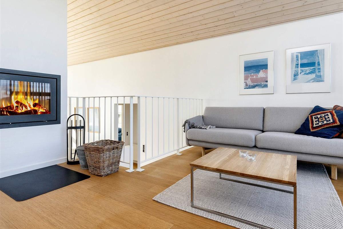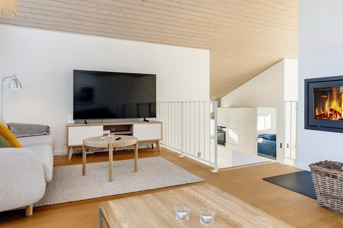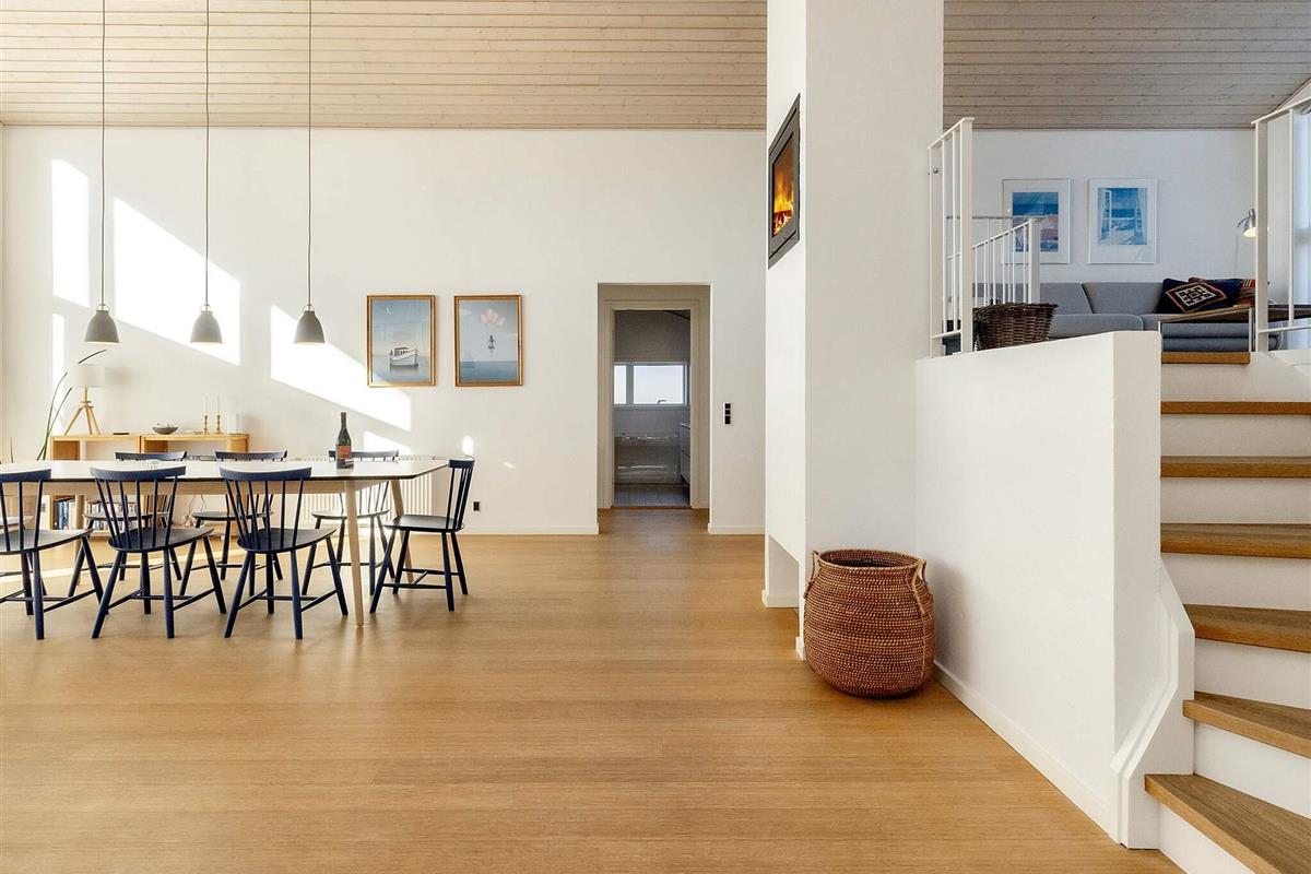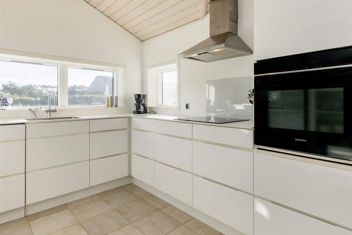 Das Wohnzimmer liegt erhöht gegenüber Küche, Schlafzimmern und Wohnzimmer. Zwischen Wohnzimmer und Wohnzimmer befindet sich ein Holzofen – sehr attraktiv und funktional. Von hier aus haben Sie einen wunderschönen Blick zur Küstenlandschaft der Nordsee. Die gut ausgestattete Küche verfügt über neue Geräte, darunter ein Induktionskochfeld, eine Mikrowelle und einen Backofen mit integrierter Heißluftfritteuse. Zusätzlich sorgen ein Geschirrspüler und ein moderner Wasserhahn mit kochend Wasser für zusätzlichen Luxus.
