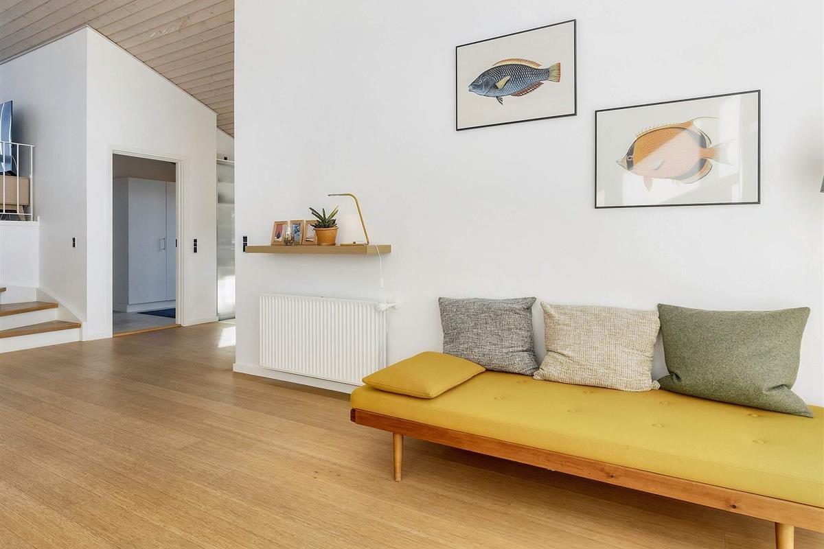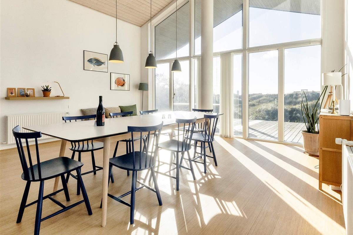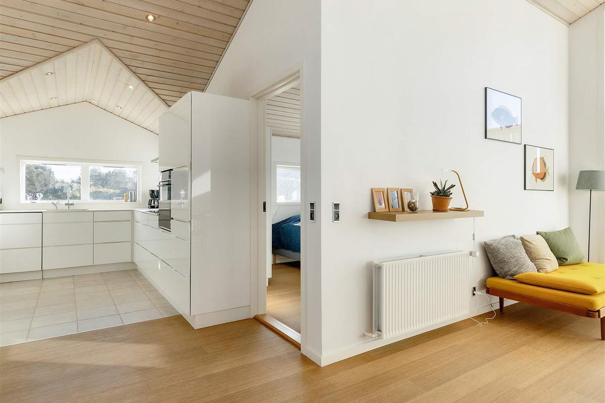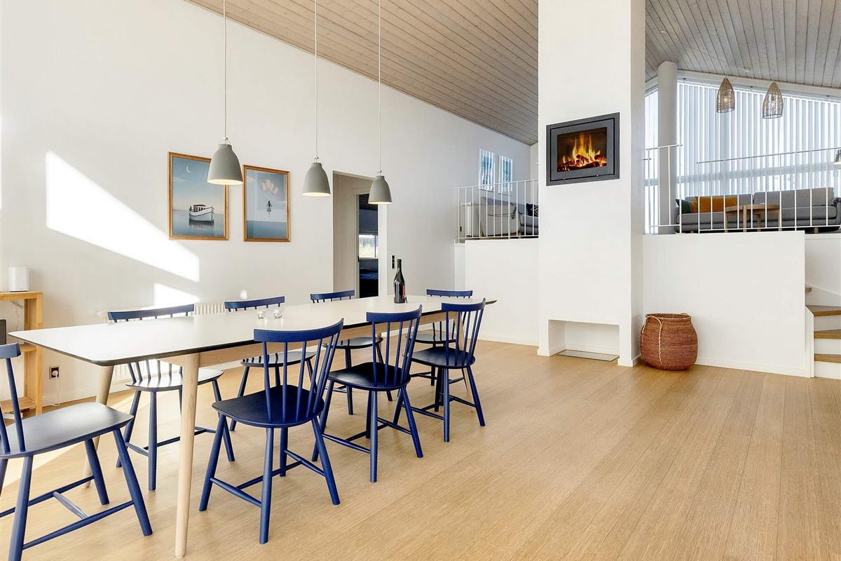 Das Wohnzimmer liegt erhöht gegenüber Küche, Schlafzimmern und Wohnzimmer. Zwischen Wohnzimmer und Wohnzimmer befindet sich ein Holzofen – sehr attraktiv und funktional. Von hier aus haben Sie einen wunderschönen Blick zur Küstenlandschaft der Nordsee. Die gut ausgestattete Küche verfügt über neue Geräte, darunter ein Induktionskochfeld, eine Mikrowelle und einen Backofen mit integrierter Heißluftfritteuse. Zusätzlich sorgen ein Geschirrspüler und ein moderner Wasserhahn mit kochend Wasser für zusätzlichen Luxus.