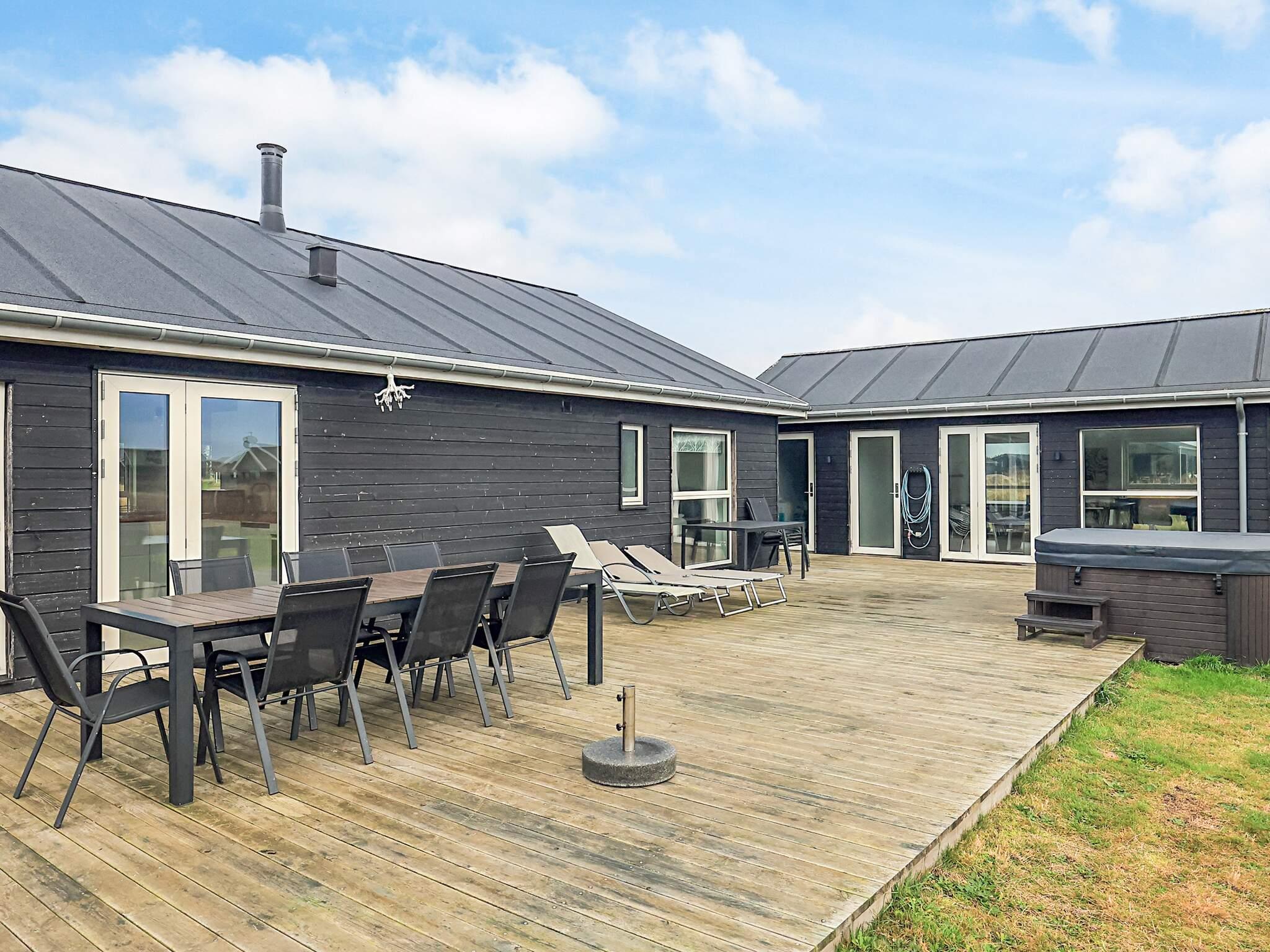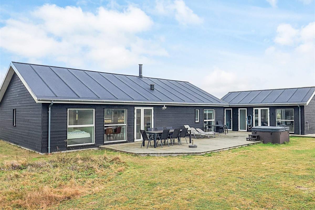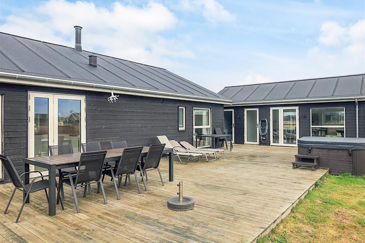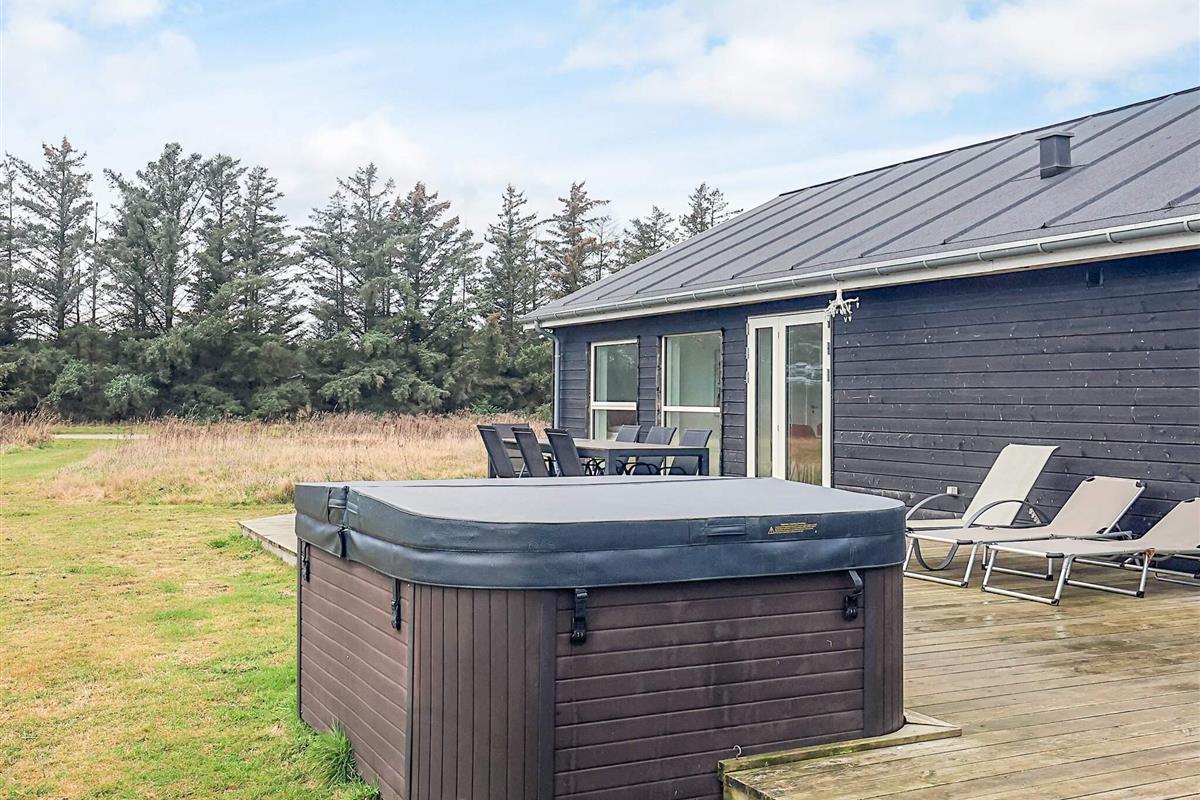 Haus und Nebengebäude sind durch eine große und schöne Terrasse von ca. 70 m² mit Außen-Whirlpool und Außendusche sowie Spielturm und Rutsche verbunden. Der Außen-Whirlpool kann von April bis Oktober genutzt werden. In den Wintermonaten kann der Außen-Spa gegen eine Gebühr von 1.400 DKK für die anschließende Winterfestmachung in Betrieb genommen werden. Weitere Informationen erhalten Sie bei der örtlichen Agentur in Løkken.
