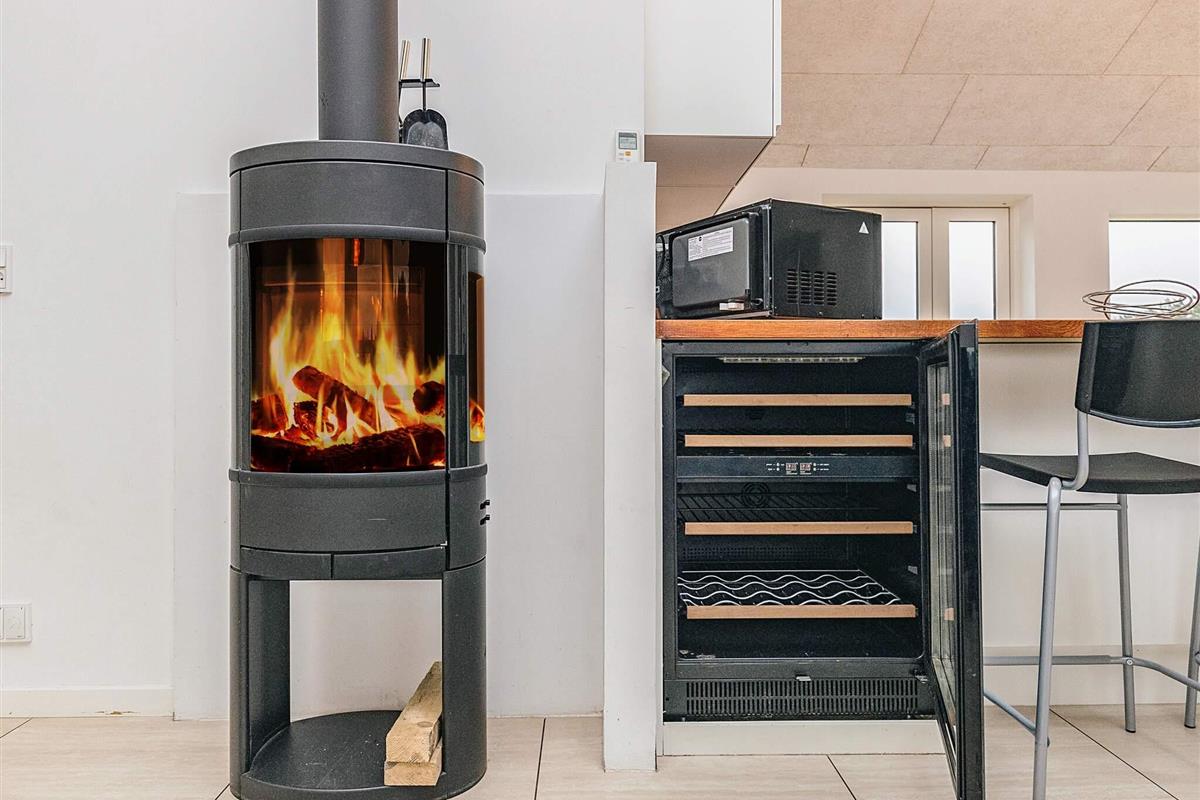 Das gemütliche Wohnzimmer verfügt über einen Holzofen, der für die perfekte Sommerhausatmosphäre sorgt.