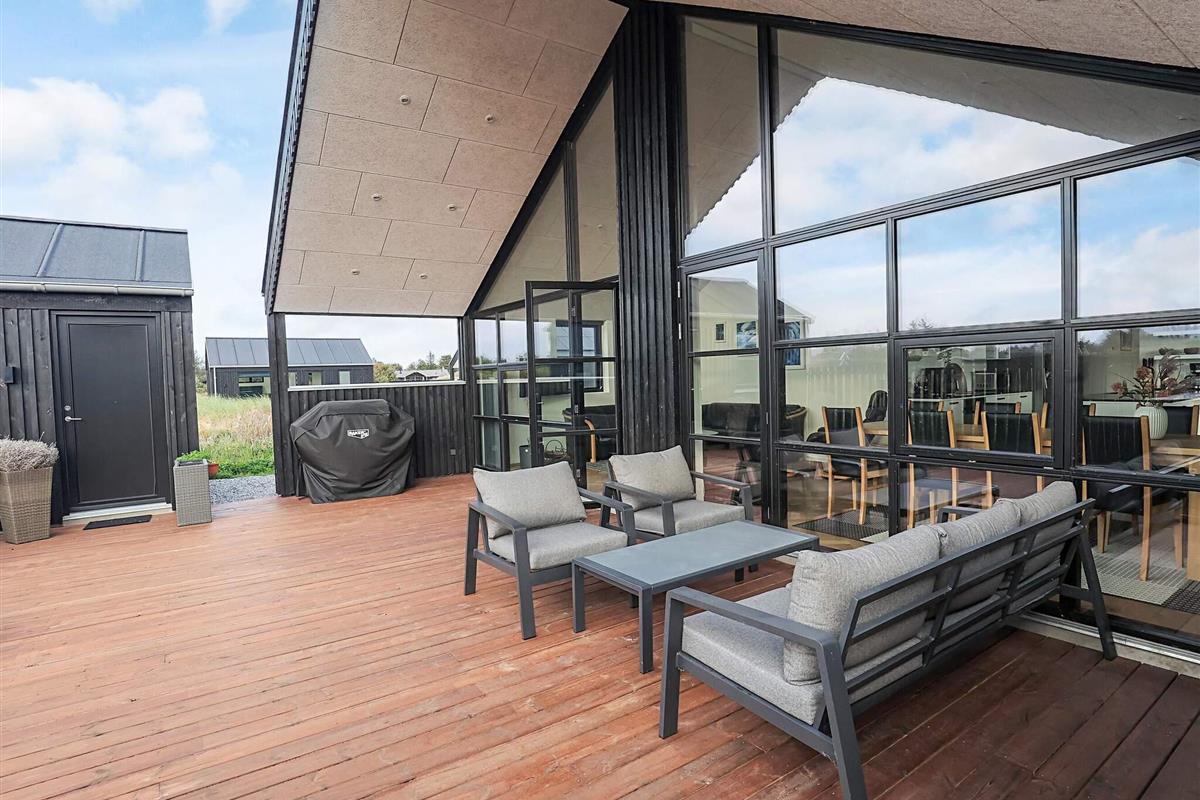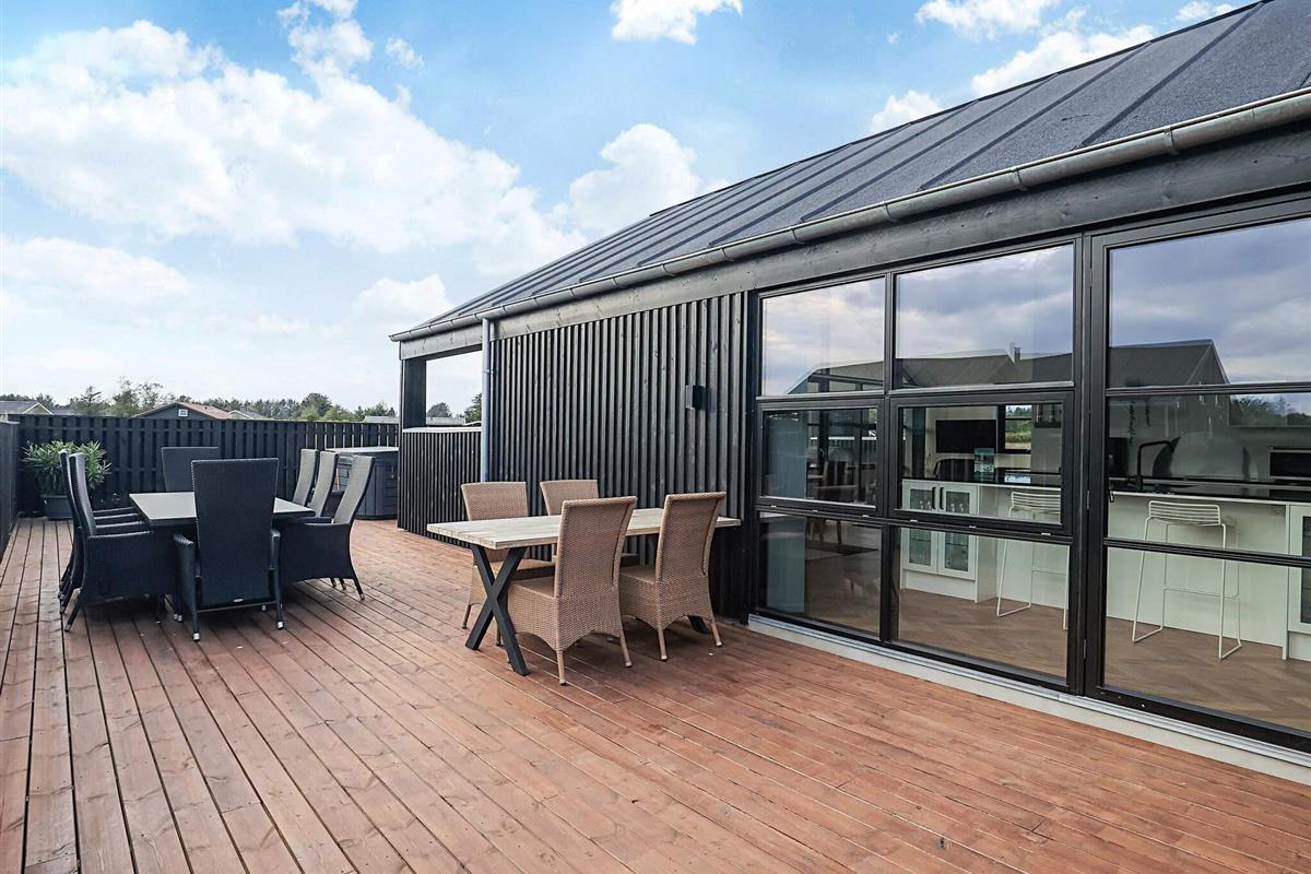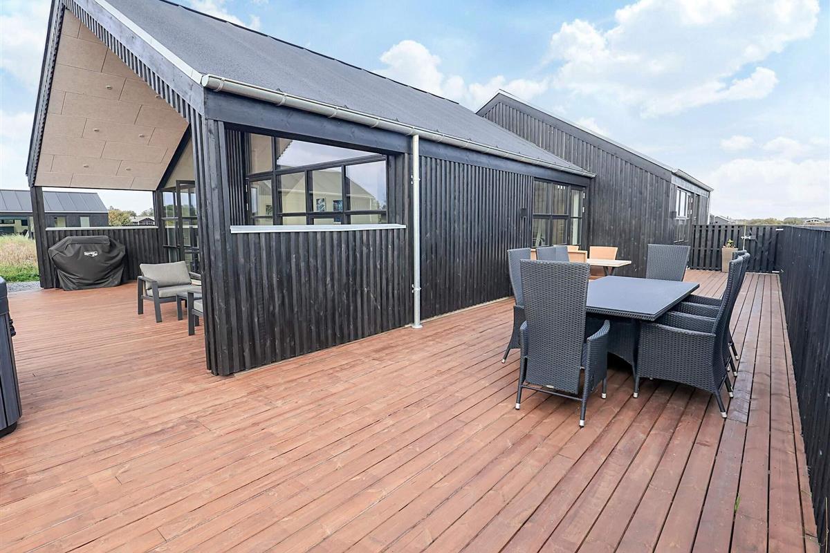 Ferienhaus in einem neu angelegten Ferienhausgebiet, am Ende einer Straße mit freiem Ausblick. Das Haus bietet Platz für die ganze Familie – sowohl drinnen mit gemütlichen Ecken als auch draußen auf der großen Holzterrasse.