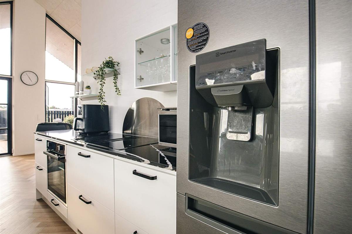 Die Küche ist mit Kühlschrank, Induktionskochfeld, Heißluftofen, Mikrowelle und einer Spülmaschine gut ausgestattet.
