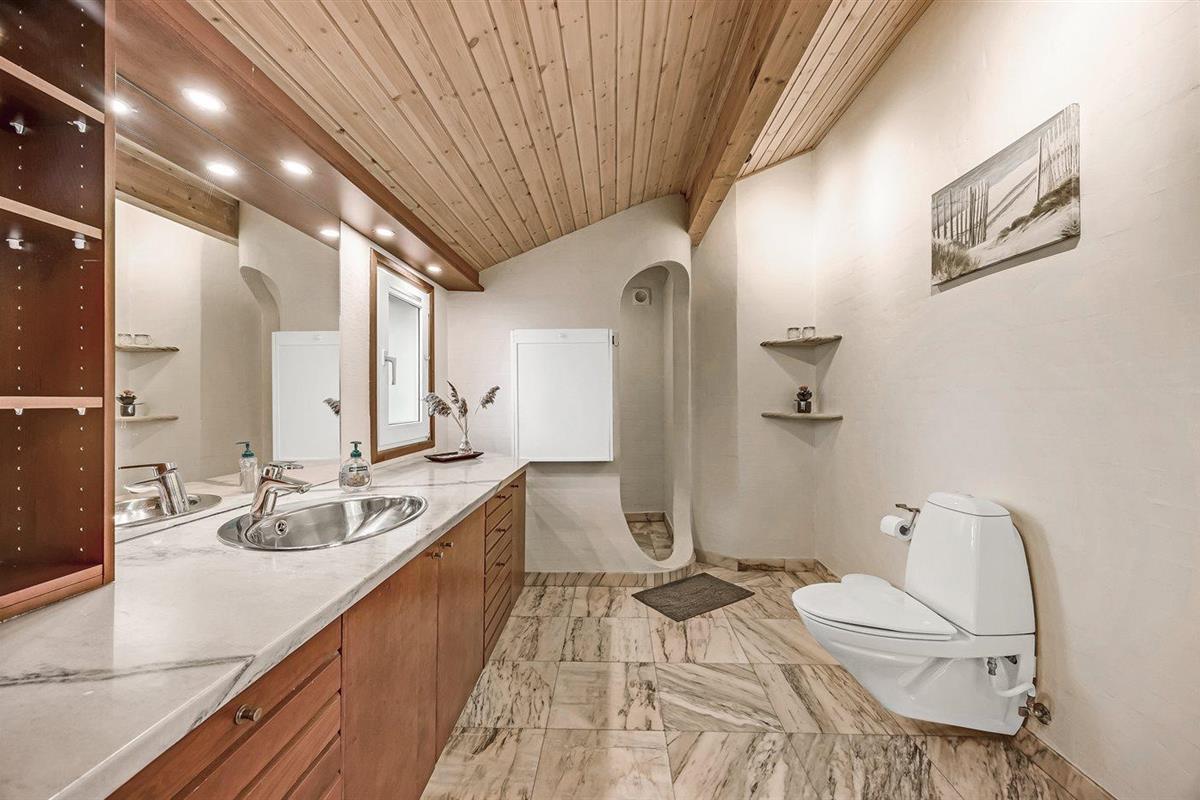 Er is 2 badkamers met douchehok en 3 toiletten, waarvan 1 gastentoilet. Er is vloerverwarming in 2 van de badkamers. Er is vloerverwarming in het gastentoilet. De sauna biedt de gelegenheid tot ontspanning.