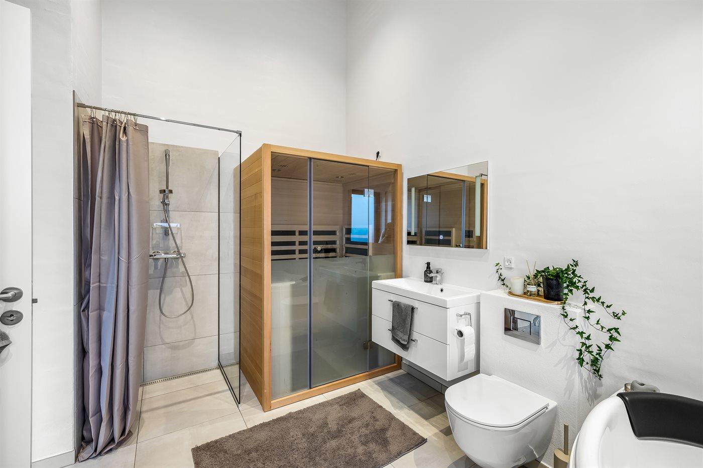 Er is 3 badkamers met douchehok en 3 toiletten. Er is vloerverwarming in 3 van de badkamers.. Badkuip. De sauna biedt de gelegenheid tot ontspanning.