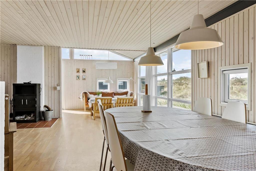 Das 104 m² große Holzferienhaus wurde 1984 erbaut und seitdem mit großer Sorgfalt gepflegt. Daher wurden sowohl die ursprüngliche Küche als auch das Badezimmer unter anderem erhalten – und an der Aussicht hat sich kaum etwas verändert, denn durch die großen Fenster können Sie direkt auf das wellige Strandgras in der hügeligen Küstenlandschaft blicken. Die Küche ist in das Wohnzimmer integriert, wo die hellen Holzverkleidungen, der Kaminofen und die bereits erwähnte schöne Aussicht eine stimmungsvolle Atmosphäre für Entspannung und gesellige Momente schaffen. Die Alkoven im Wohnzimmer fungiert als zusätzliche Kuschelecke, und schnell kann es zu einem Wettbewerb kommen, wer hier lesen oder ein wohlverdientes Mittagsschläfchen machen darf. Außerdem können Sie sich in den vier Schlafzimmern des Ferienhauses bequem einrichten, die insgesamt acht Feriengäste beherbergen können.