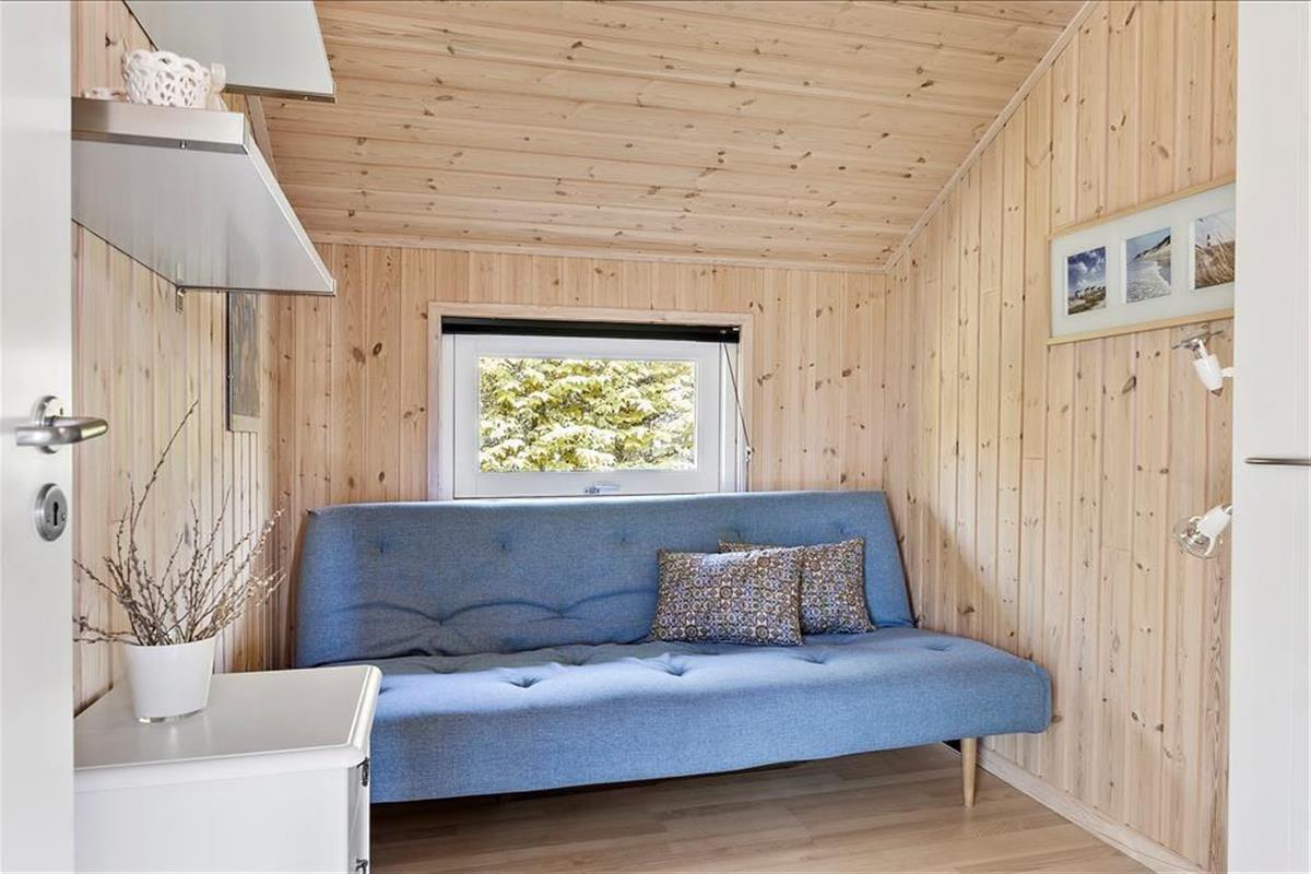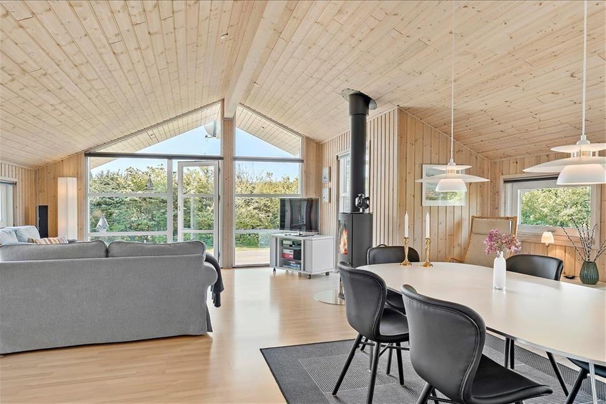 Das Haus strahlt eine wunderbare Atmosphäre von Urlaub und Entspannung aus und ist im klassischen Ferienhausstil mit schwarzen Holzfassaden und weißen Fensterrahmen gehalten. Innen ist es hell und stilvoll mit einem Dach bis zum First und großen Fenstern, die die grüne Umgebung direkt ins Wohnzimmer bringen. Es gibt Holz auf den Böden, Wänden und Decken, was zur „richtigen“ Ferienhausatmosphäre beiträgt. Das Herz des Hauses ist der große Wohnbereich mit offener Verbindung zwischen Küche und Wohnzimmer. Ein besonderes Highlight in diesem Haus ist der Essbereich mit einer zusätzlichen Theke, an der man ein Glas Wein genießen kann, während das Essen auf dem Herd köchelt. Das Haus verfügt über drei Schlafzimmer – zwei mit Doppelbetten und eines mit Schlafsofa. Schließlich gibt es ein Badezimmer mit Waschmöglichkeiten.