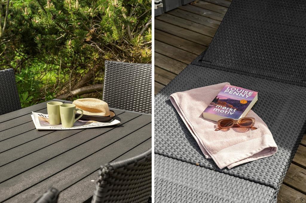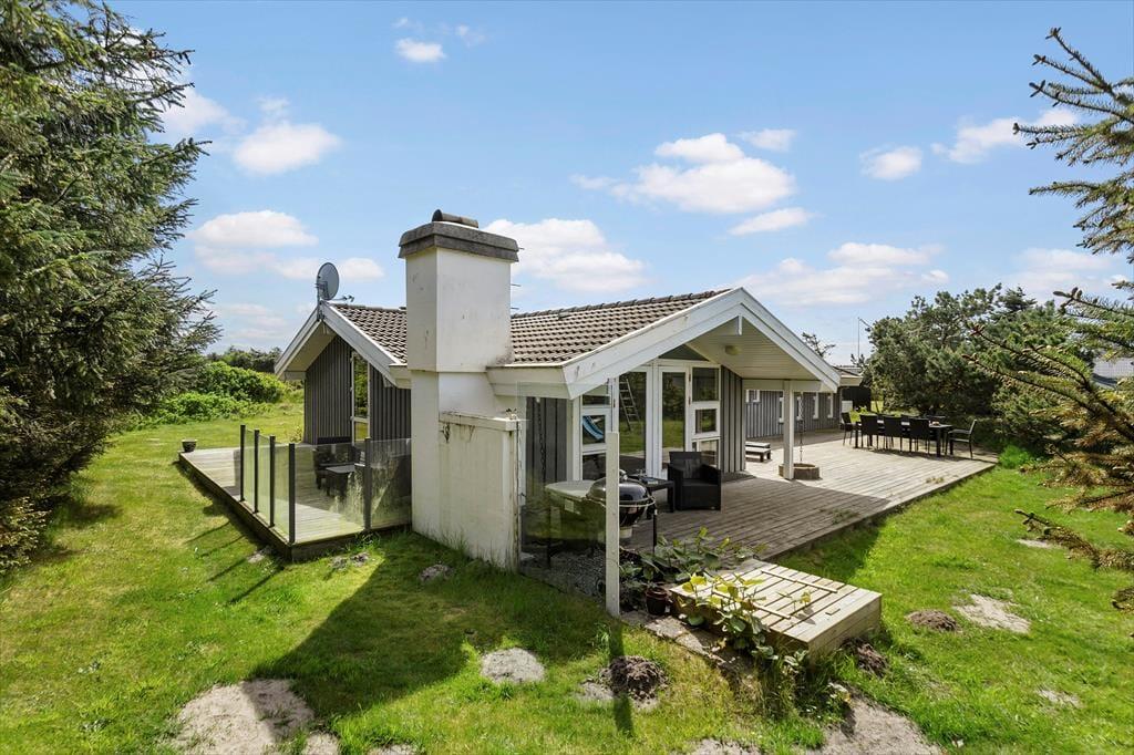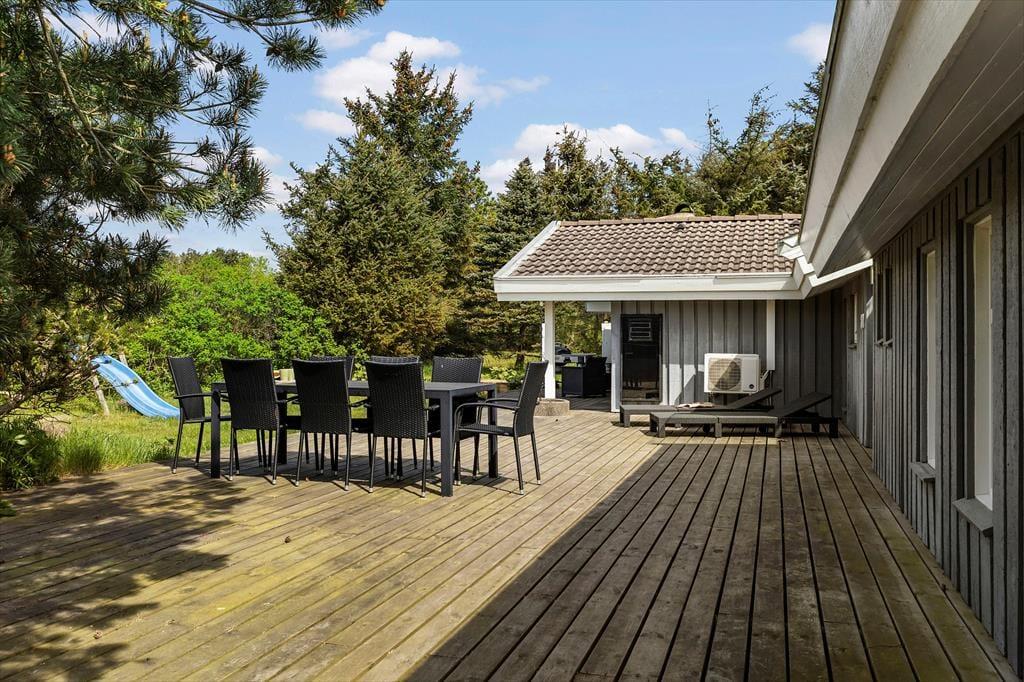 Auch auf dem 1.250 m² großen Grundstück lässt es sich gut aufhalten. Die Randpflanzungen rahmen den Rasen, auf dem du Ball spielen und dich austoben kannst. Die Holzterrassen des Ferienhauses bieten viele Möglichkeiten zur Entspannung in sonnigen und ungestörten Umgebungen, und am Abend kannst du den Grill benutzen und ein sommerliches Festmahl am Gartentisch anrichten.