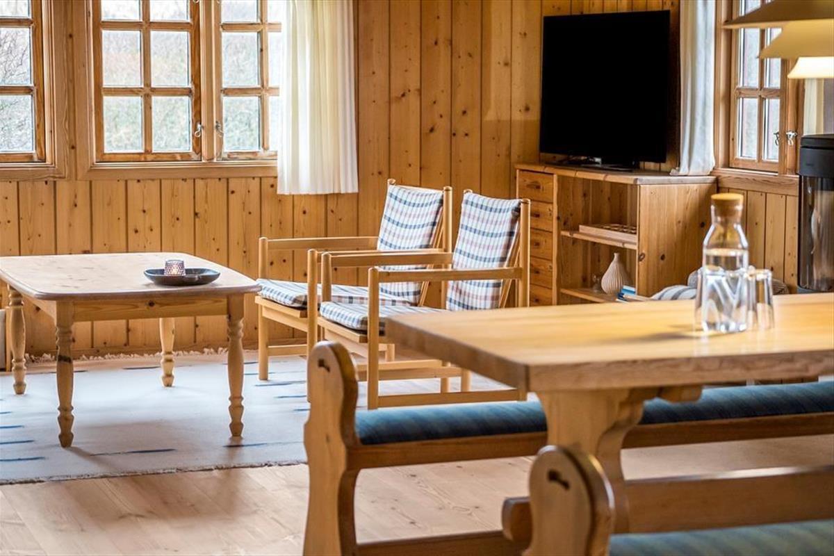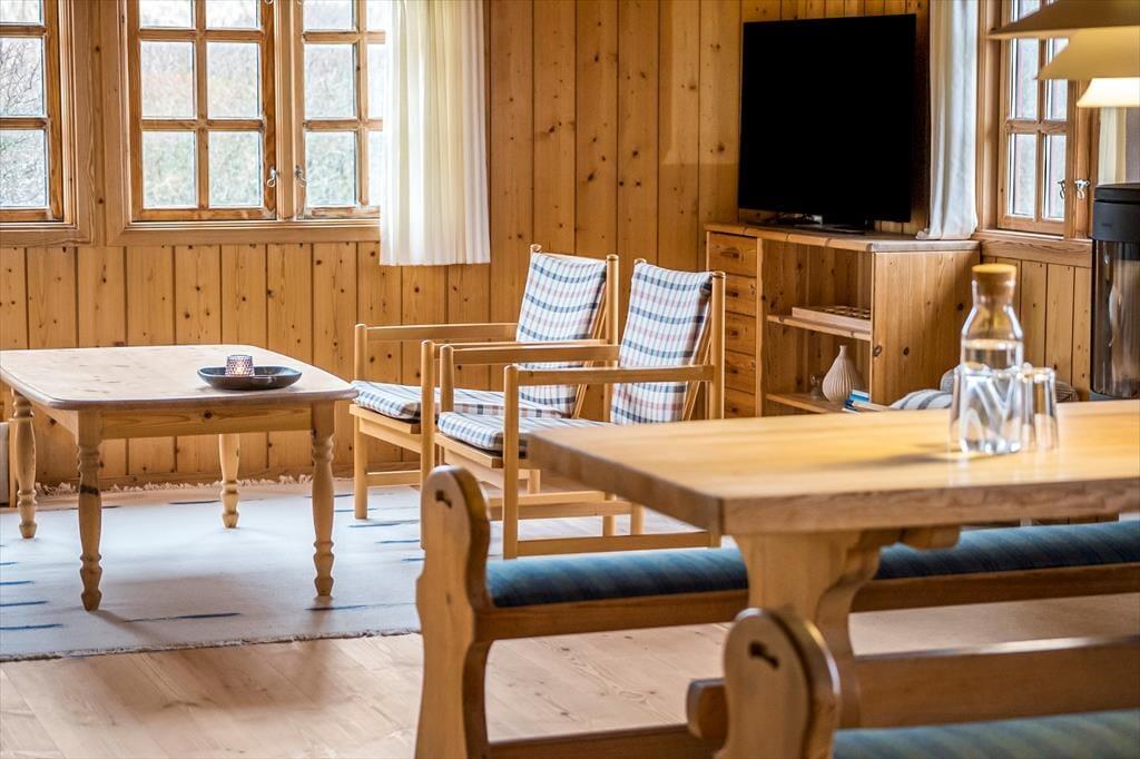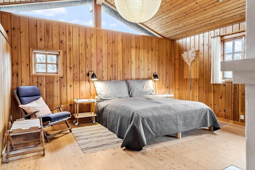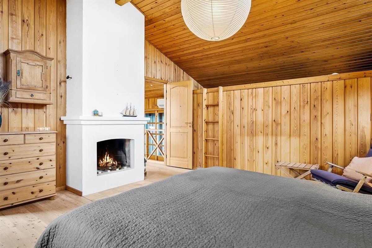 Mit Kamin in einem der Schlafzimmer, fein dekorierten Türen und komfortablem Mobiliar wird die Gemütlichkeit in diesem klassischen Holzferienhaus, das am Ende von Hedvigsvej direkt an der Grønhøj-Strand liegt, großgeschrieben.
