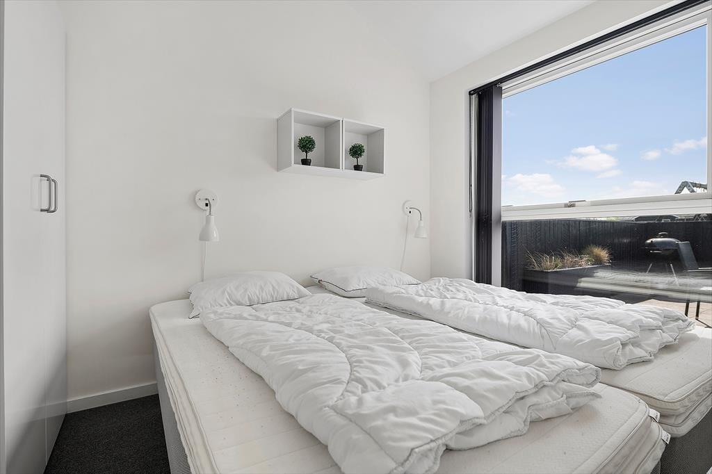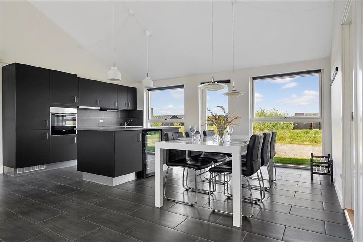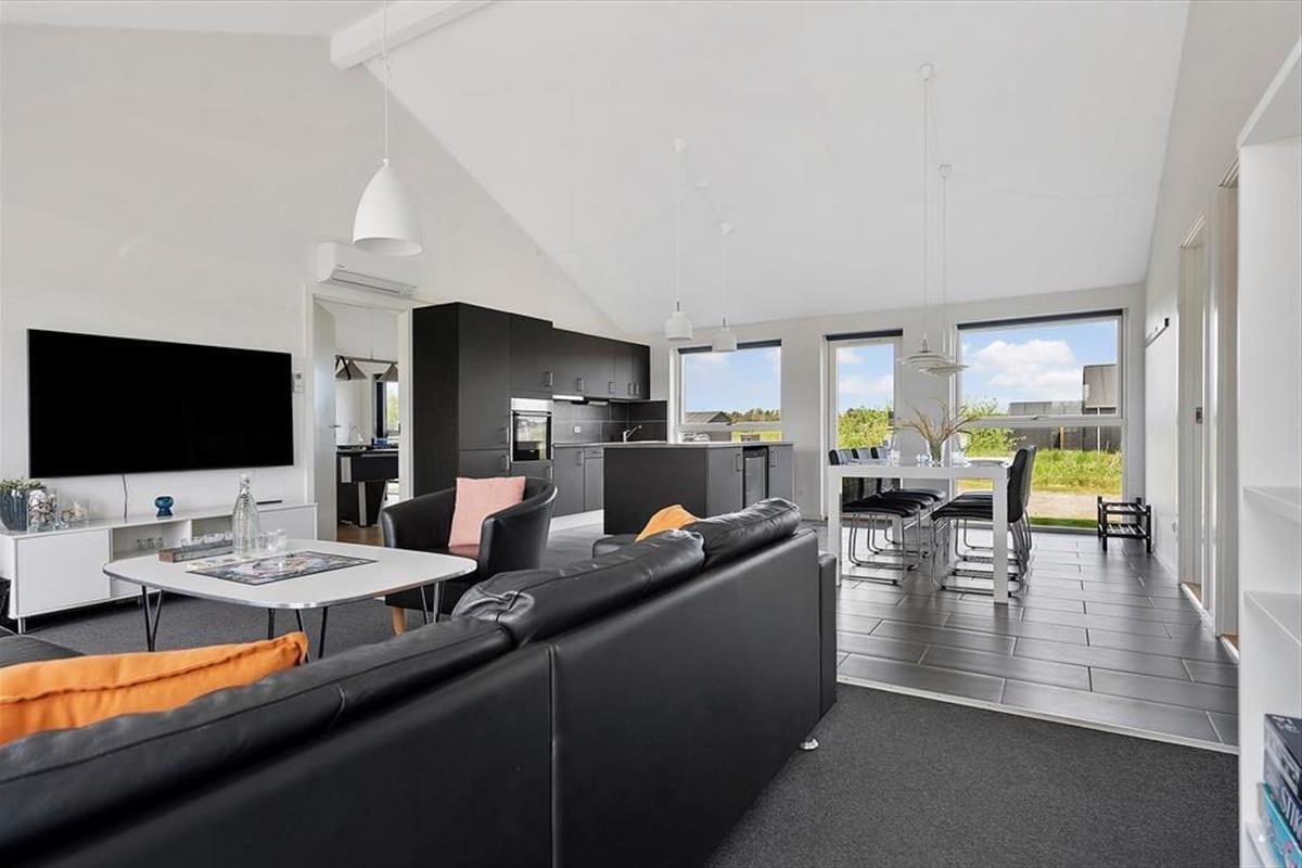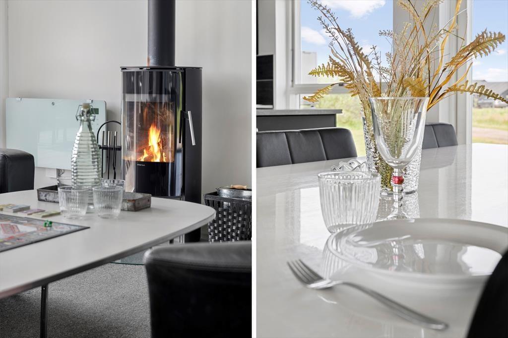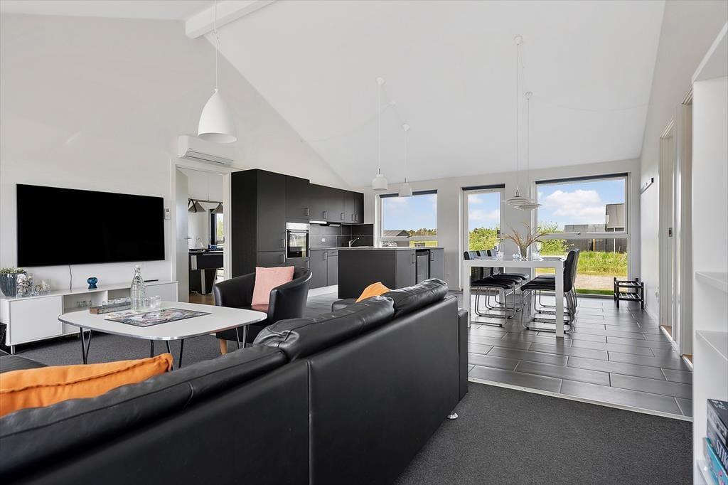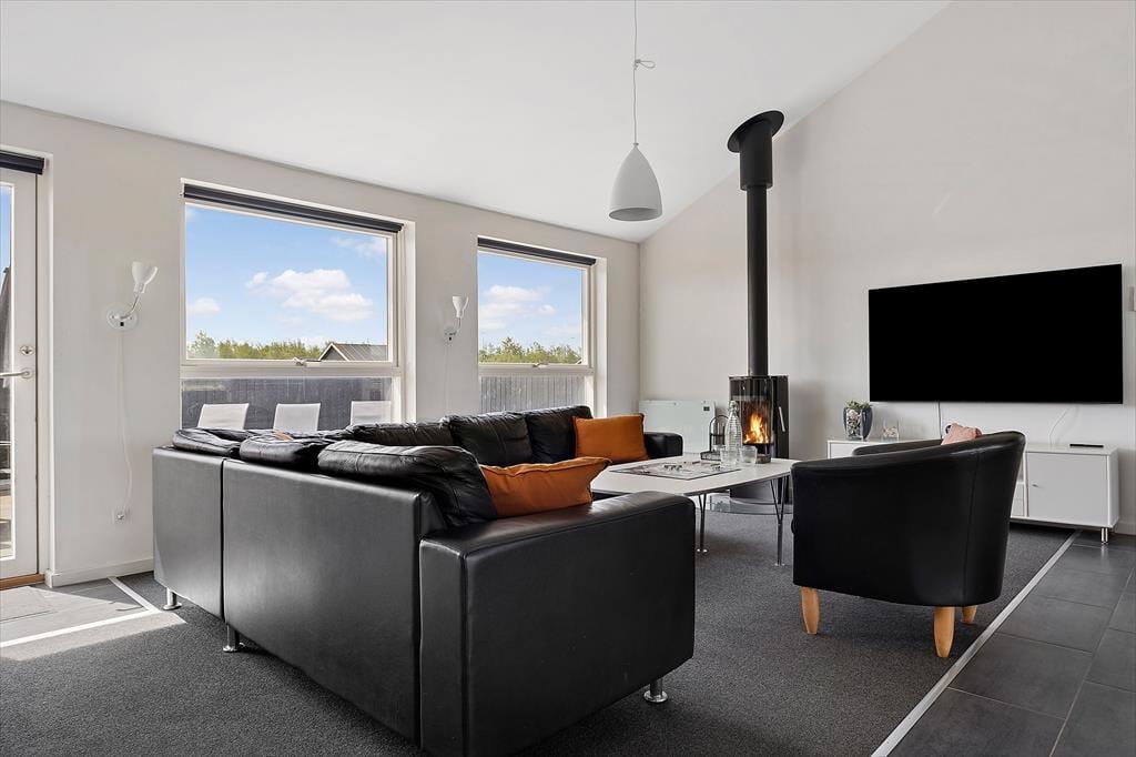 Alle Räume des 122 m2 großen Ferienhauses präsentieren sich stilvoll – insbesondere der gemütliche Wohnbereich, in dem Küche und Wohnzimmer vereint sind. Hier sorgen hohe Decken und viel Licht für eine angenehme Atmosphäre, und ein Kaminofen steht bereit, um Wärme und Gemütlichkeit zu verbreiten, wenn Sie in der Sofaecke entspannen möchten. Der Abend kann auch Wellness bieten: Genießen Sie Whirlpool und Saunagänge im größeren der beiden Badezimmer. Für aktive Stunden können Sie im Spielzimmer Billard, Dart, Tischfußball und Tischtennis spielen. Die drei Schlafzimmer des Hauses sind mit Doppelbetten ausgestattet, und im Spielzimmer gibt es zusätzlich ein Schlafsofa – so haben Sie Platz für bis zu acht Personen.