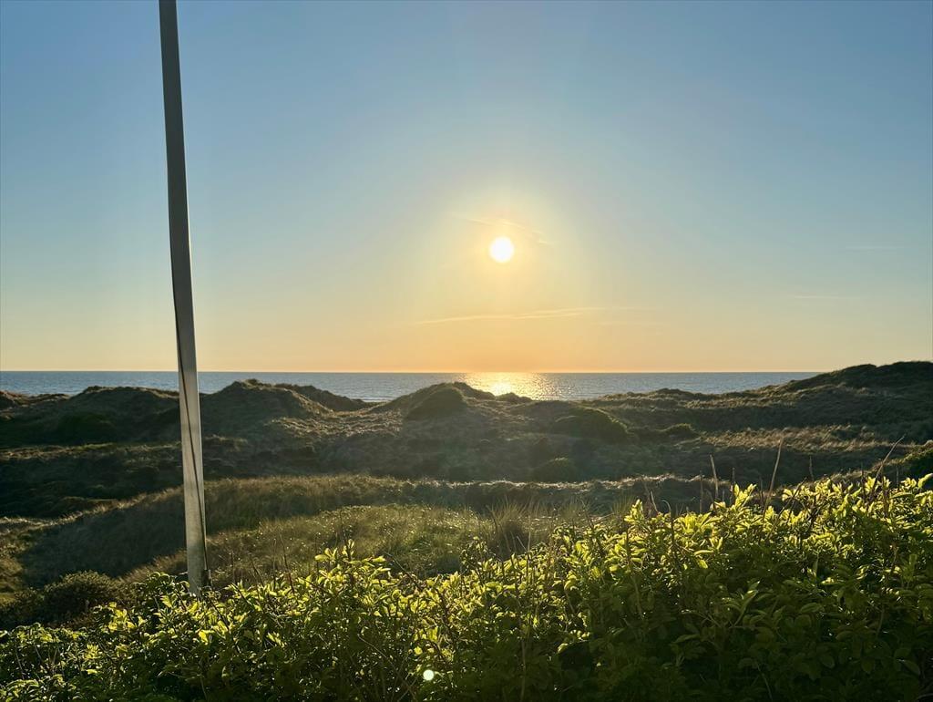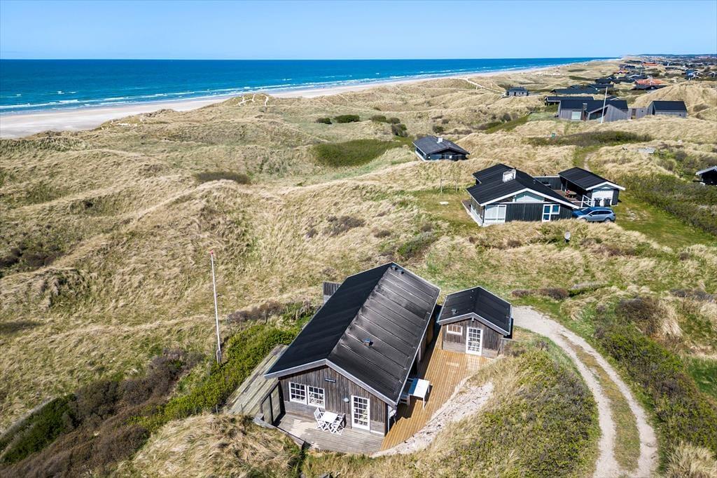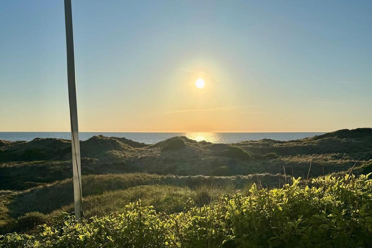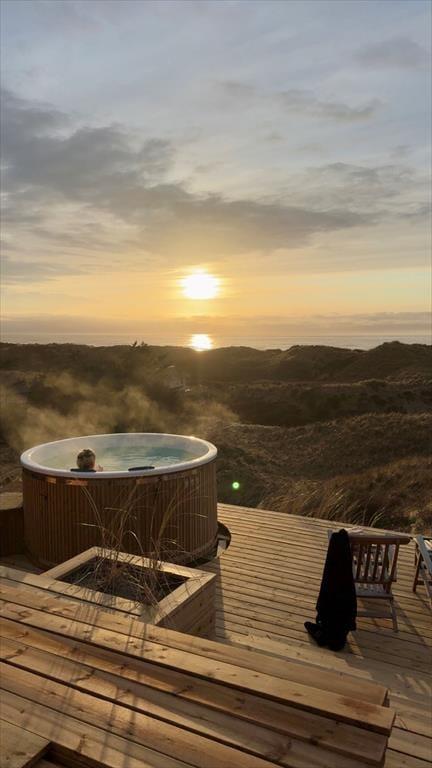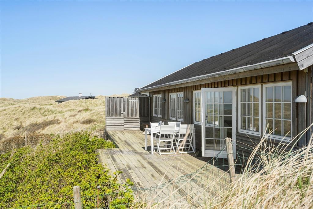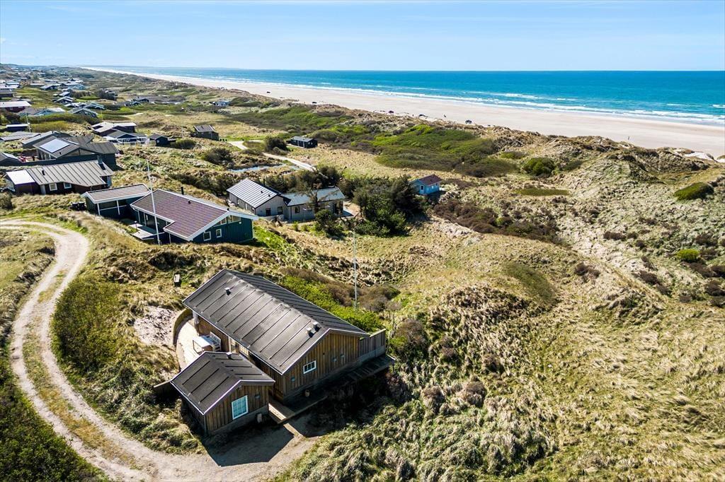 Vom Wohnzimmer tretet ihr hinaus auf die neue, große Holzterrasse mit Essplatz, Sonnenliegen und Hot Tub – eines der absoluten Highlights des Hauses. Hier vereinen sich Sonne, Meeresluft und der großartige Blick über die Dünen zu einer ganz besonderen Urlaubsstimmung. Wenn der Tag sich dem Ende neigt, könnt ihr den Sonnenuntergang direkt von der Terrasse oder dem Hot Tub aus erleben, während der windgeschützte Sonnenhof nach Süden und Osten morgens und mittags Sonne sowie Ruhe für ein gemütliches Mittagessen in der Wärme bietet. Hinweis: Die Terrasse wurde im Herbst 2025 angelegt – neue Fotos folgen im Frühjahr 2026. Vor dem Haus erstreckt sich eine geschützte Dünenlandschaft bis hinunter zum Strand, und oft kommen Rehe vorbei. Die Lage ist ruhig, ungestört und absolut einzigartig – nur 150 Meter von einem der schönsten Strände Dänemarks entfernt.