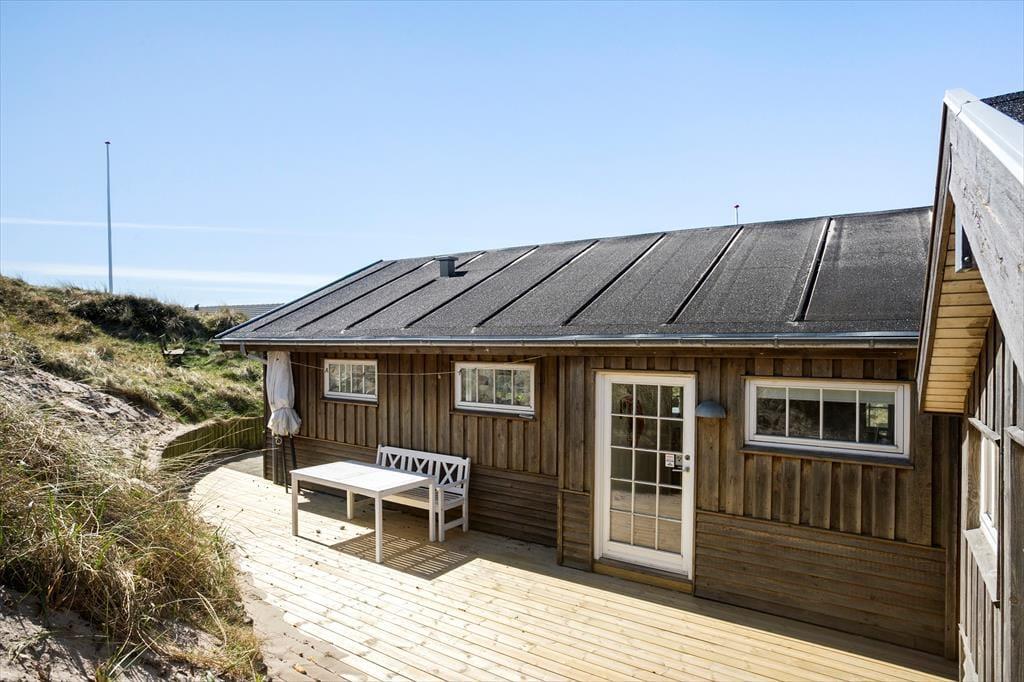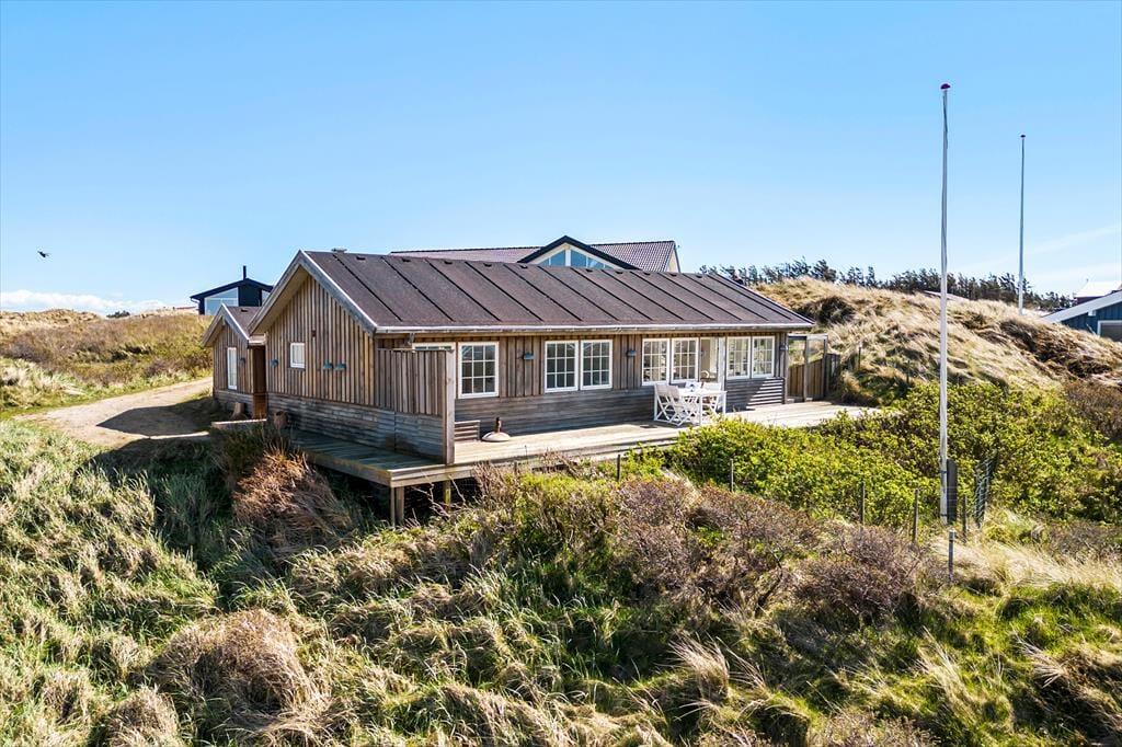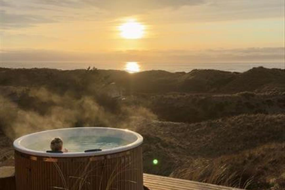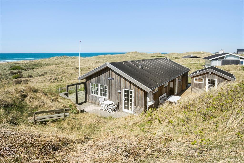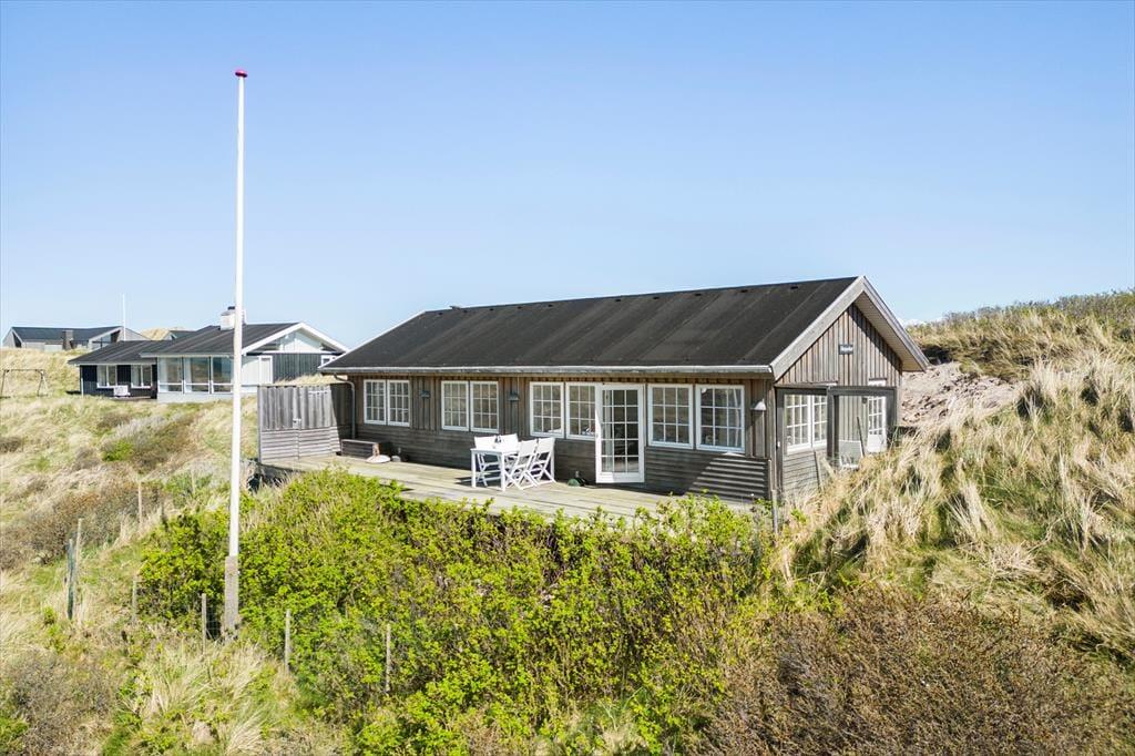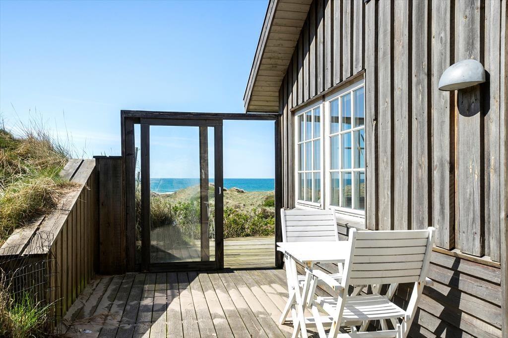 Vom Wohnzimmer tretet ihr hinaus auf die neue, große Holzterrasse mit Essplatz, Sonnenliegen und Hot Tub – eines der absoluten Highlights des Hauses. Hier vereinen sich Sonne, Meeresluft und der großartige Blick über die Dünen zu einer ganz besonderen Urlaubsstimmung. Wenn der Tag sich dem Ende neigt, könnt ihr den Sonnenuntergang direkt von der Terrasse oder dem Hot Tub aus erleben, während der windgeschützte Sonnenhof nach Süden und Osten morgens und mittags Sonne sowie Ruhe für ein gemütliches Mittagessen in der Wärme bietet. Hinweis: Die Terrasse wurde im Herbst 2025 angelegt – neue Fotos folgen im Frühjahr 2026. Vor dem Haus erstreckt sich eine geschützte Dünenlandschaft bis hinunter zum Strand, und oft kommen Rehe vorbei. Die Lage ist ruhig, ungestört und absolut einzigartig – nur 150 Meter von einem der schönsten Strände Dänemarks entfernt.