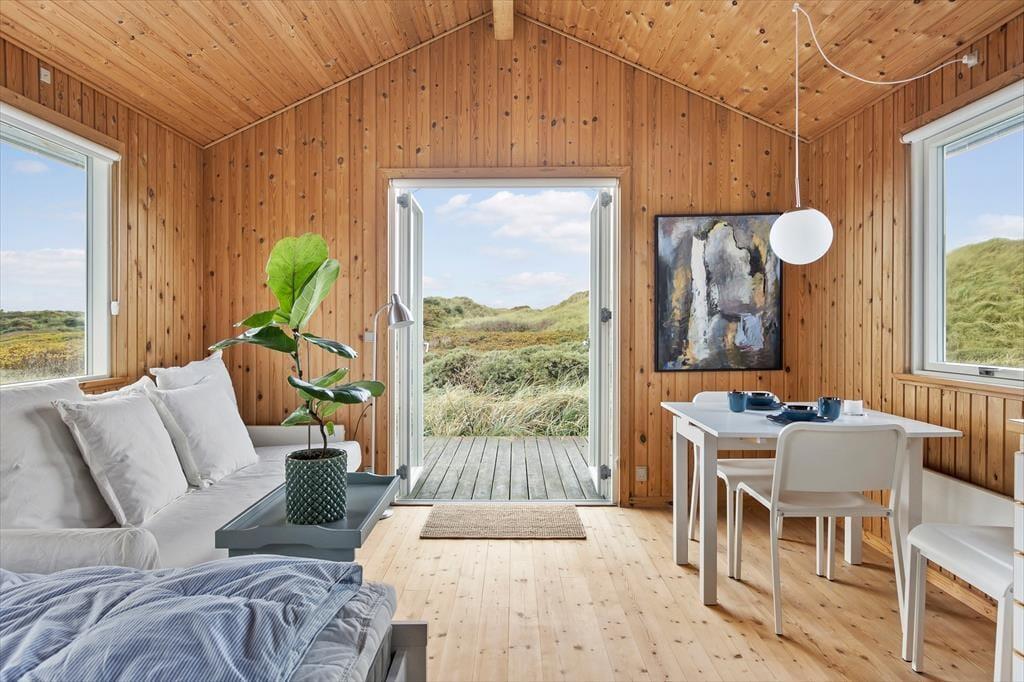 Ein Ferienhaus mit 30 m² klingt auf den ersten Blick nicht nach viel, aber dank der gemütlichen und funktionellen Einrichtung habt ihr alles Notwendige drinnen. Das Sofa ist der perfekte Ort, um die Hände zu verschränken oder in ein gutes Buch zu vertiefen – denkt nur daran, ab und zu aufzusehen und die schöne Dünenlandschaft zu bewundern, die sich vor den Fenstern erstreckt. Die Quadratmeter des Raumes sind gut genutzt, denn es gibt auch Platz für einen Esstisch/Schreibtisch, ein Doppelbett und eine einfache, aber schöne Küche. Alle Möbel sind in hellen Farbtönen gehalten, was einen charmanten Kontrast zur Holzverkleidung an Wänden und Decken bildet. In der Eingangshalle gibt es Platz für Jacken und Schuhe, und schließlich gibt es auch ein Badezimmer mit Dusche im Haus.