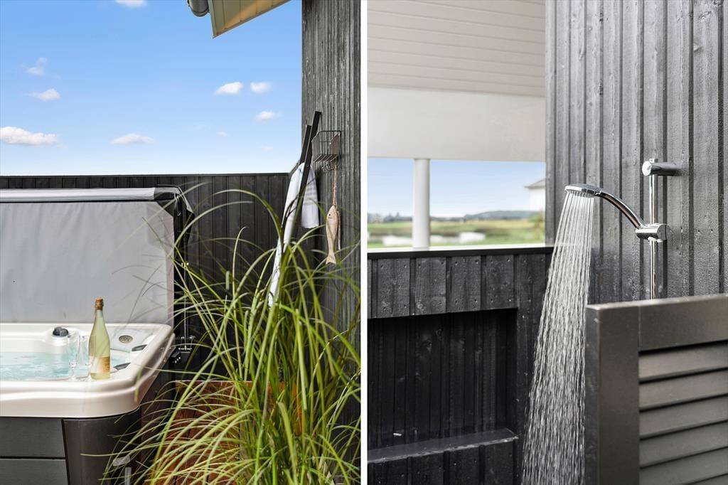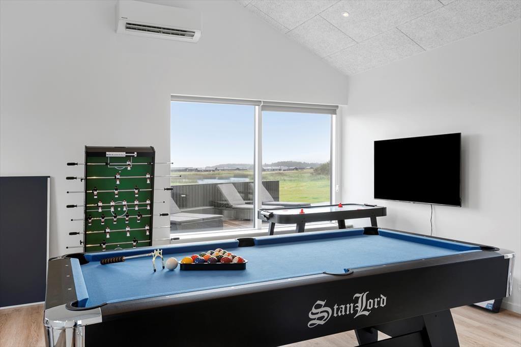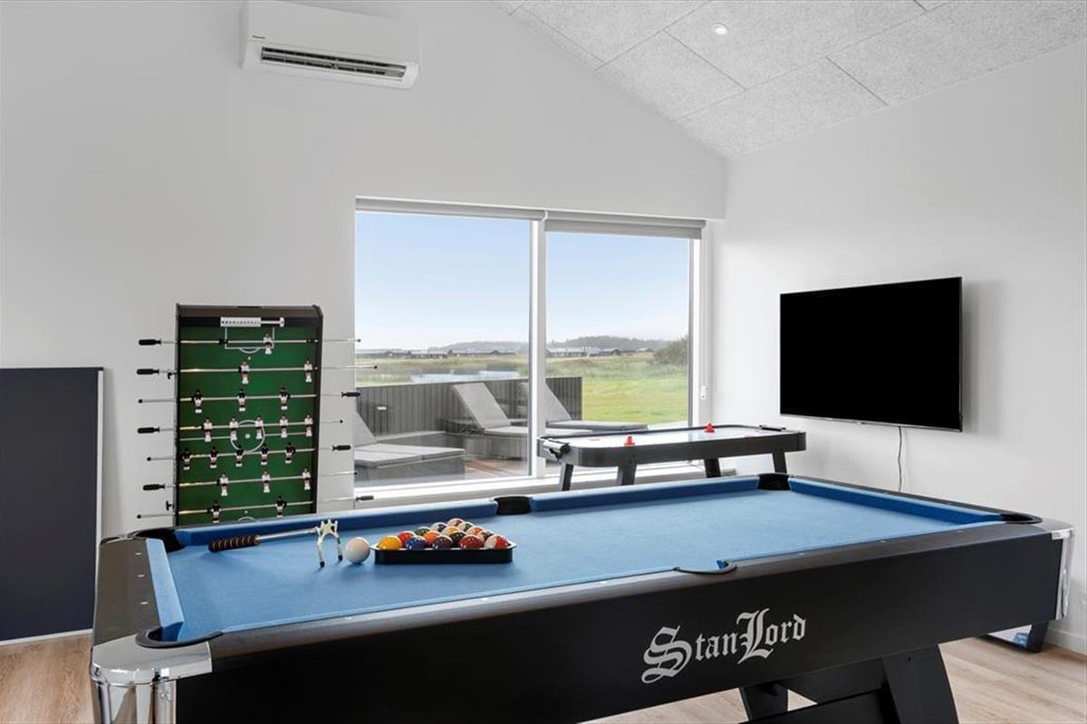 Draußen bietet dieses Ferienhaus eine Fülle von Möglichkeiten zur Entspannung und für Aktivitäten. Die große Terrasse ist in mehrere Sonneninseln unterteilt, wo du die Sonne von morgens bis abends genießen kannst. Das Außen-Spa ist der ideale Ort, um den Sternenhimmel zu genießen und in den warmen Blasen die Ruhe einkehren zu lassen. Wenn du dich abkühlen möchtest, kannst du eine erfrischende Dusche unter der Außendusche nehmen oder einen Sprung in den nahegelegenen See wagen. Das große Grundstück des Ferienhauses lädt zu Spielen und sportlichen Aktivitäten ein, und im Anbau findest du einen Aktivitätsraum, in dem du dich bei Tischfußball, Billard oder Airhockey messen kannst. Der Anbau beherbergt auch zusätzliche Zimmer und ein Badezimmer, was ihn ideal für Gäste oder ältere Kinder macht, die ein wenig mehr Privatsphäre wünschen.