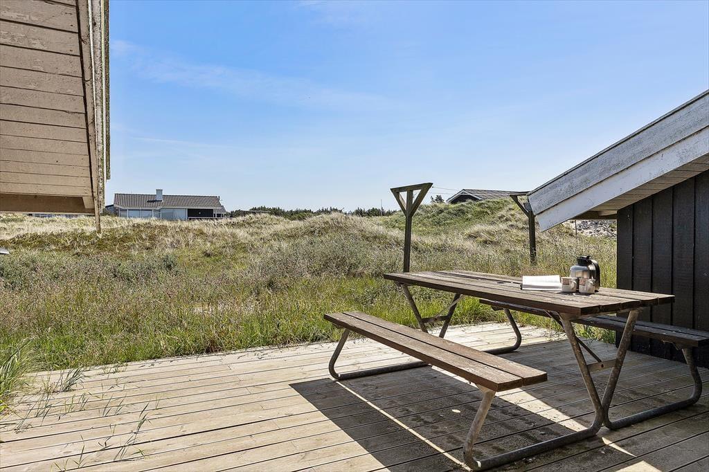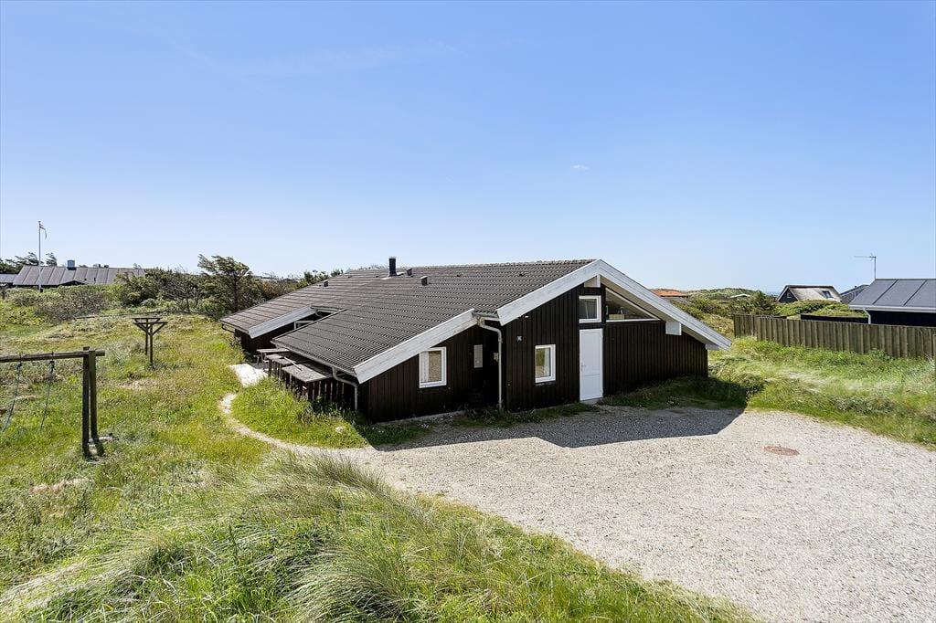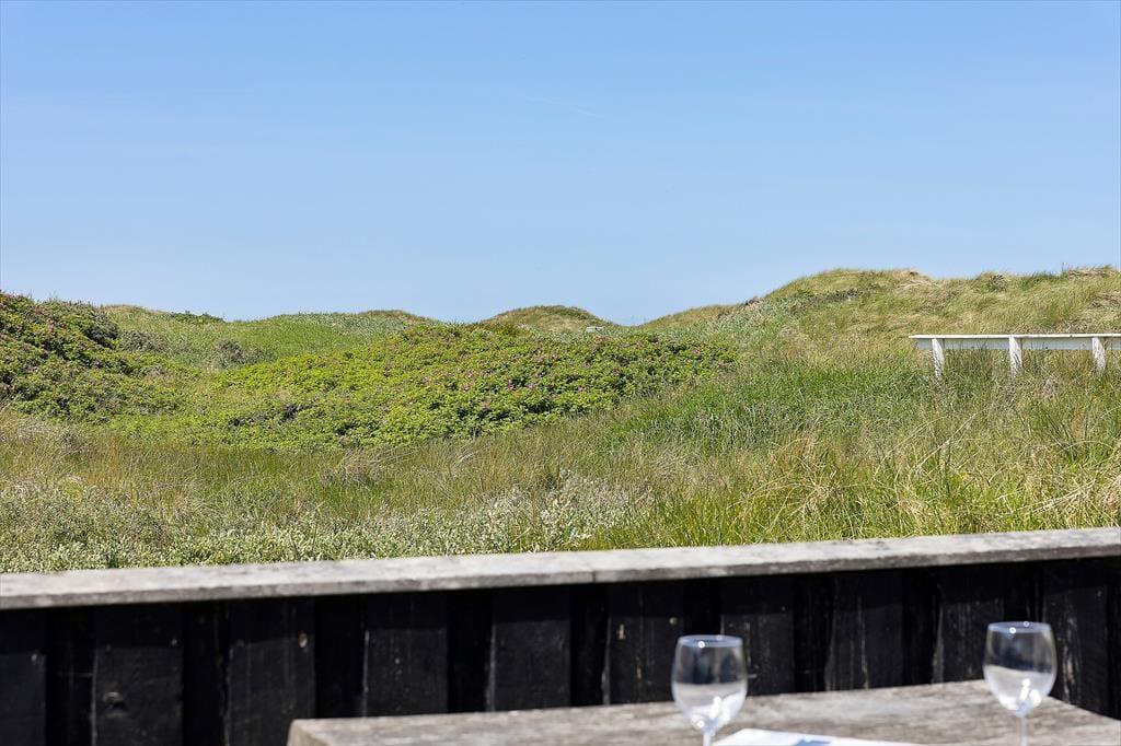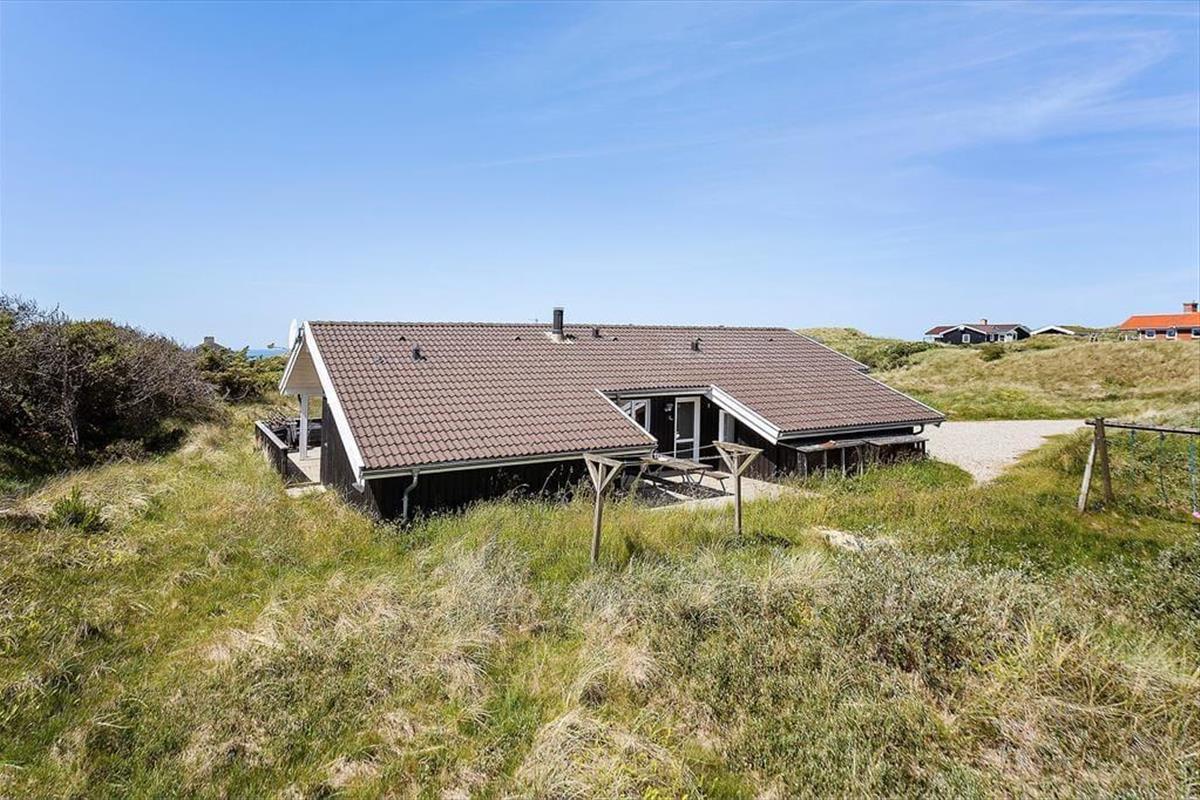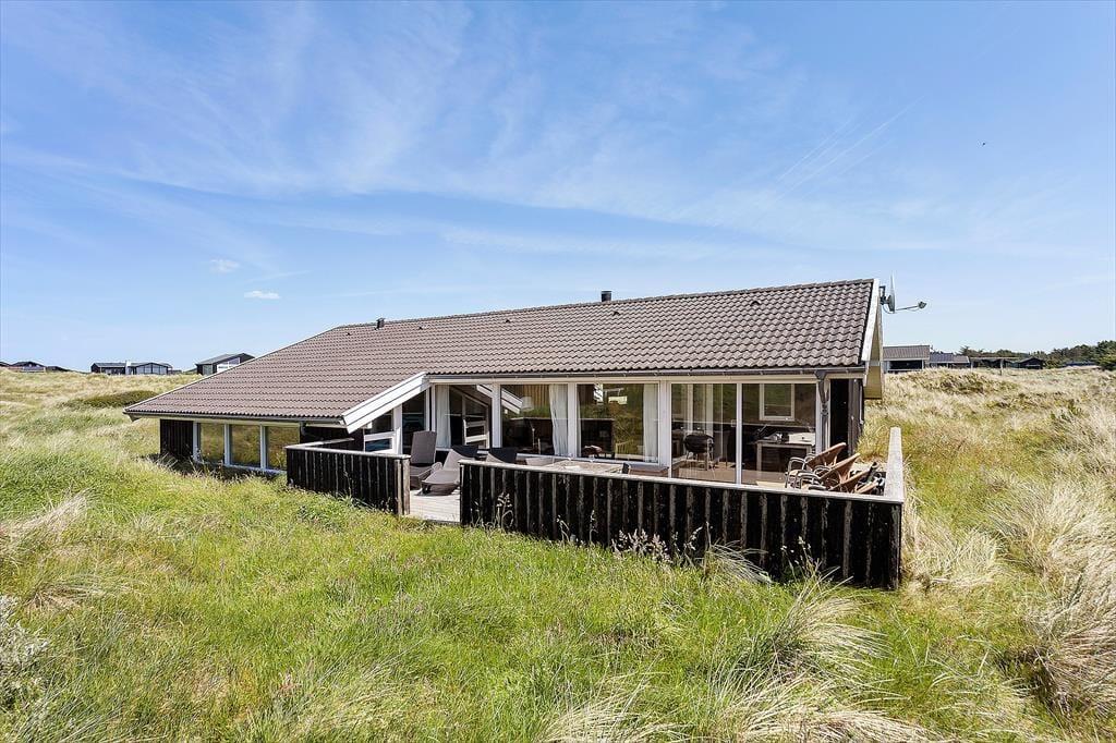 Zum Ferienhaus gehört ein großes Naturgrundstück mit Rasen und Dünen mit Strandhafer, ein schöner Ort zum Ballspielen oder Verstecken. Für die Kleinsten gibt es eine Schaukel. Vom Küchenbereich aus gelangt man auf eine kleinere, nach Osten ausgerichtete Terrasse, und vom Wohnzimmer hat man Zugang zu einer größeren, teilweise überdachten Terrasse, die Ruhe und Frieden bietet, sowie die Möglichkeit, sich auf den zahlreichen Liegestühlen zu sonnen. Mit nur etwas mehr als 200 Metern zum Westmeer kann man ständig das Rauschen des Wassers hören und den frischen Duft des Meeres wahrnehmen.