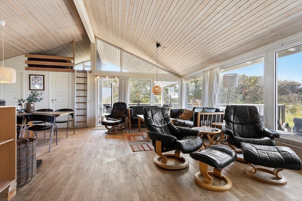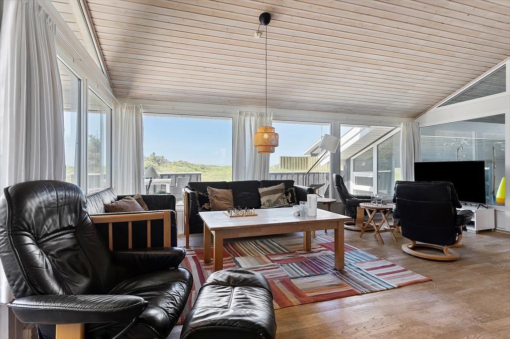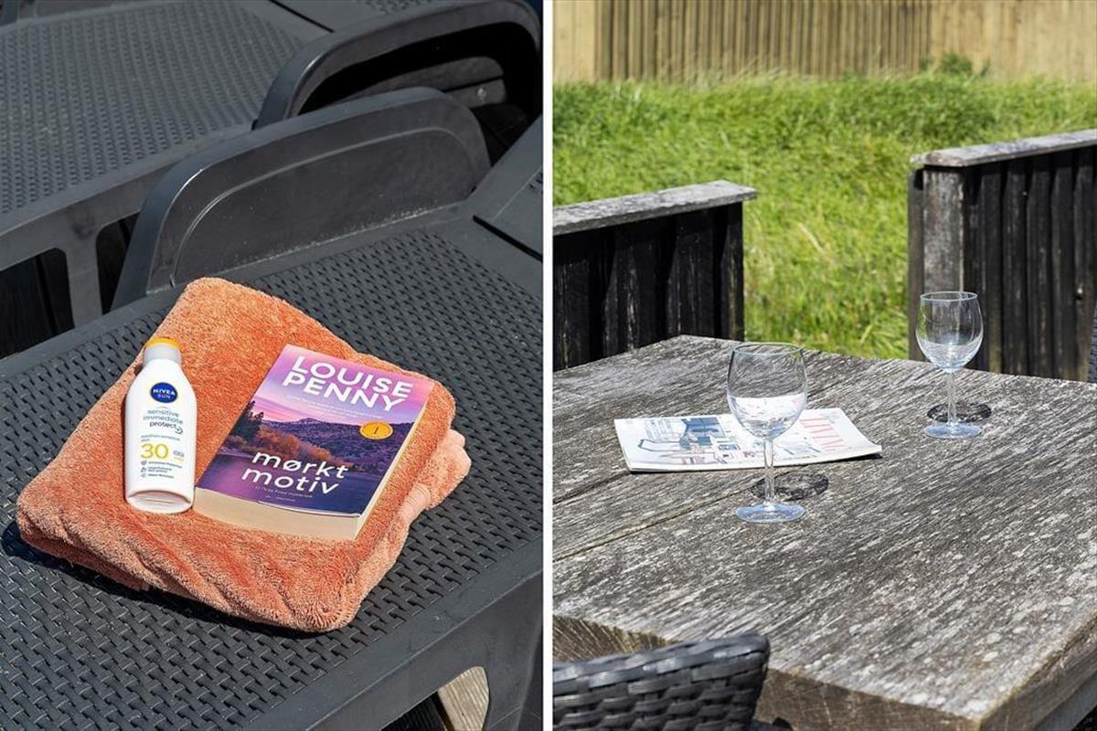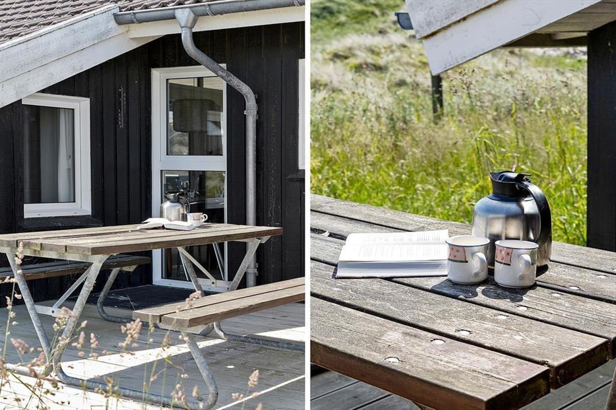 Zum Ferienhaus gehört ein großes Naturgrundstück mit Rasen und Dünen mit Strandhafer, ein schöner Ort zum Ballspielen oder Verstecken. Für die Kleinsten gibt es eine Schaukel. Vom Küchenbereich aus gelangt man auf eine kleinere, nach Osten ausgerichtete Terrasse, und vom Wohnzimmer hat man Zugang zu einer größeren, teilweise überdachten Terrasse, die Ruhe und Frieden bietet, sowie die Möglichkeit, sich auf den zahlreichen Liegestühlen zu sonnen. Mit nur etwas mehr als 200 Metern zum Westmeer kann man ständig das Rauschen des Wassers hören und den frischen Duft des Meeres wahrnehmen.