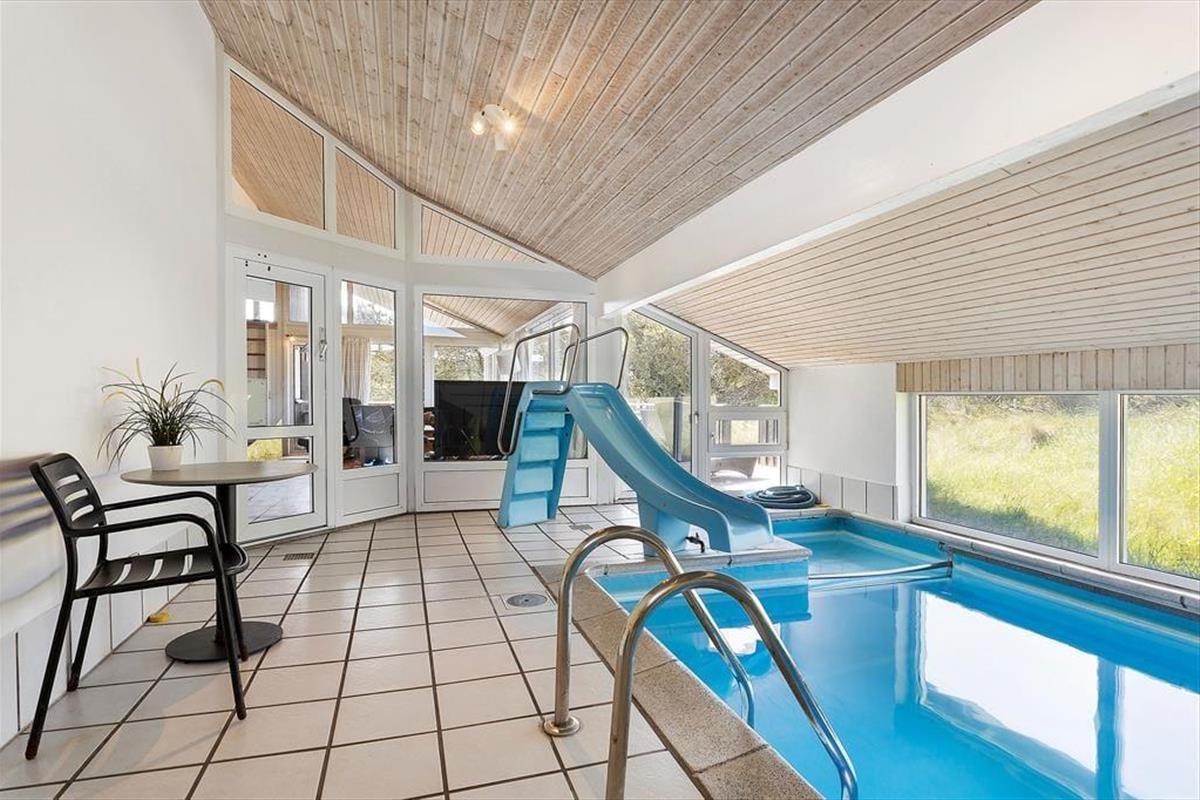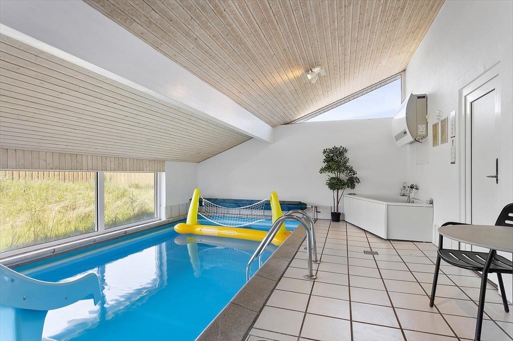Der herrliche Poolbereich wird sicherlich schnell zum Mittelpunkt des Urlaubs für die Kinder. Das Becken hat eine Größe von 12,5 m² und man kann sich vorsichtig über die Treppe dem Wasser nähern oder den schnellen Weg über die Rutsche nehmen. Für die Erwachsenen gibt es Entspannung im Spa oder in der Sauna im angrenzenden Badezimmer.