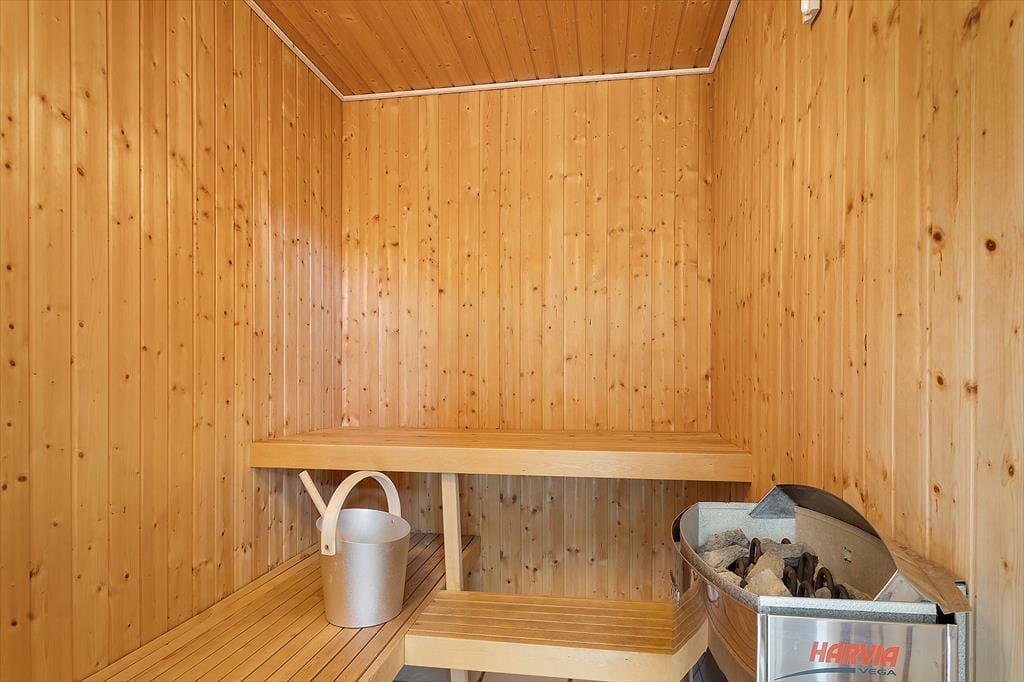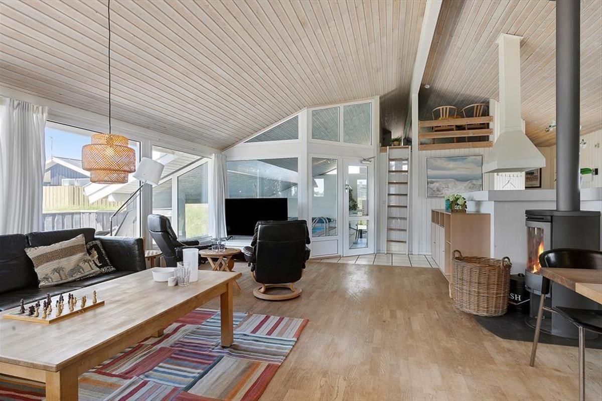 Das Ferienhaus ist schön und funktional eingerichtet, mit Zimmern und Badezimmern so verteilt, dass zwei Familien problemlos gemeinsam im Ferienhaus wohnen können und trotzdem ein wenig Privatsphäre haben. Der große Wohnbereich mit offener Küche, Essbereich und Wohnzimmer liegt zentral und wird schnell zum natürlichen Treffpunkt. Vom Wohnzimmer aus hat man einen Blick auf das Meer und auf den Poolbereich sowie Zugang zur Terrasse. Zu den kinderfreundlichen Annehmlichkeiten gehören ein Kinderbett, ein Hochstuhl, Waschmaschine, Trockner und kostenloses, drahtloses Internet (Fibernet 50/50). Vom Wohnzimmer aus gelangt man auf eine schöne Hems mit Sitzsäcken, wo man gemütlich verweilen kann. Der Kaminofen befindet sich zentral im Ferienhaus und sorgt an kühlen Tagen für Wärme und Gemütlichkeit. Für das Ferienhaus sind Brennholz inklusive, sodass die Verbrauchskosten niedrig gehalten werden können.