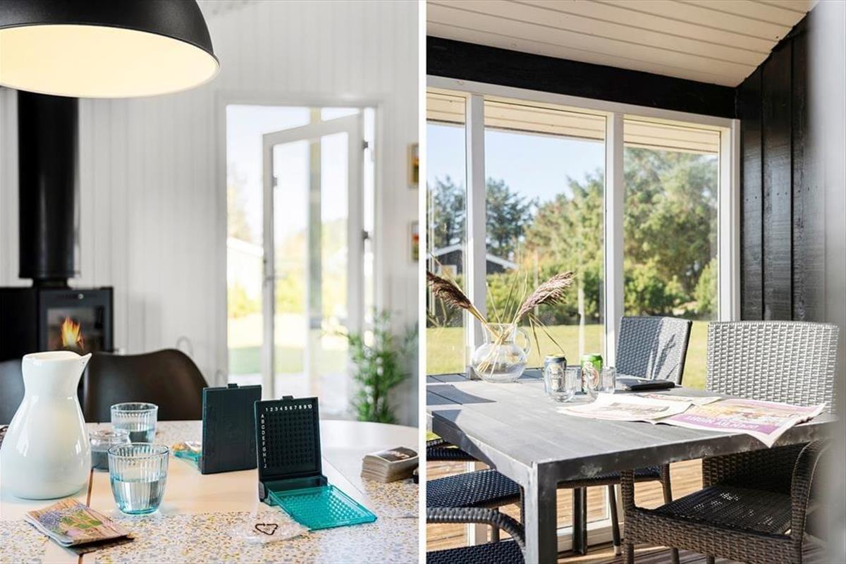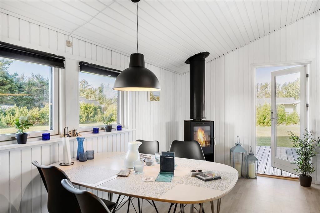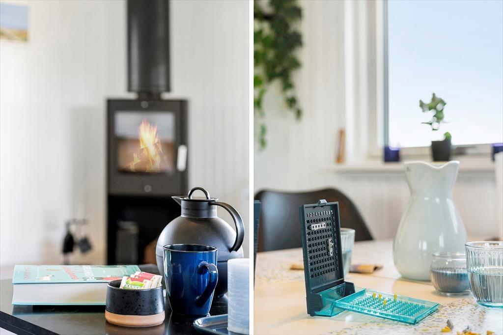 Im Inneren empfängt dich eine helle und warme Atmosphäre, die sofort zum Entspannen einlädt. Das Ferienhaus ist liebevoll und gemütlich eingerichtet, mit einem Auge fürs Detail – ideal für gemeinsame Zeit mit Familie oder Freunden. Der offene Grundriss zwischen Küche, Essbereich und Wohnzimmer macht es einfach, zusammen zu sein, auch wenn einige kochen, während andere spielen oder auf dem Sofa die Ruhe genießen. Im Wohnzimmer sorgt ein Kaminofen an kühleren Tagen für Wärme und Gemütlichkeit – das Knistern des Feuers und der Duft von Holz schaffen eine besondere Stimmung, wenn es draußen dunkel wird. Große Fenster lassen viel Licht herein und bieten einen schönen Blick in die umliegende Natur. Vom Wohnzimmer aus hast du direkten Zugang zur Terrasse – so lässt sich das Leben drinnen und draußen wunderbar verbinden.