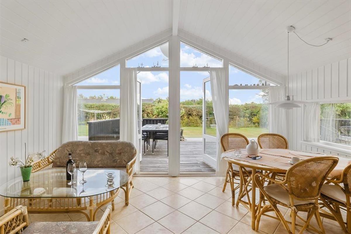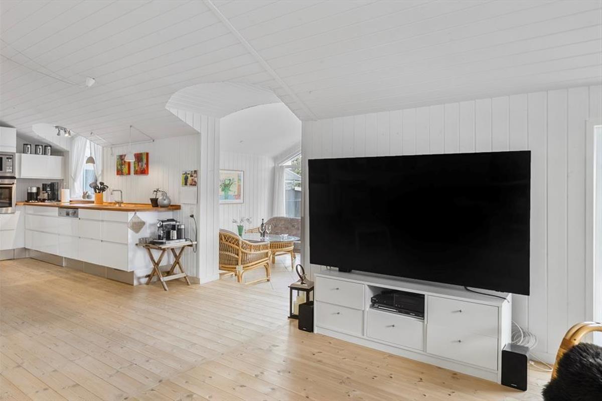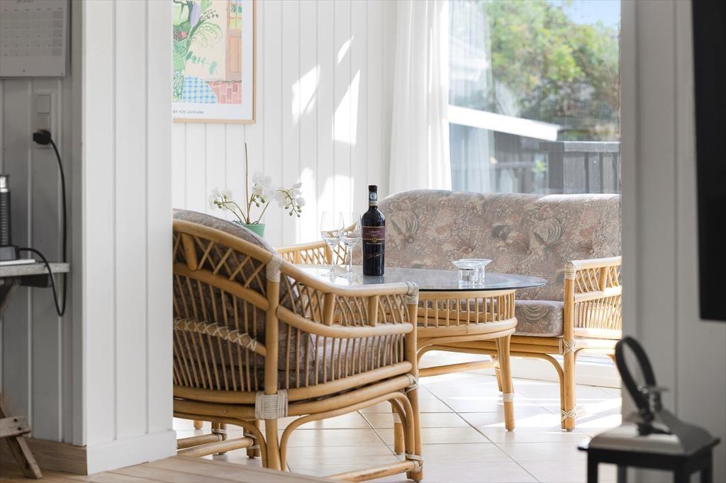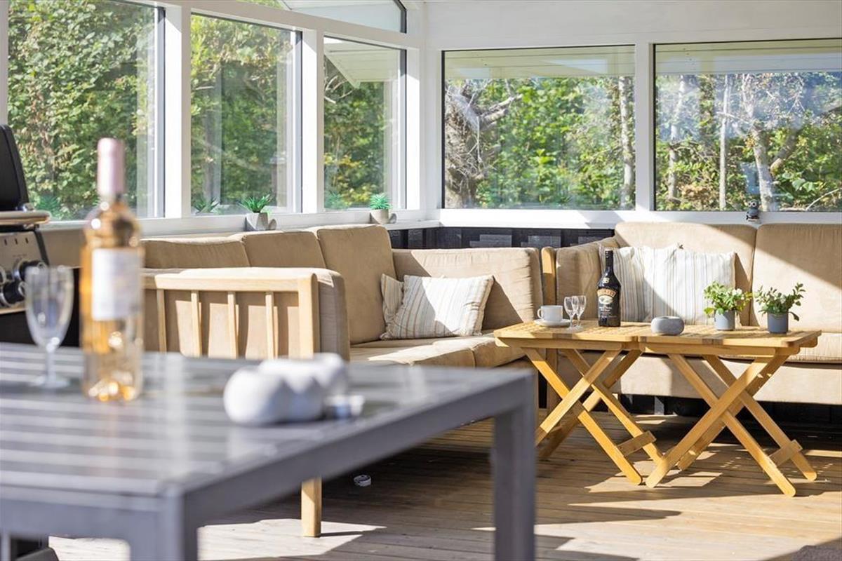 Das Ferienhaus ist durchdacht eingerichtet, sodass das Licht hereinströmt und jeder Quadratmeter optimal genutzt wird. Die hellen Räume schaffen eine leichte und einladende Stimmung, und von zwei der Schlafzimmer kannst du direkt auf die Terrasse treten und den Tag unter freiem Himmel beginnen. Eines der Zimmer verfügt sogar über ein elektrisch verstellbares Doppelbett, sodass der Komfort auch in den Ruhephasen auf höchstem Niveau ist. Küche und Wohnzimmer sind in einem offenen Wohnbereich zusammengefasst, in dem Gespräche und gemeinsames Beisammensein ihren Platz finden, während das Essen zubereitet wird. Von hier aus gelangst du in einen gemütlichen, geschlossenen Wintergarten, der die Saison verlängert und es ermöglicht, die Natur auch an kühleren Tagen zu genießen.