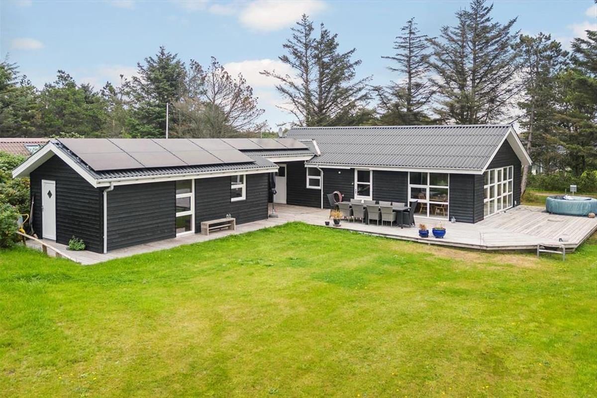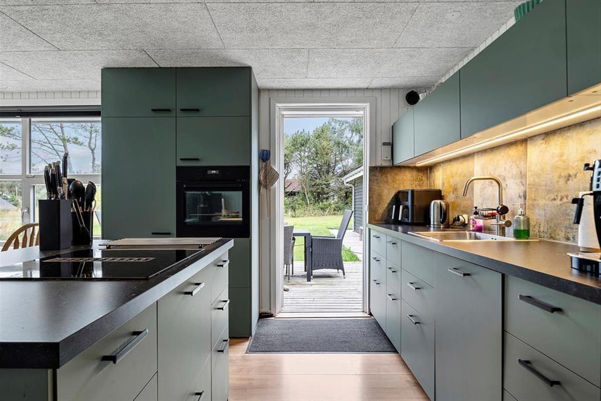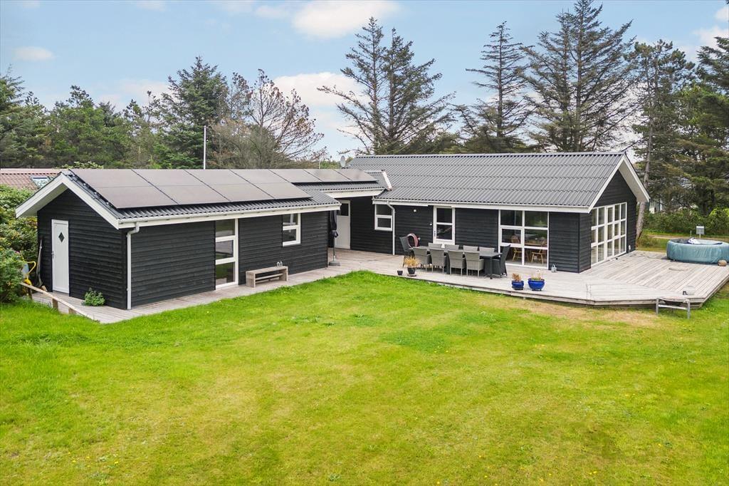Die Terrasse verbindet das Haus und den Annex auf harmonische Weise und wird im Sommerhalbjahr schnell zum Mittelpunkt des Familienlebens. Hier könnt ihr lange Sommermorgen mit Kaffee und Brötchen genießen, während die ersten Sonnenstrahlen die Terrasse erreichen, oder den Tag mit Grillgerichten ausklingen lassen, während die Kinder auf dem Rasen spielen. Auf dem Naturgrundstück rund um das Ferienhaus herrscht eine ruhige und entspannte Atmosphäre, in der du den Vögeln lauschen und die besondere Ruhe spüren kannst, für die Grønhøj bekannt ist. Nach einem Ausflugstag oder einem Bad in den Wellen ist es herrlich, sich auf die Terrasse zurückzuziehen, einen Liegestuhl zu nehmen und in ein gutes Buch einzutauchen – oder einfach die frische Meeresluft zu genießen, die hier in der Nähe der Nordsee allgegenwärtig ist.