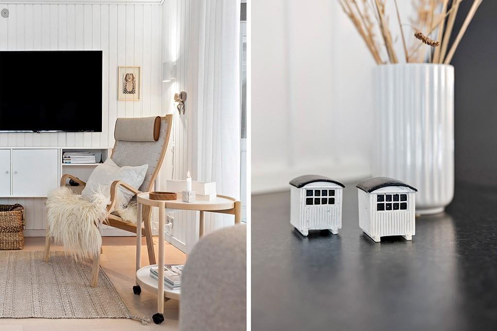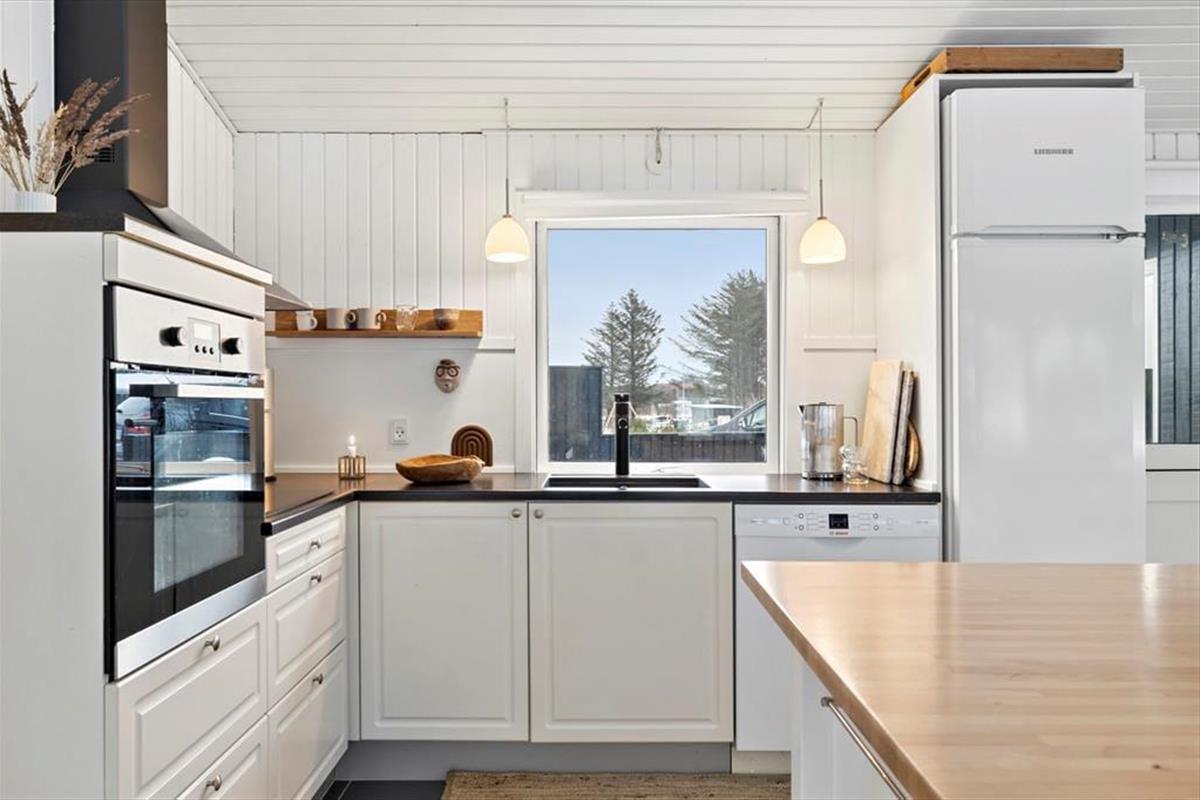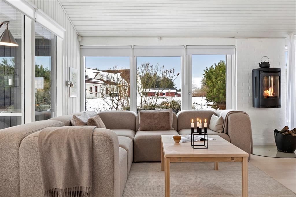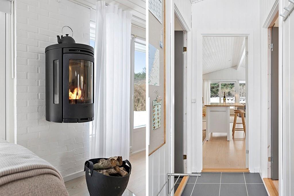 Das Ferienhaus ist mit Fokus auf Licht, Gemütlichkeit und gute Rahmenbedingungen für gemeinsame Zeit eingerichtet. Das Herz des Hauses ist das Wohnzimmer, das in offener Verbindung mit der stilvollen und geräumigen Küche liegt. Hier kannst du mit lokalen Zutaten zaubern, während am Esstisch angeregt geplaudert wird, oder ihr macht es euch gemeinsam auf dem Sofa gemütlich und lasst den knisternden Kaminofen am Abend die Stimmung bestimmen. Der Grundriss bietet reichlich Platz für die Familie mit zwei schönen Schlafzimmern, einem gemütlichen Annex sowie zwei modernen Badezimmern. Das ganze Haus strahlt eine entspannte Ferienhausatmosphäre aus, in der man sich vom ersten Moment an zu Hause fühlt.