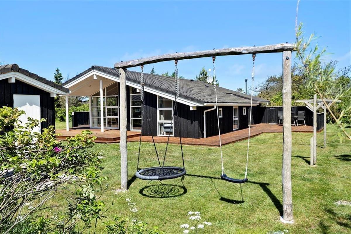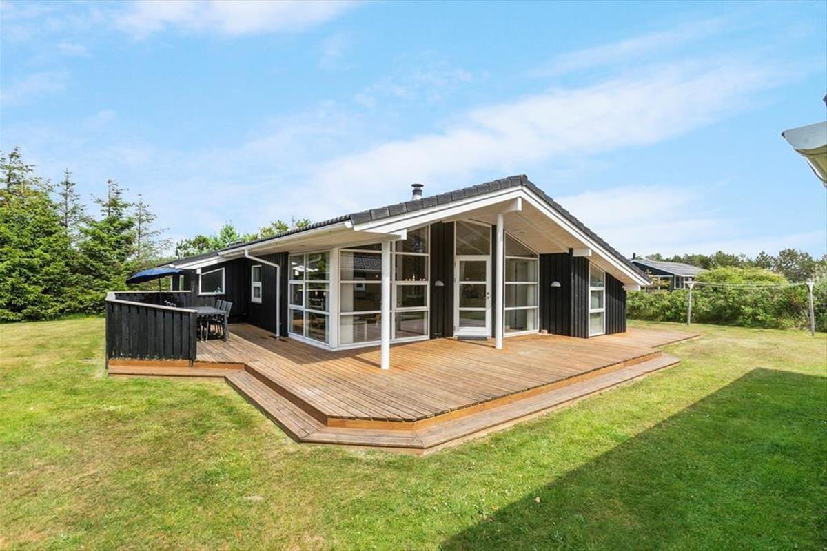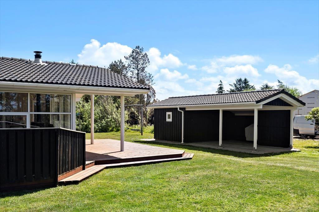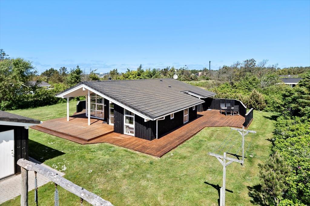 Das Ferienhaus liegt auf einem großen, ungestörten Rasenstück mit Platz zum Spielen, Laufen und Ballspielen. Das Haus ist von schönen, großen Terrassen auf drei Seiten – nach Süden, Osten und Westen – umgeben, wo man die Sommersonne und Wärme genießen kann. Die Terrasse im Süden hat einen kleinen überdachten Bereich. Vom Eingangsbereich aus gelangt man auch zur nach Osten ausgerichteten Terrasse und zum 4. Schlafzimmer.