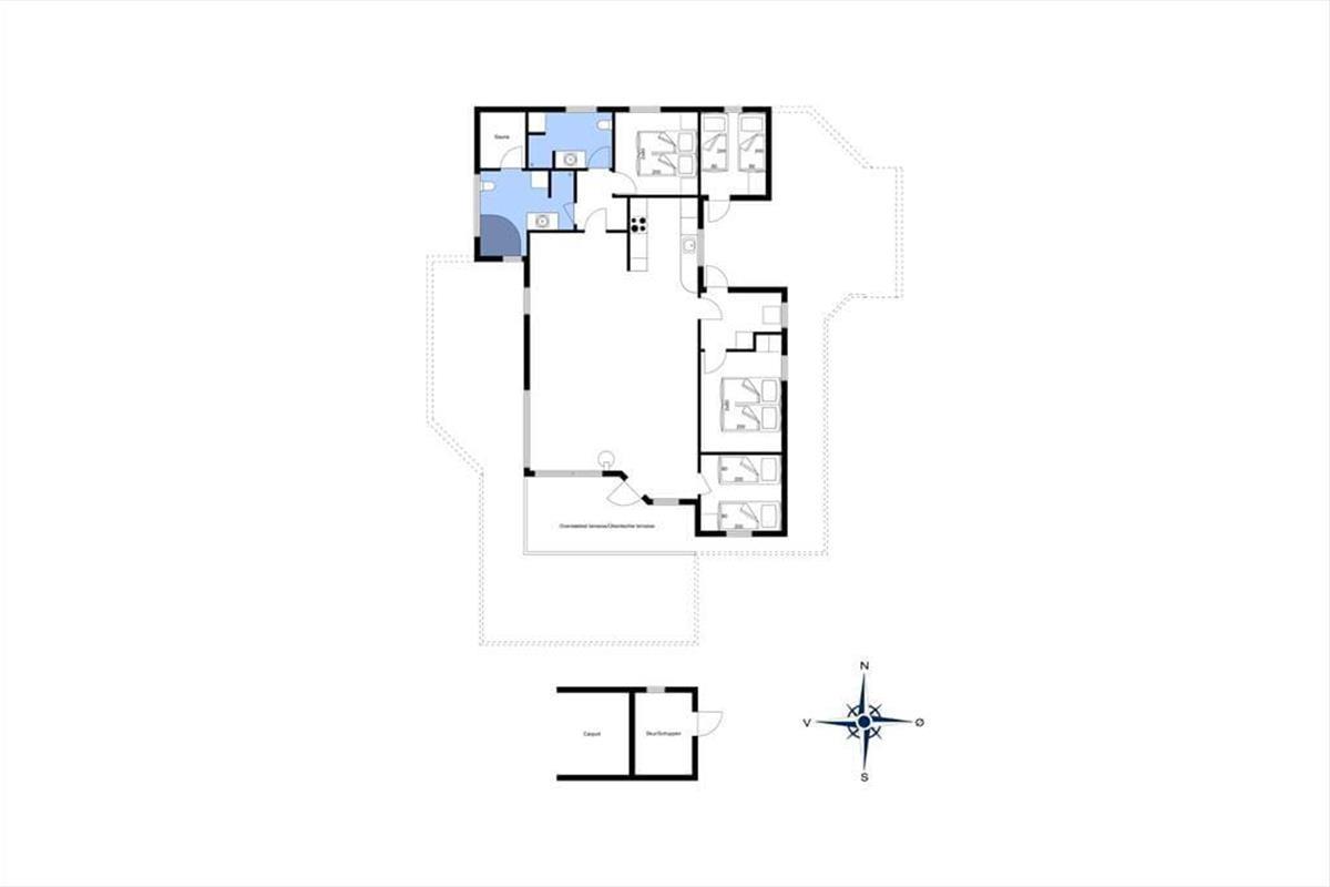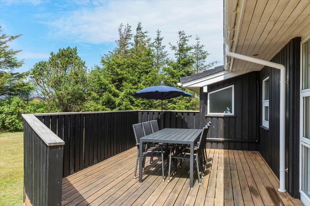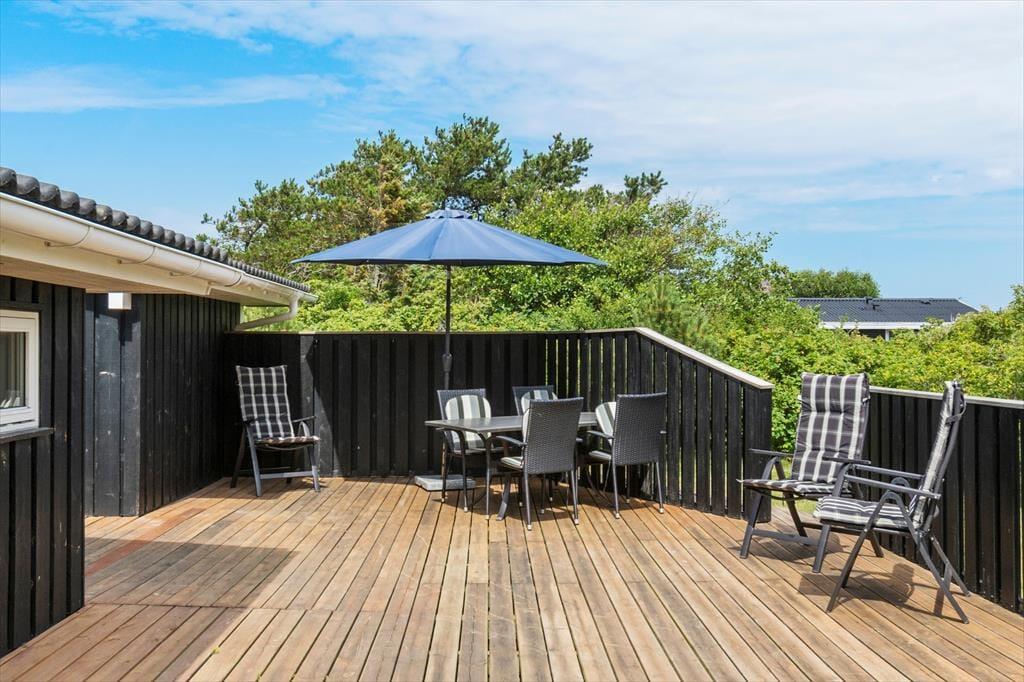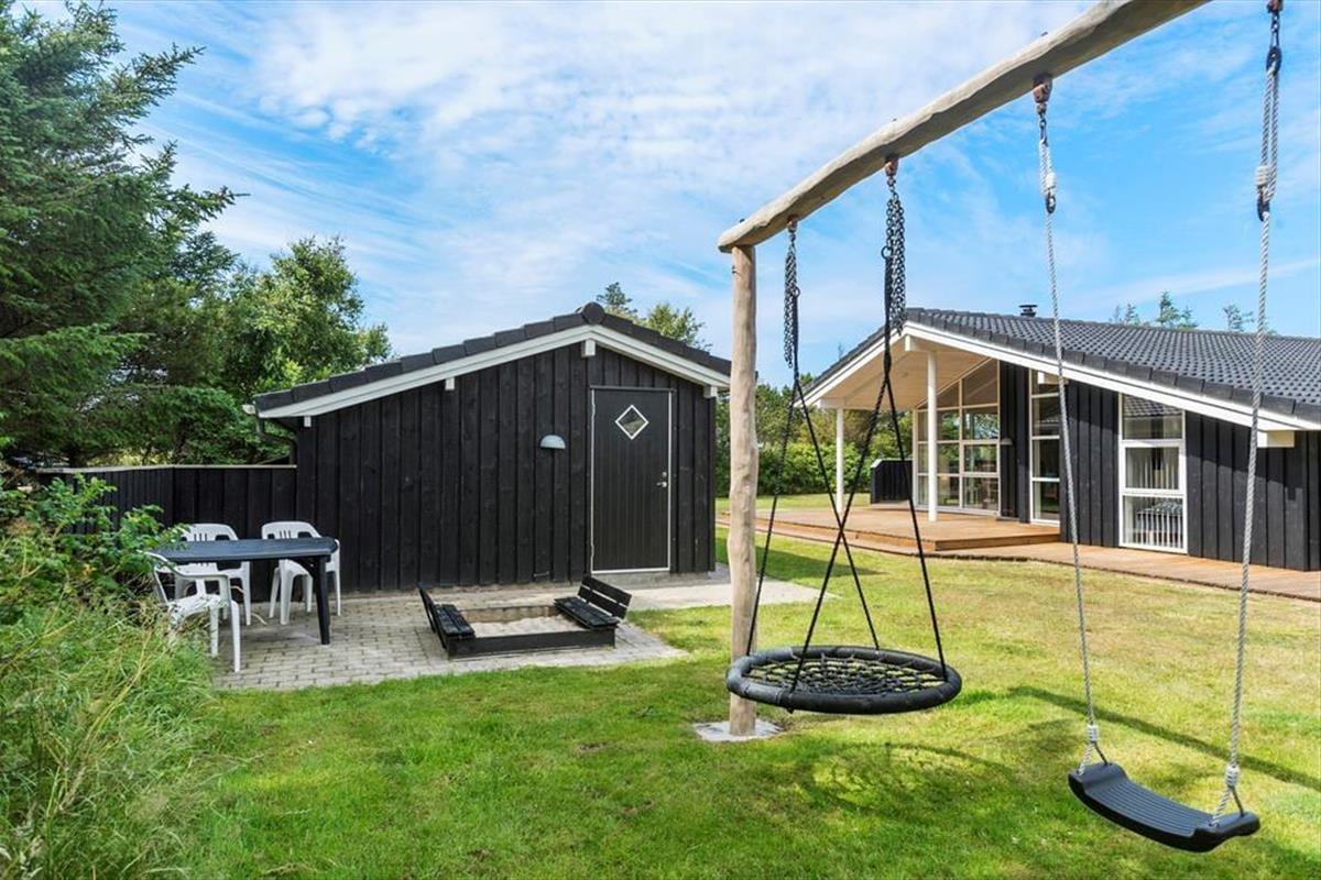 Das Ferienhaus liegt auf einem großen, ungestörten Rasenstück mit Platz zum Spielen, Laufen und Ballspielen. Das Haus ist von schönen, großen Terrassen auf drei Seiten – nach Süden, Osten und Westen – umgeben, wo man die Sommersonne und Wärme genießen kann. Die Terrasse im Süden hat einen kleinen überdachten Bereich. Vom Eingangsbereich aus gelangt man auch zur nach Osten ausgerichteten Terrasse und zum 4. Schlafzimmer.