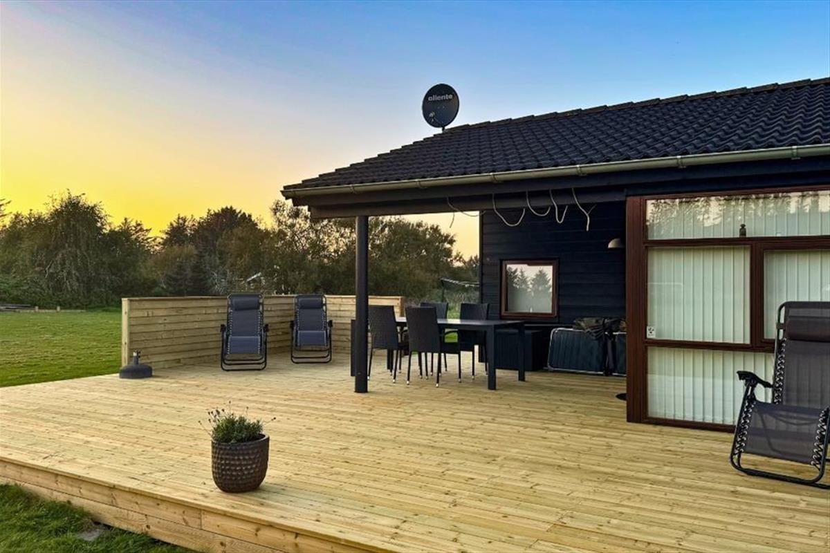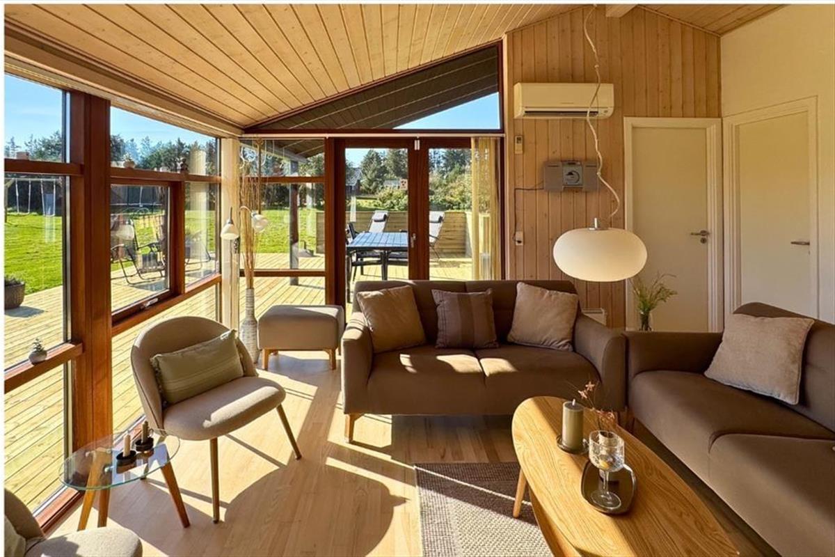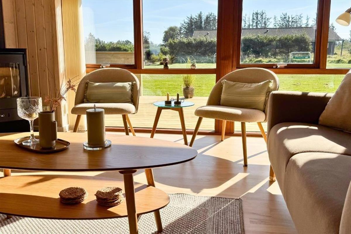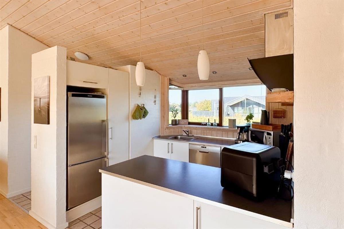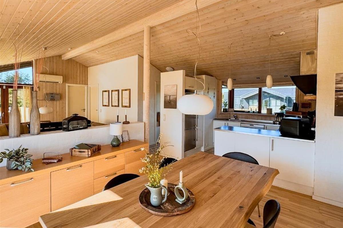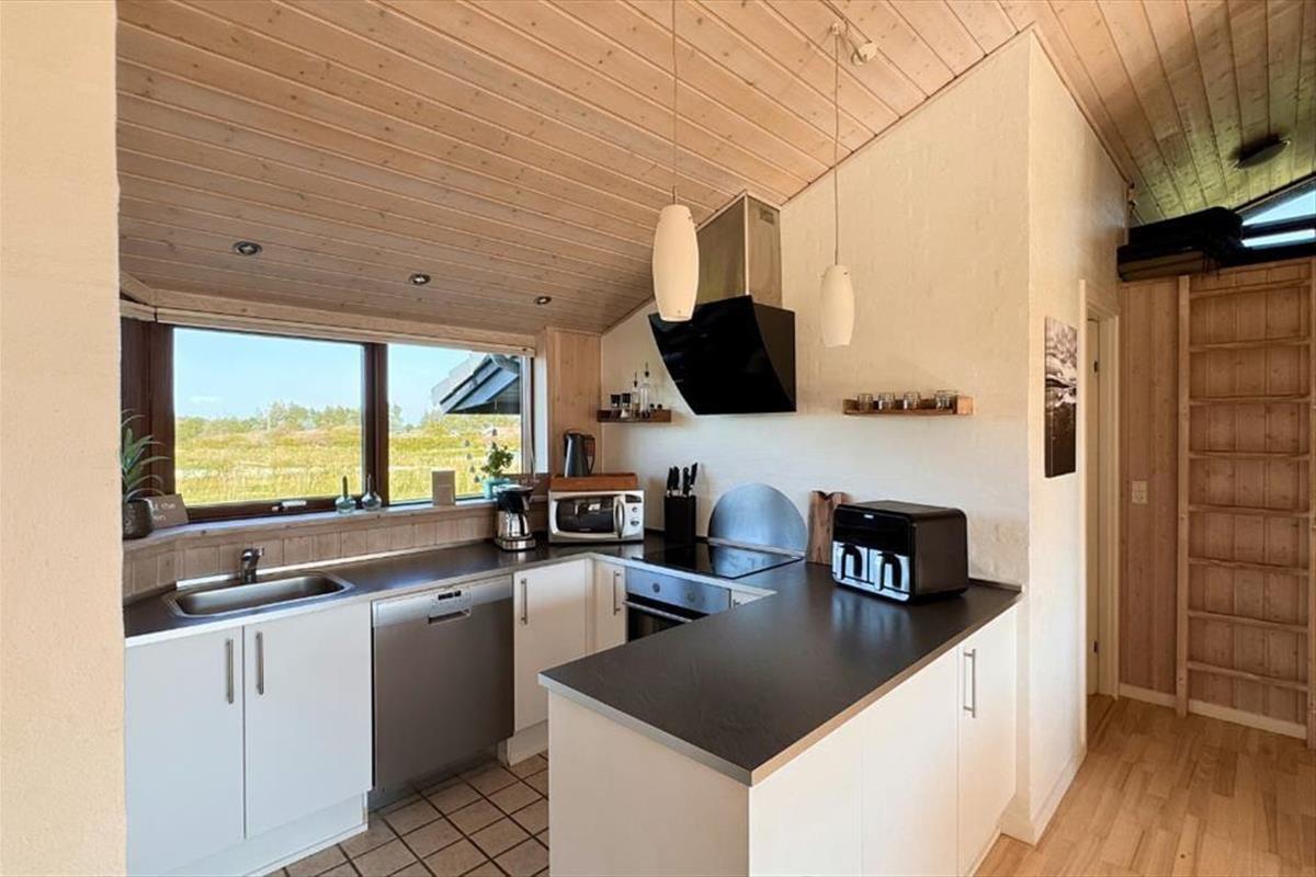 Vom Flur aus gelangen Sie zu einem der beiden schönen Badezimmer des Ferienhauses sowie zum Wohnzimmer. Das Wohnzimmer hat ein Giebeldach und viele Panoramafenster, die das ganze Jahr über eine herrlich helle Atmosphäre schaffen. Das Wohnzimmer ist außerdem mit einer Soundbar ausgestattet, die einen ausgezeichneten Klang bietet. Die offene, gut ausgestattete Küche ist mit dem Essbereich verbunden, der durch eine halbhohe Wand vom Wohnzimmer abgetrennt ist. In der Küche befindet sich eine Airfryer, die das Kochen erleichtert. Vom Wohnzimmer aus haben Sie Zugang zu einer schönen Terrasse vor dem Haus. Im Osten liegt eines der drei Schlafzimmer des Hauses mit einem guten Doppelbett sowie das große Badezimmer mit Whirlpool und Sauna. Hier befindet sich auch das Hausdach mit 2 Matratzen. Am anderen Ende des Hauses befinden sich die beiden anderen Schlafzimmer, die ebenfalls mit guten Doppelbetten ausgestattet sind. Das Haus ist mit einer Wärmepumpe ausgestattet, sehr energieeffizient und für die ganzjährige Vermietung geeignet. Ein Haus, in dem man sich sofort wohlfühlt und das definitiv den Rahmen für einen schönen Urlaub bieten kann. Das Haus enthält sowohl Sommer- als auch Winterdecken.