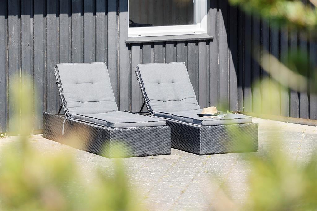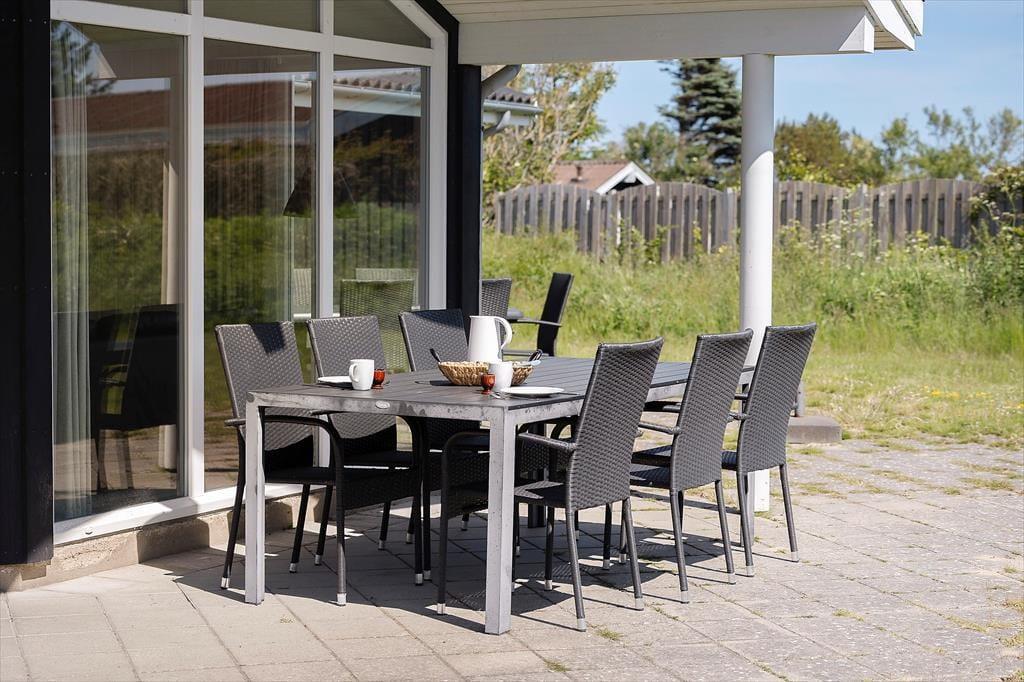 Vom Wohnzimmer aus hat man Zugang zur großen und schönen Terrasse des Ferienhauses, die sich auf mehreren Seiten erstreckt. Auf der Südseite ist die Terrasse teilweise überdacht, was besonders angenehm ist am Abend, wenn der Tau fällt und man noch eine Stunde oder zwei vom Tag genießen möchte. Das Grundstück bietet viel Platz für Spiel und Sport, und selbstverständlich stehen Gartenmöbel und ein Grill zur Verfügung.