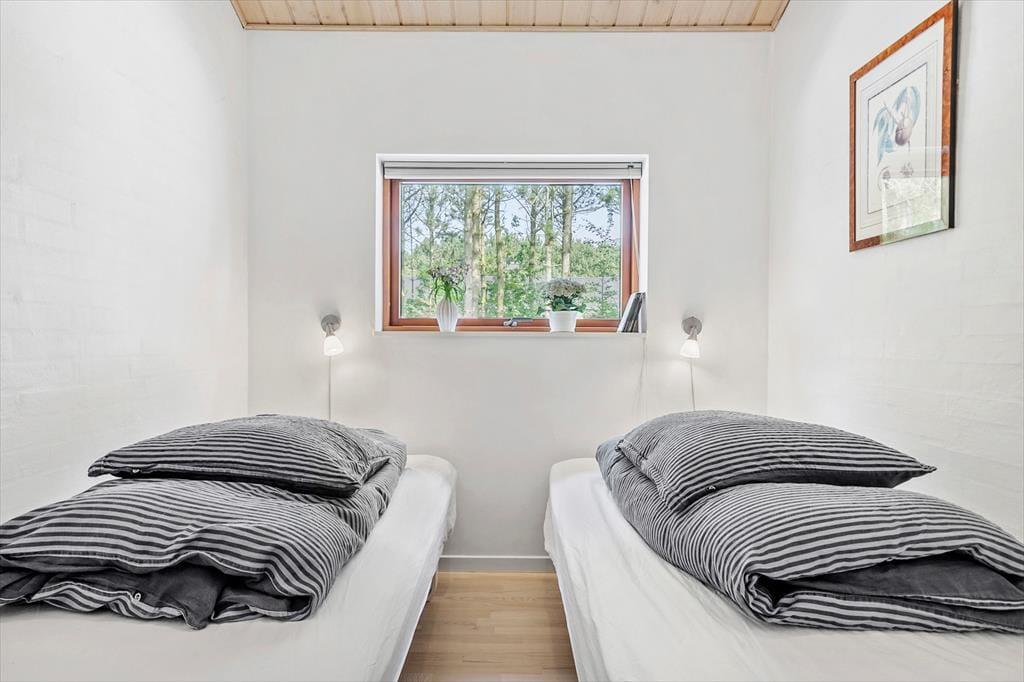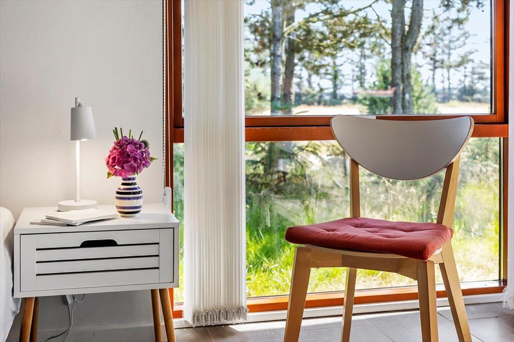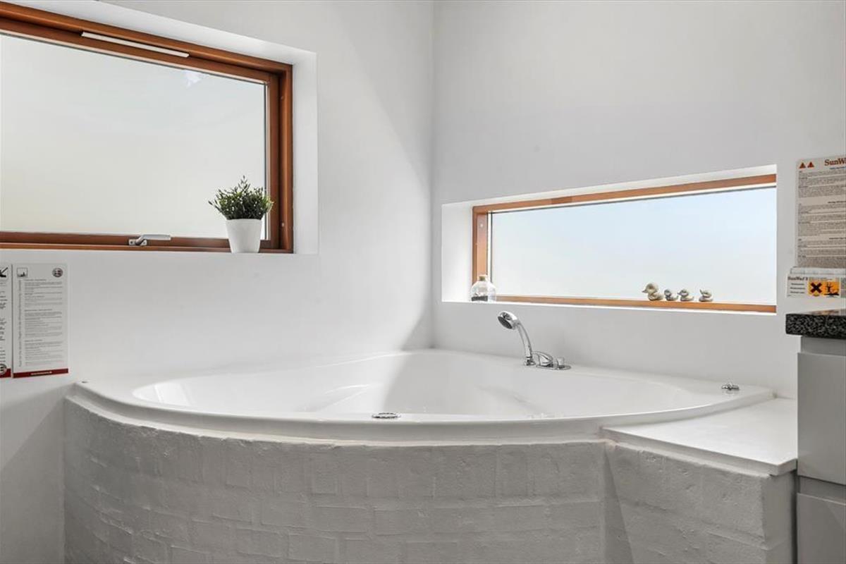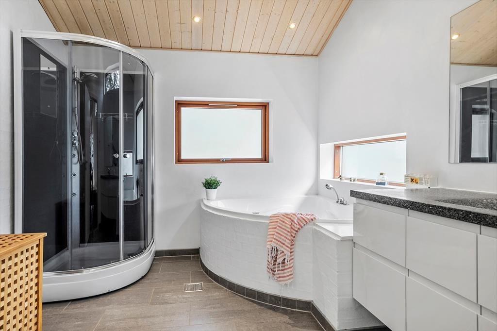 Beim Betreten dieses Ferienhauses wird einem zuerst der Kamin auffallen, der vor der großen Fensterfront steht – von hier aus wird im Winter viel Wärme und Gemütlichkeit verbreitet. Das Haus ist modern und hell eingerichtet. Die gut ausgestattete Küche ist offen mit dem Wohnzimmer und dem Essbereich verbunden. Die fantastischen Panoramafenster lassen Licht und Natur herein, sodass man die Aussicht auf die umliegende Natur genießen kann. Vom Wohnzimmer aus gelangt man in die vier Schlafzimmer des Hauses – zwei mit Doppelbetten und zwei mit Boxspringbetten. Es gibt zwei Badezimmer, eines davon ist mit einer neuen Dusche und einem luxuriösen Whirlpool ausgestattet, der auf jeden Fall dabei helfen wird, einen entspannten Urlaub in der schönen Gegend von Grønhøj Strandpark zu genießen. Außerdem gibt es eine Waschmaschine und einen Trockner, die nach den vielen Badeausflügen sicher von Nutzen sein werden.