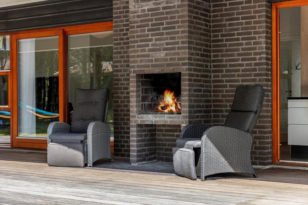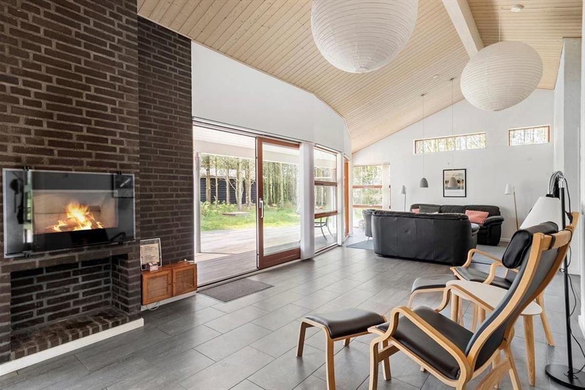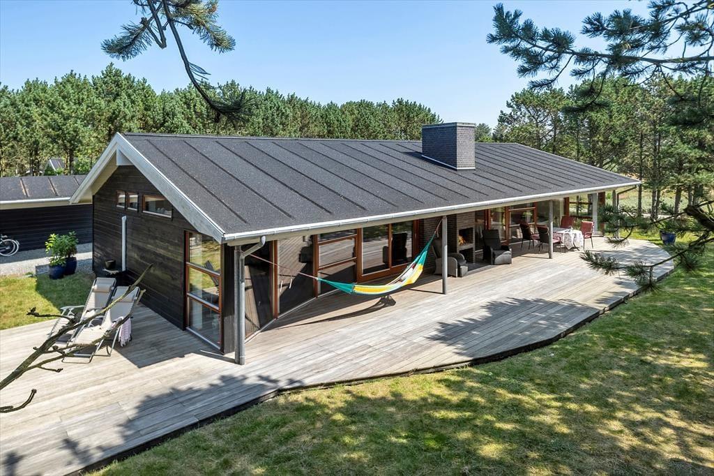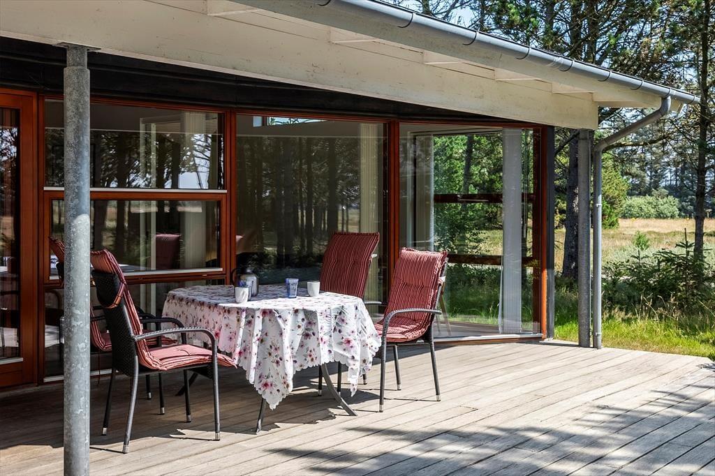 Umgeben von einem schönen, ebenen Naturgrundstück mit Bäumen rund um das Haus, bietet dies eine fantastische Möglichkeit für ein Naturerlebnis, sei es, um im Herbst Tannenzapfen zu sammeln oder im Sommer die Sonne zu genießen. Vom Wohnzimmer aus gelangt man auf eine herrliche, teilweise überdachte Terrasse nach Westen, die sich perfekt für gemütliche Grillabende eignet. Gartenmöbel, Grill und Liegestühle können von den Ferienhausgästen frei genutzt werden.