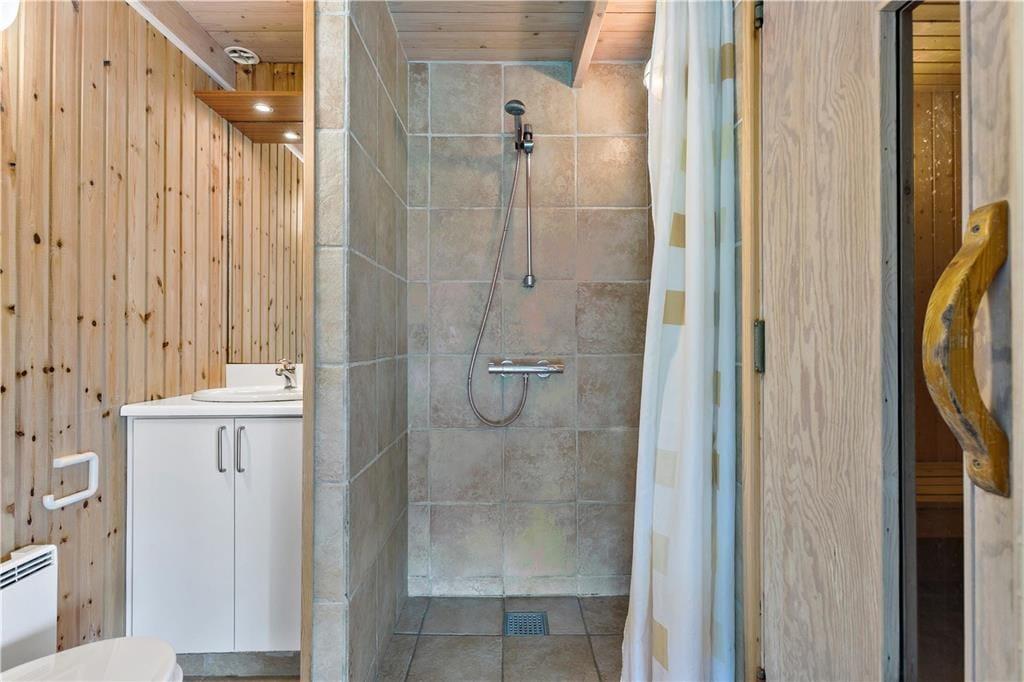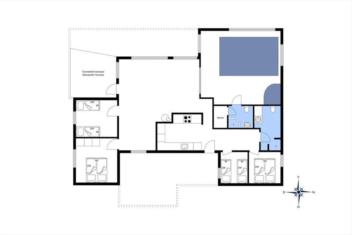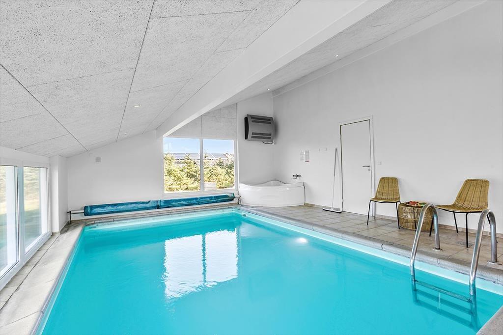 Vom Wohnzimmer aus gelangt man in den Poolraum des Ferienhauses. Ein schöner Raum mit viel Licht und Blick auf den Garten durch große Fenster. Das Becken ist 19 m² groß und bietet viel Platz zum Planschen und Spielen. Wenn das Wasser etwas zu kalt wird, kann man die warme Sauna im angrenzenden Badezimmer nutzen. Für die Erwachsenen empfehlen wir, den Whirlpool aufzufüllen und nach einem langen Tag am Strand oder im Wald die Muskeln zu entspannen.