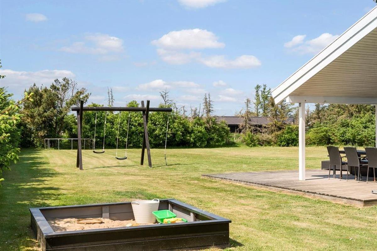 Auf dem großen Naturgrundstück ist fast garantiert, dass es draußen viel Spaß gibt. Mit einem Spielhaus, Sandkasten, Schaukel und Trampolin sind alle Möglichkeiten gegeben. Das Ferienhaus liegt gut geschützt von den hohen Bäumen, die das Grundstück umgeben, und die Sonne kann auf den beiden Terrassen genossen werden. Die eine im südöstlichen Eck hat einen überdachten Teil, die andere, nach Osten ausgerichtete, ist ideal für den Morgenkaffee.