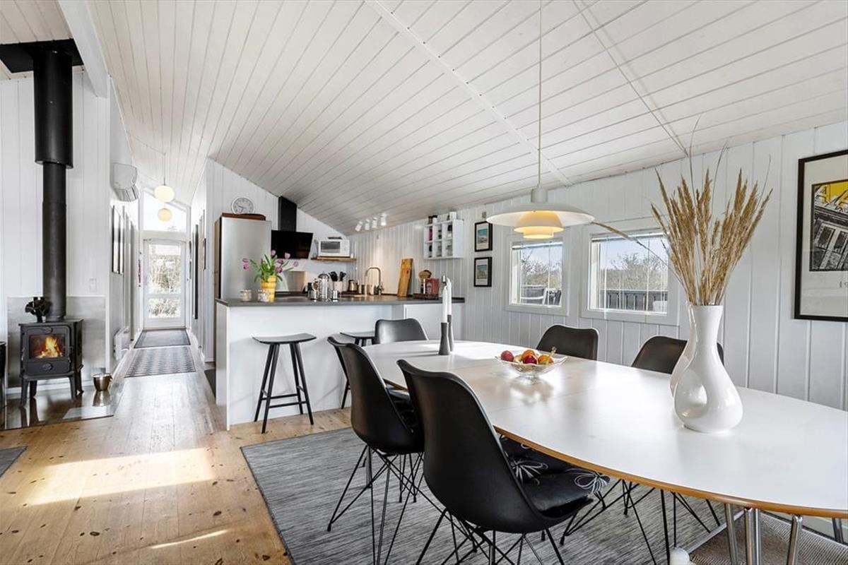 Das Ferienhaus hat eine gute, zeitgemäße Einrichtung und ist mit allem ausgestattet, das für gelungene Urlaubstage erforderlich ist. Im Jahr 2023 wurde eine neue Küche gebaut, und in der großen, offenen Wohnküche kann gemeinsam gekocht, gegessen, gespielt, auf den Sofas entspannt und vor dem Kamin sich gewärmt werden. Zudem sind drei Schlafräume und ein Badezimmer mit Dusche vorhanden. Die meisten Leuchtmittel sind LED-Lampen und zusammen mit der installierten Wärmepumpe sind die Verbrauchskosten des Hauses gering.