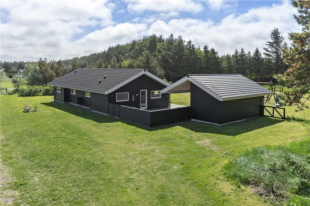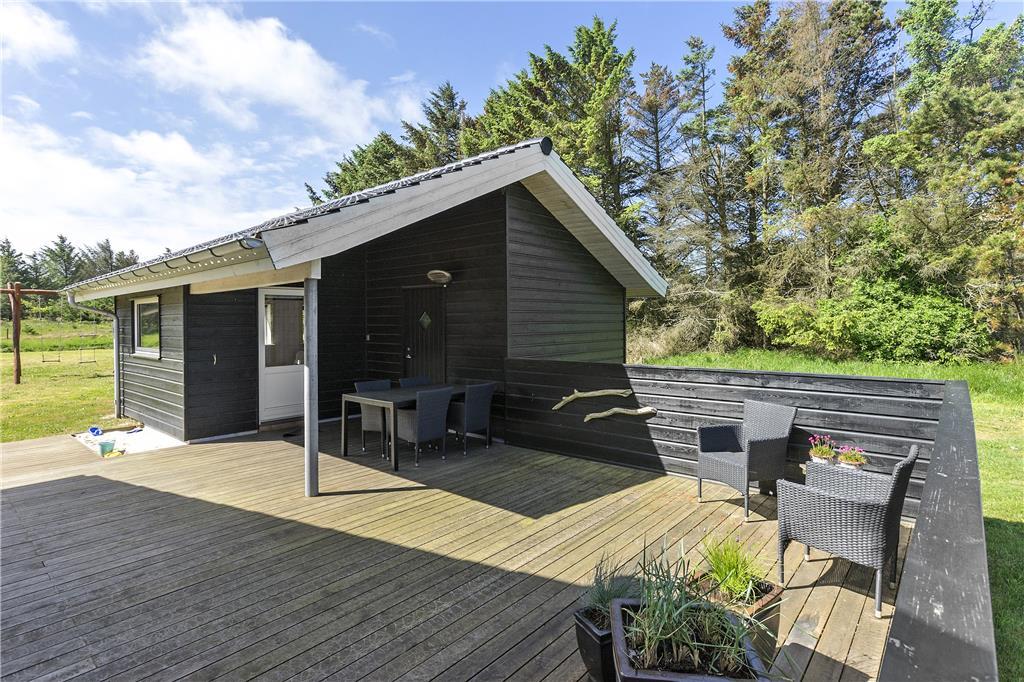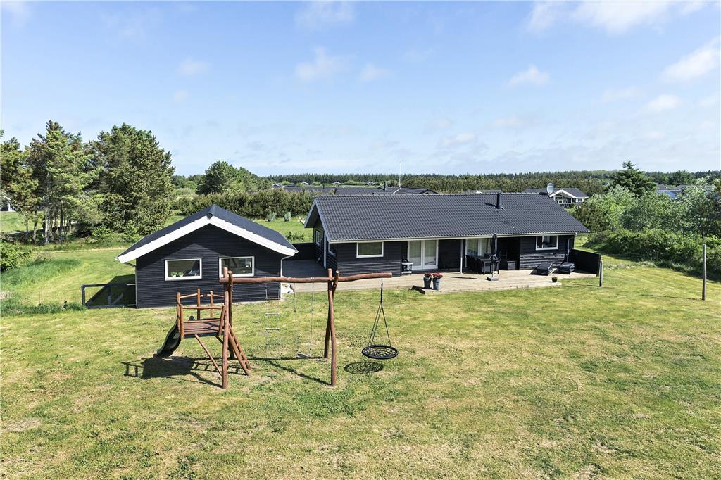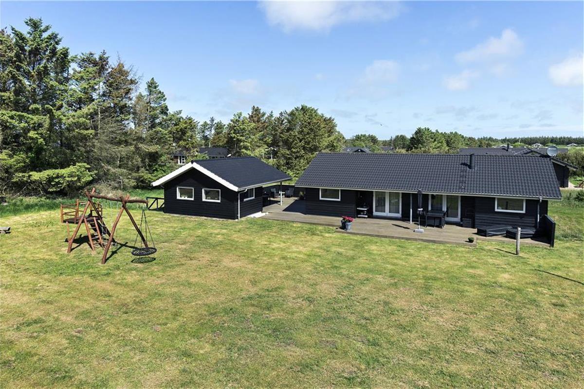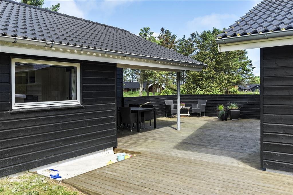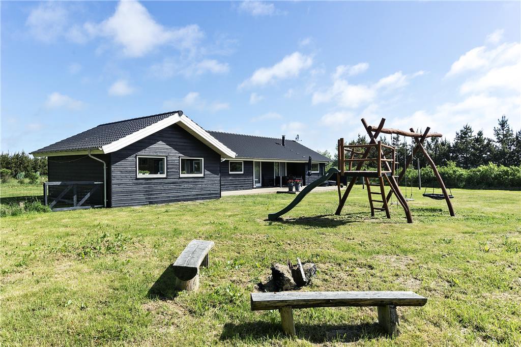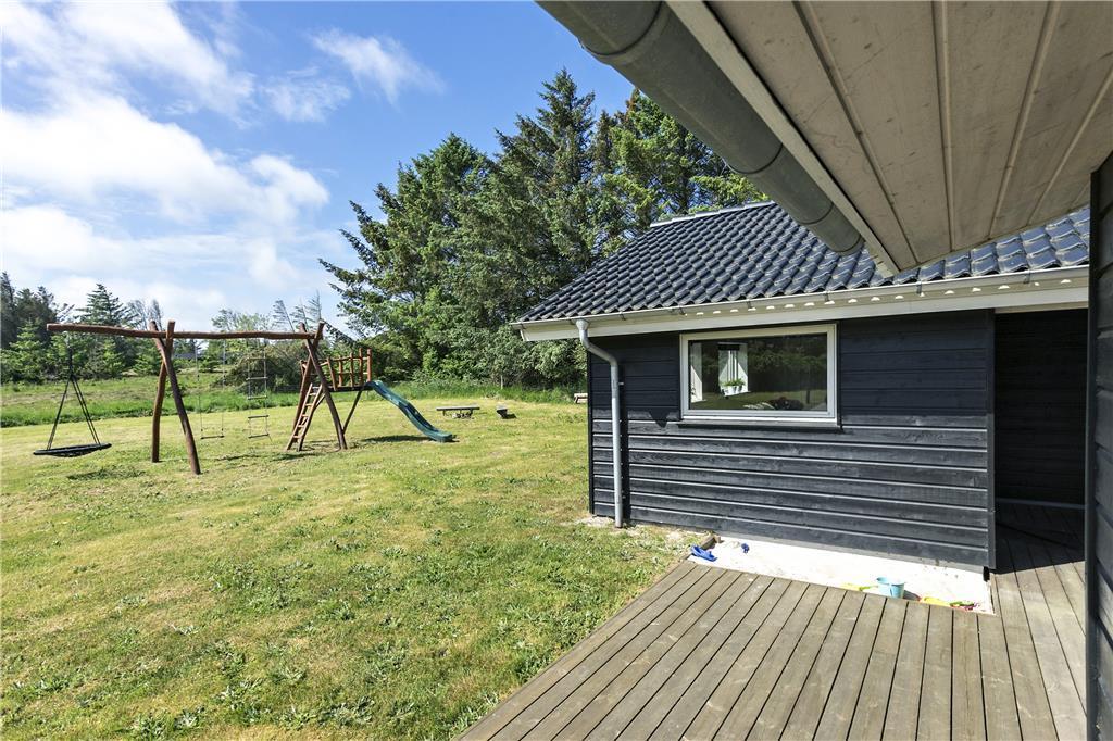 Sommerhuset er omgivet af en stor og rummelig terrasse, hvoraf en del er overdækket. Terrassen er naturligvis bygget, så den binder huset sammen med det store anneks. Den store naturgrund er omkranset af træer og ligger op til et dejligt naturområde, og på plænen er lavet forskellige aktivitetsmuligheder for såvel børn som barnlige sjæle. Hundehegn er til rådighed i huset.