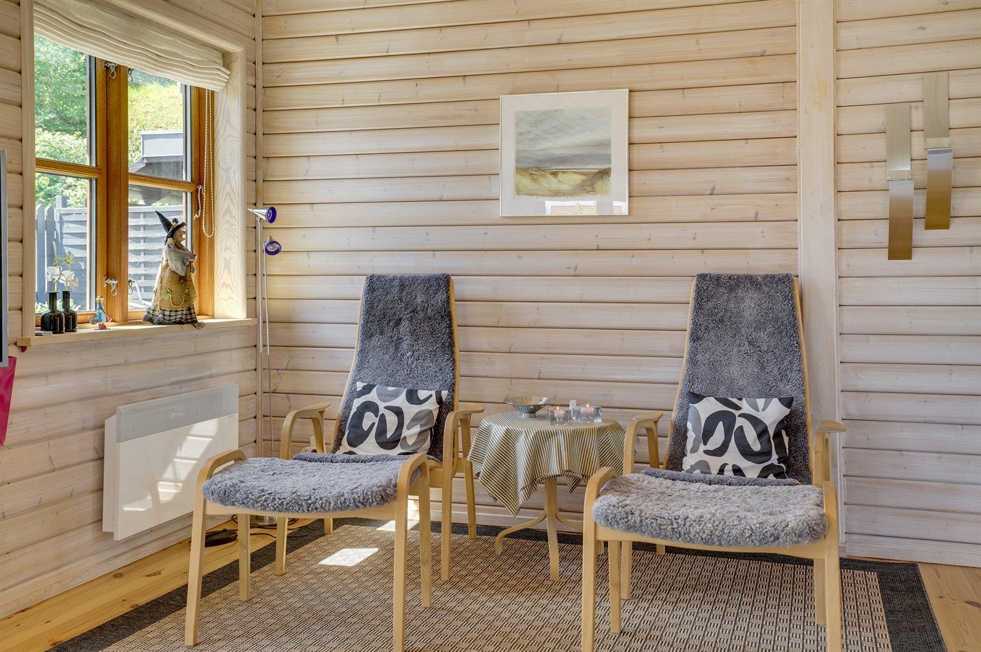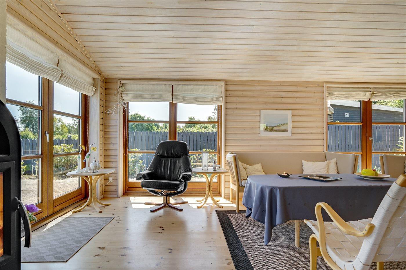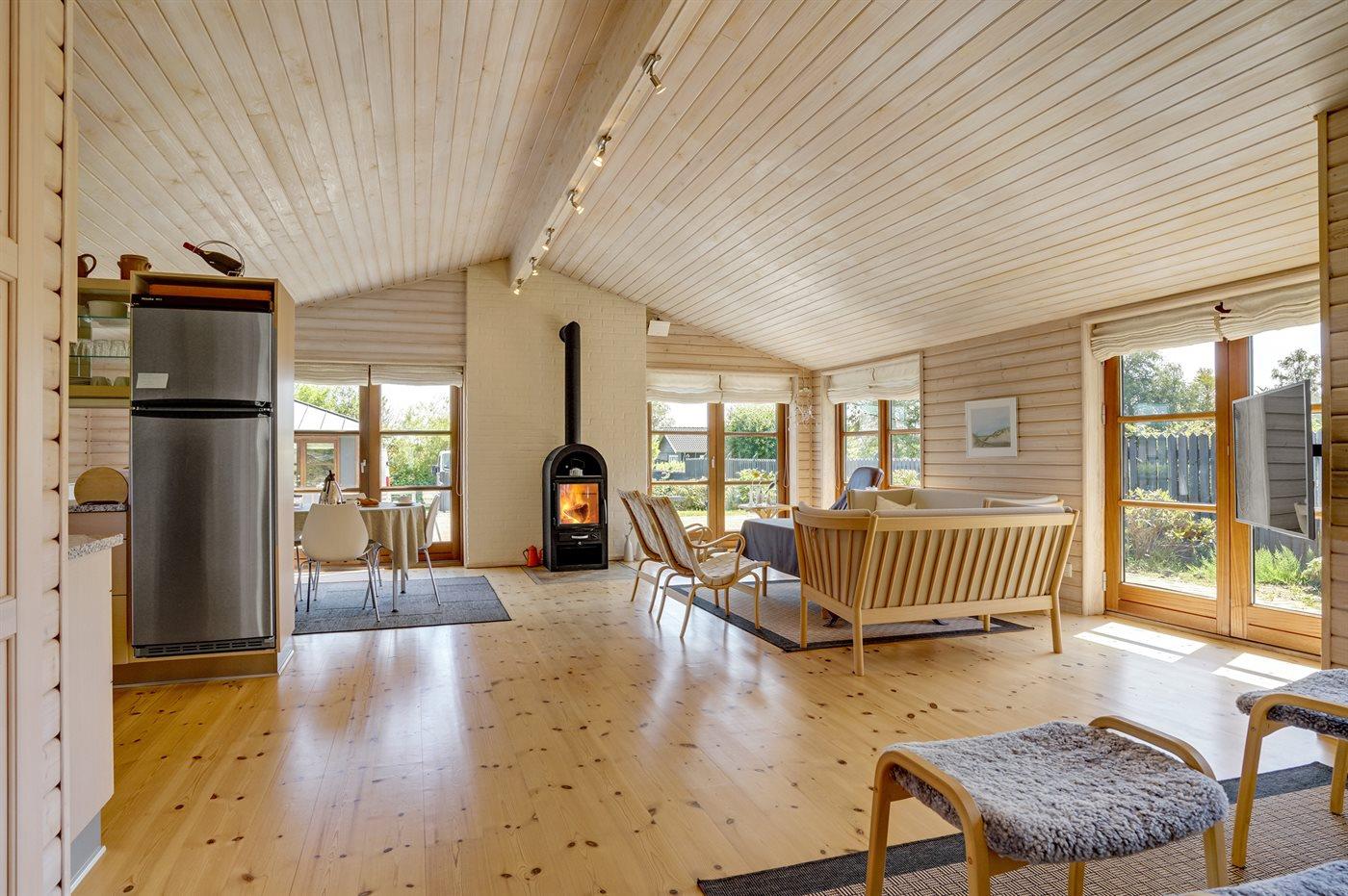 Gezellig vakantiehuis in Sjølund met zeezicht, 2 badkamers, houtkachel en groot terras, ideaal voor een ontspannen verblijf.