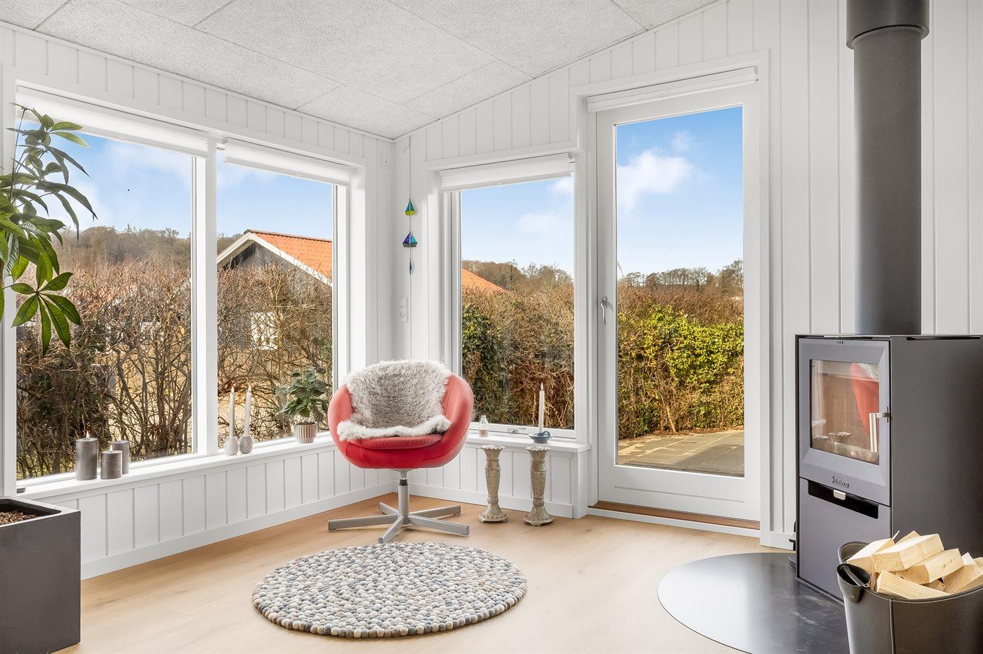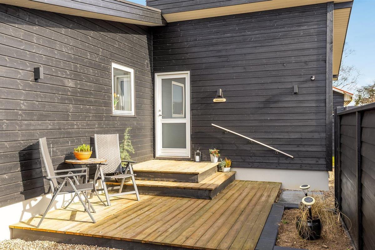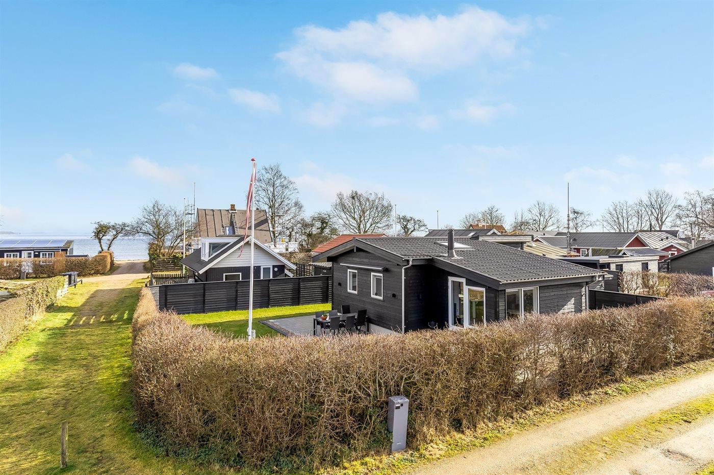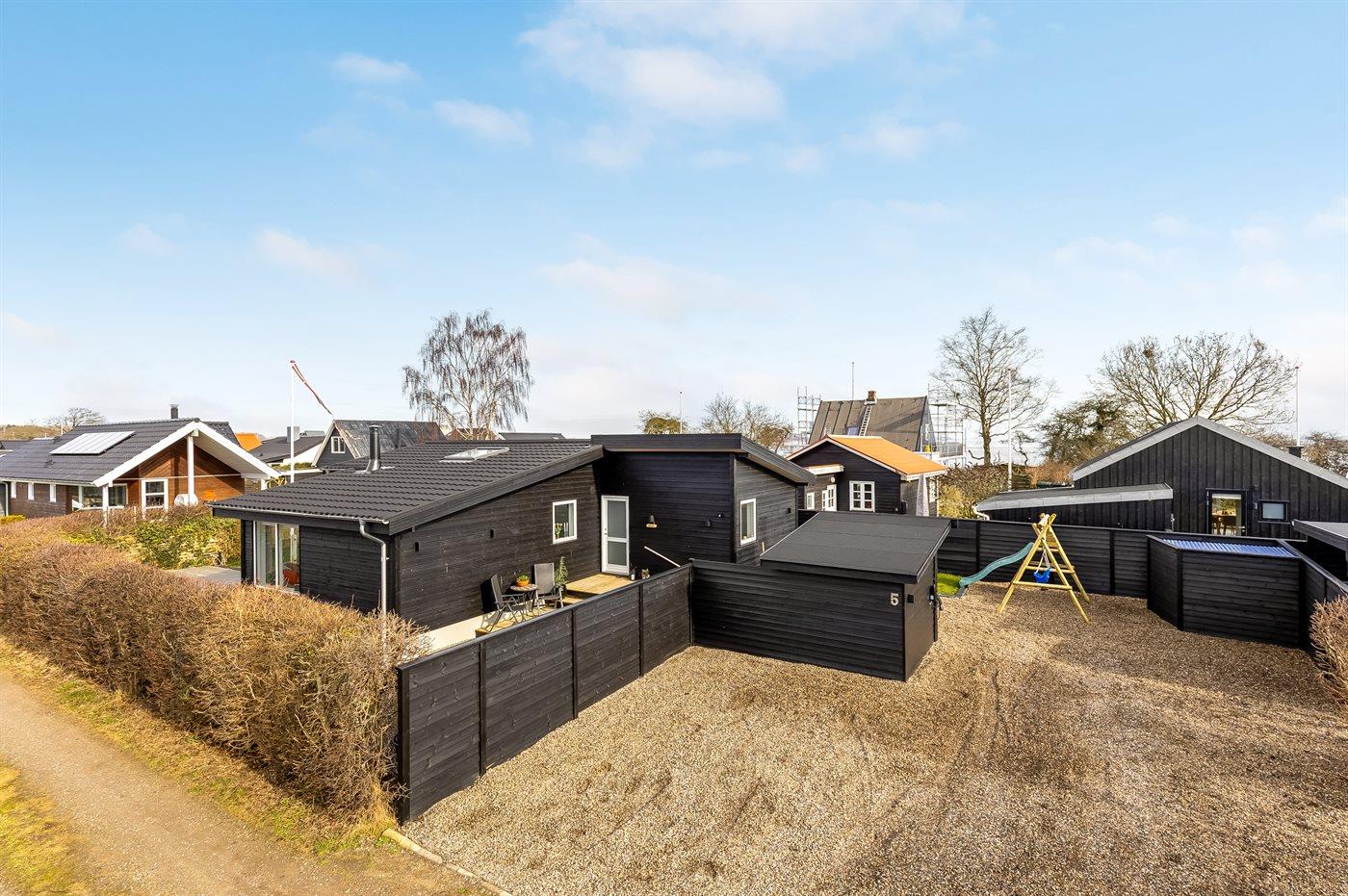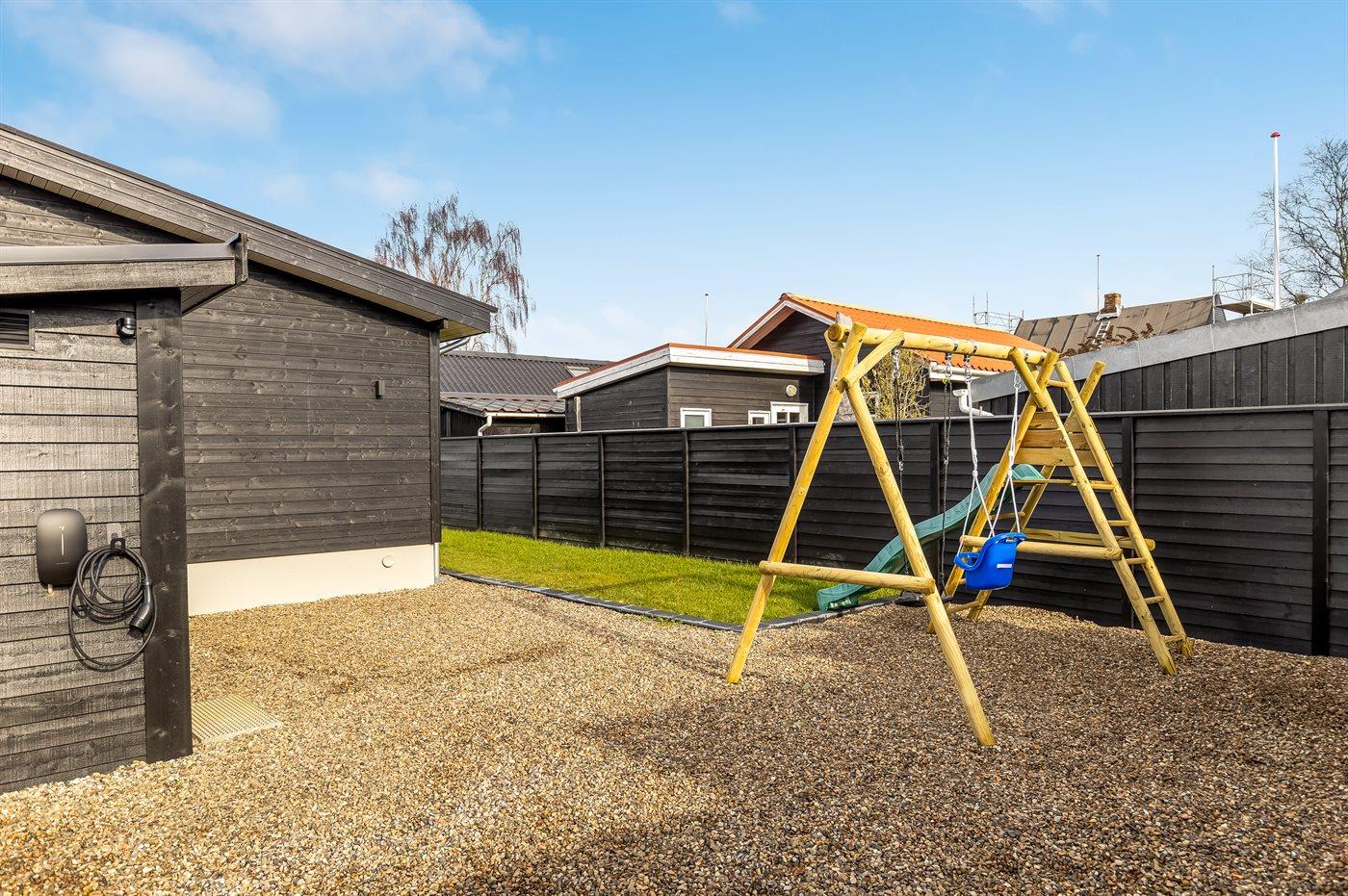 Modern vakantiehuis in Denemarken op 50 m van zee met luxe voorzieningen en speeltoestellen voor kinderen.